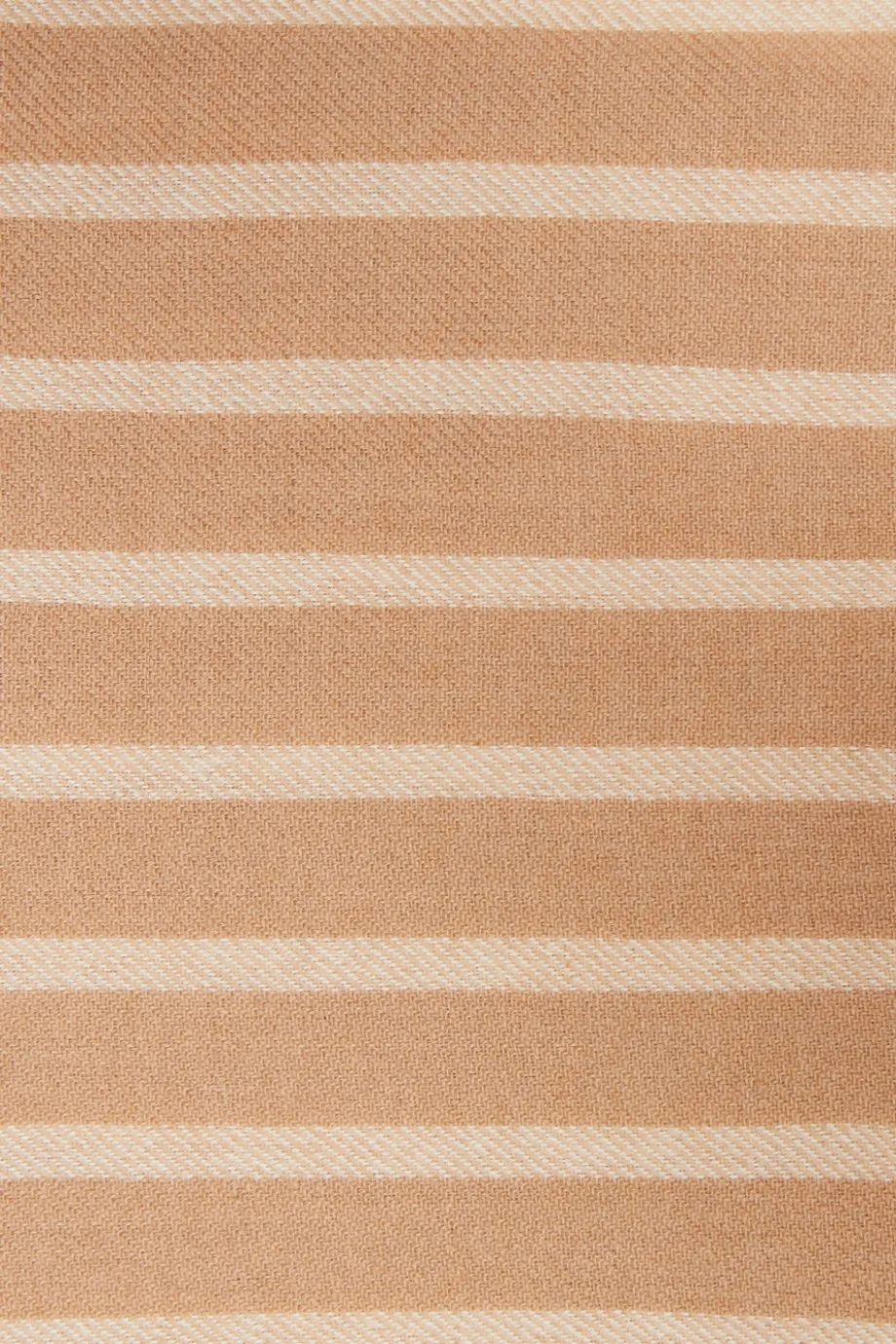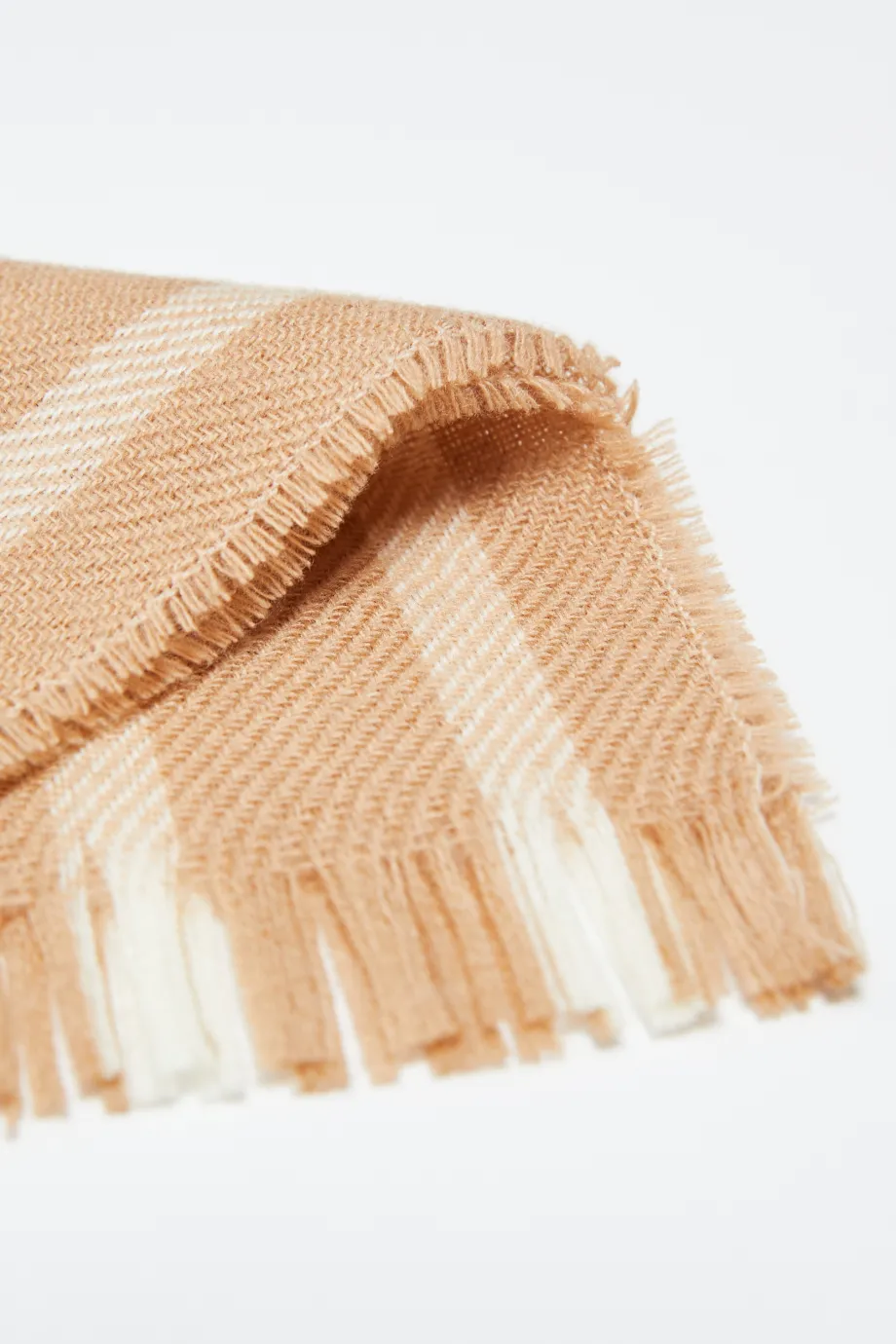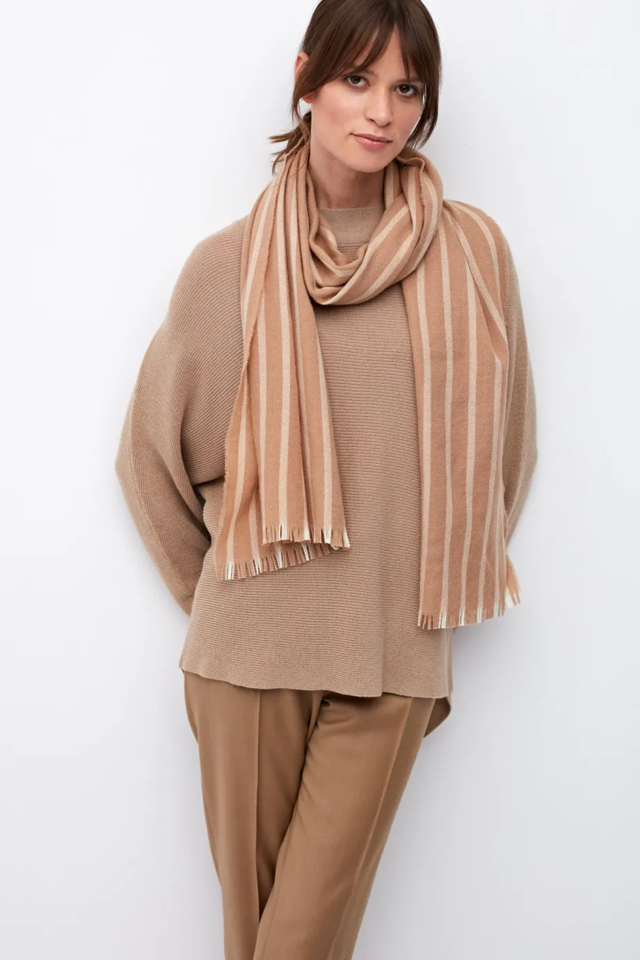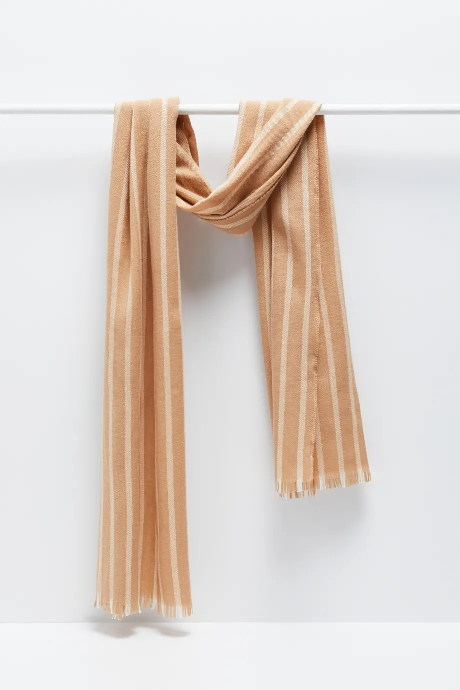 To, co czyni nasz wełniany szalik naprawdę wyjątkowym to mieszanka szlachetnych dzianin wełny i kaszmiru. Zmysłowe odcienie ciepłego brązu tworzą wzór w paski, który jest równie subtelny, co wyrafinowany, umożliwiając łatwe łączenie go z wieloma elementami garderoby - zarówno w codziennym, jak i wieczorowym stylu. Długość i szerokość naszego camelowego szala zostały zaprojektowane tak, abyś mogła nosić go na różne sposoby - czy to lekko owinięty wokół szyi, czy elegancko drapowany na ramionach - zawsze będzie wyglądał stylowo i szykownie.