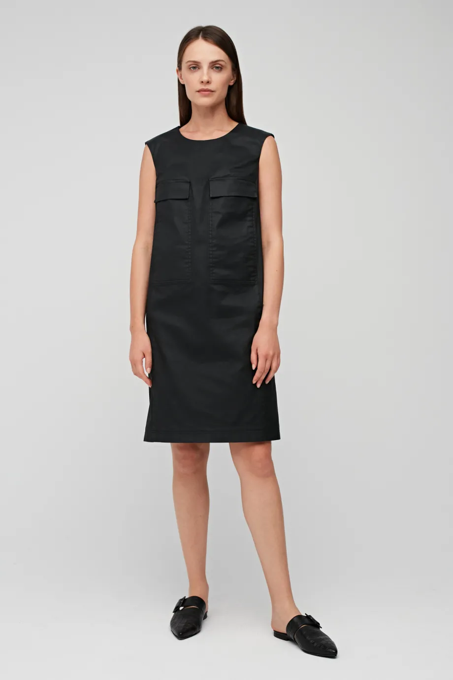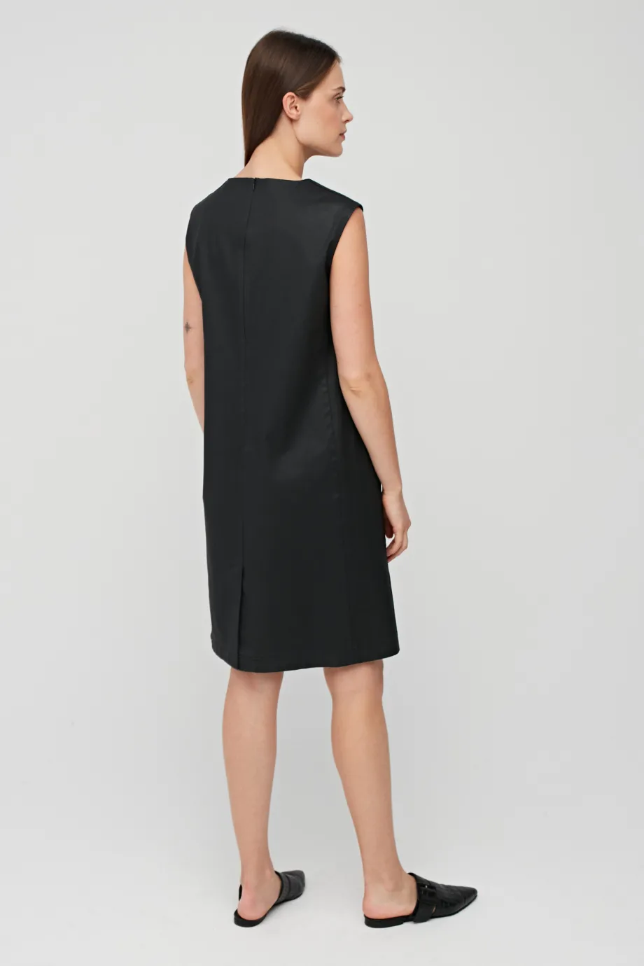 Mała czarna sukienka tuba z suwakiem z tyłu i kieszeniami