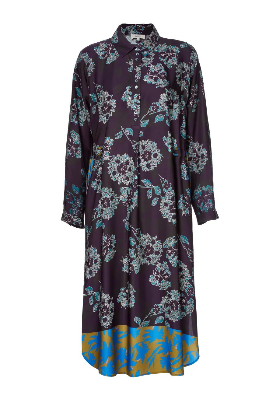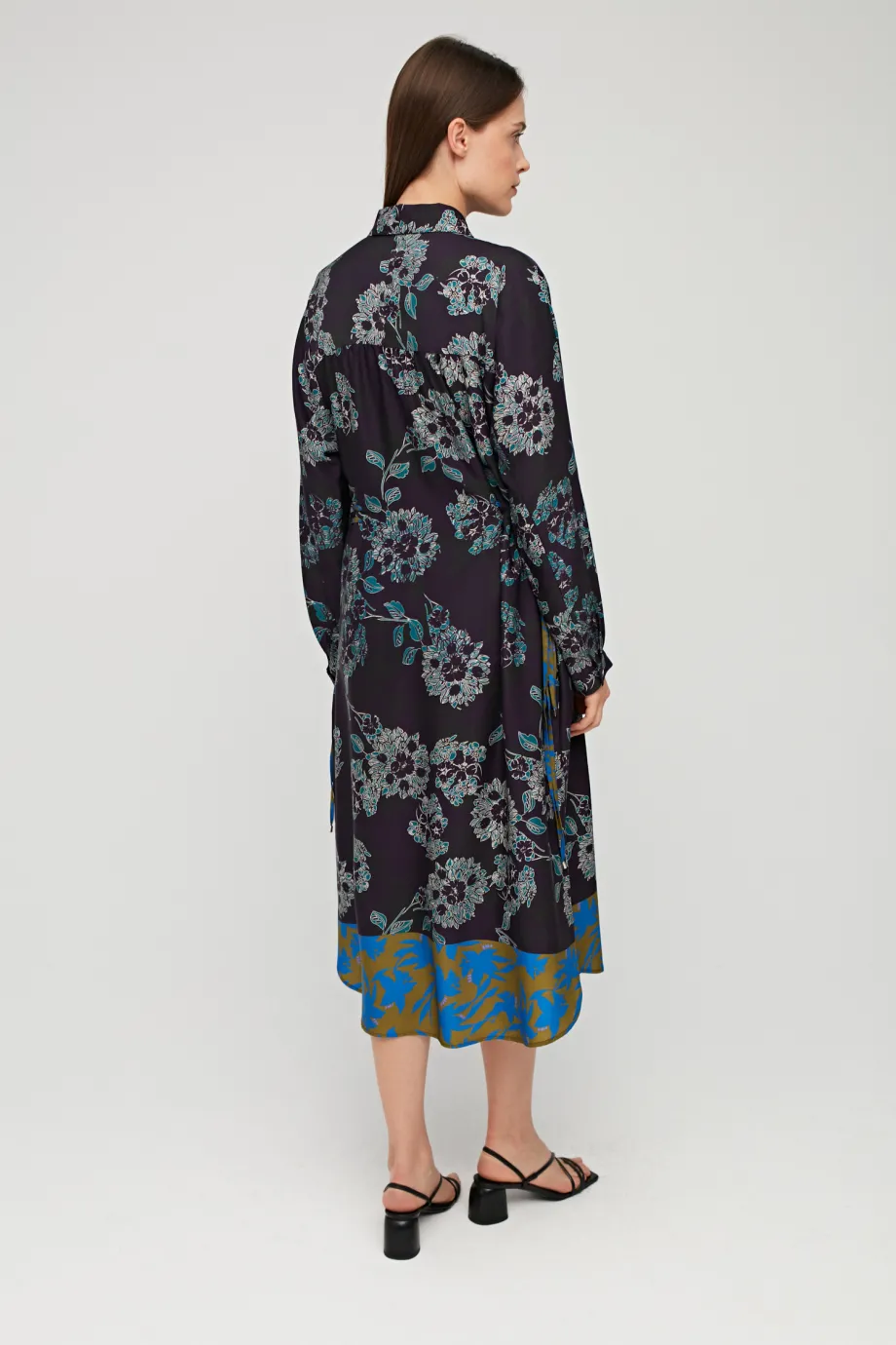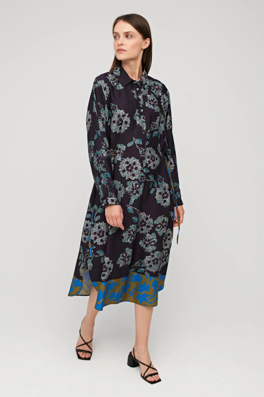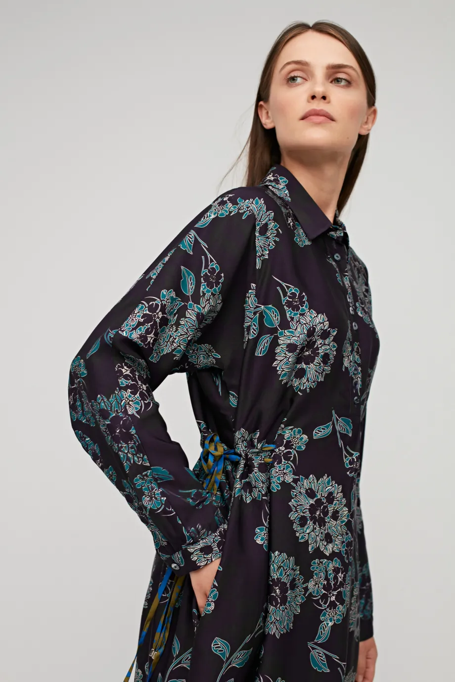 Na uwagę zasługuje także nieoczywisty dół sukienki wyróżniający się wyrazistymi, mocnymi kolorami, do których nawiązuje także pasek regulujący talię. Całość harmonijnie współgra z kwiatowym motywem, tworząc niebanalną wersję czarnej luźnej sukienki midi.