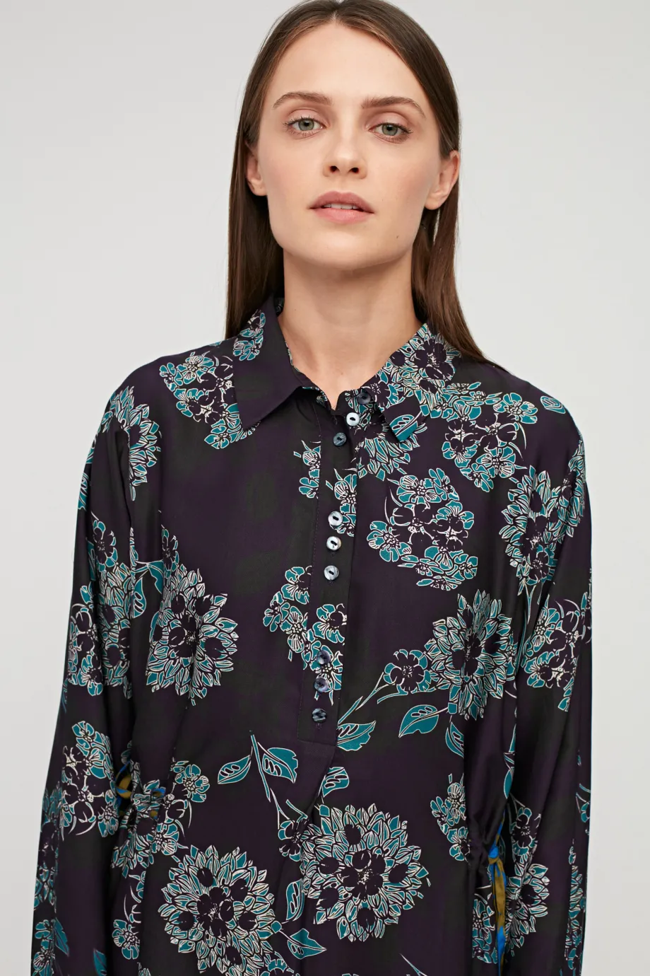 Nasza czarna sukienka midi z długim rękawem łączy w sobie elegancką czerń z zachwycającym kwiatowym printem, który nie umknie niezauważony. Koszulowa sukienka z wiskozy z kołnierzem prezentuje się niezwykle szykownie, co podkreślają dodatkowo rękawy z mankietem. Zastosowana przez nas luźna forma tuby idealnie układa się na sylwetce, a regulacja w talii pozwala na subtelne podkreślenie każdej figury.