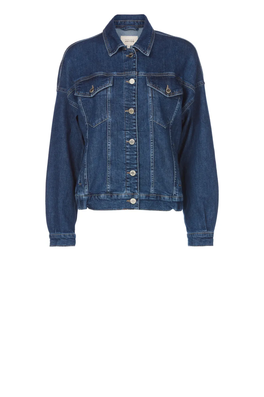 Kurtka jeansowa Patrizia Aryton posiada prostą i luźną formę. Wyposażono ją w cztery kieszenie - dwie z patkami na wysokości biustu i dwie wsuwane w talii. Typowe dla tego rodzaju okrycia są kołnierzyk i zapięcie na guziki. Natomiast rękawy o obniżonej linii wszycia, wykończenie dołu ściągaczem oraz pionowe przeszycia na plecach to jej znaki szczególne, które dodają wizualnej lekkości i dziewczęcego wdzięku.