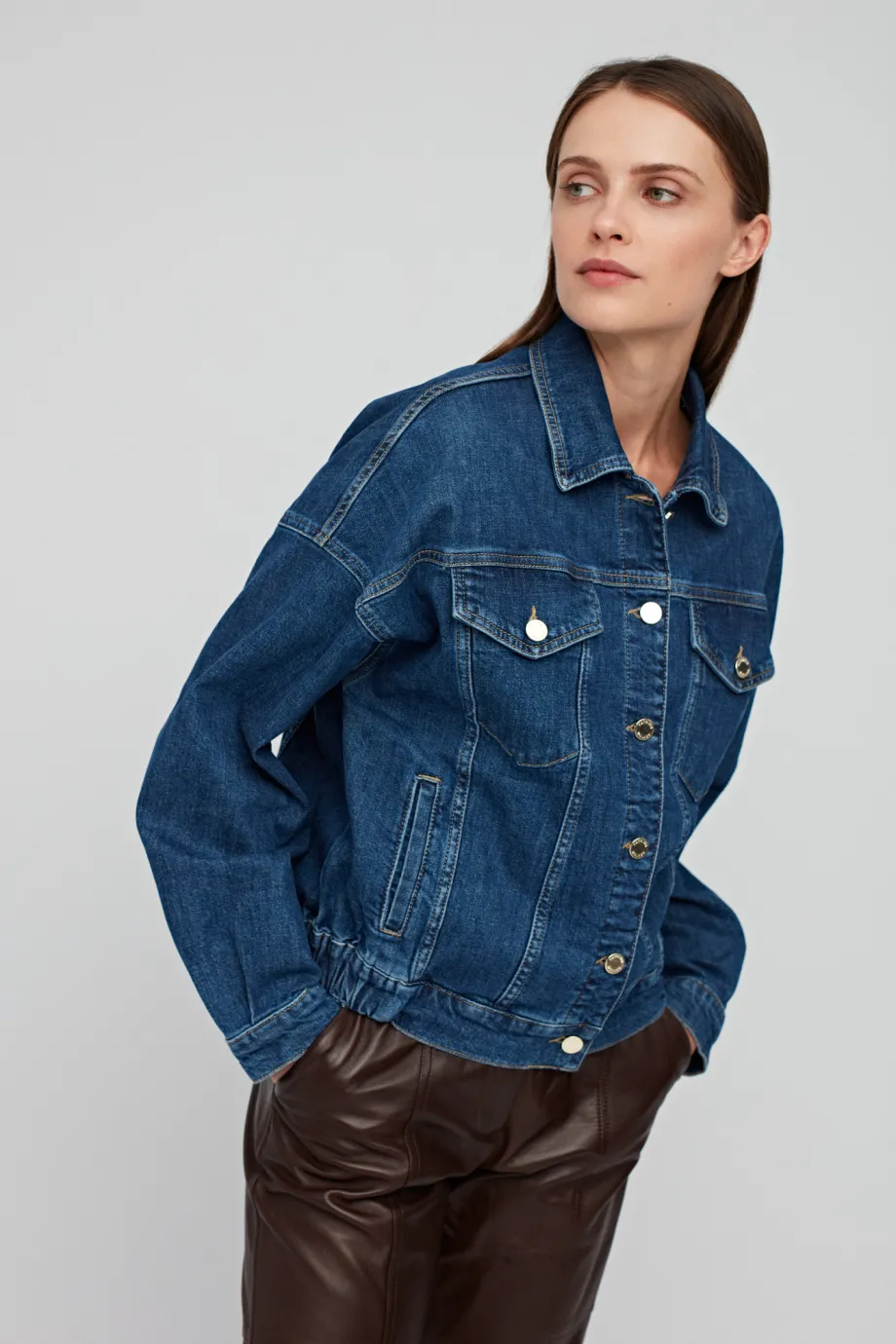 Nasza jeansowa kurtka ma odcień ciemnego denimu, pasującego do każdego innego koloru. Świetnie sprawdza się jako góra do jeansowych total looków, narzuta na letnią sukienkę czy okrycie w weekendowych outfitach. Jesienią można ją dodatkowo docieplić pikowaną kamizelką, a zimą traktować jako koszulę, na którą zarzucimy wełniany płaszcz.