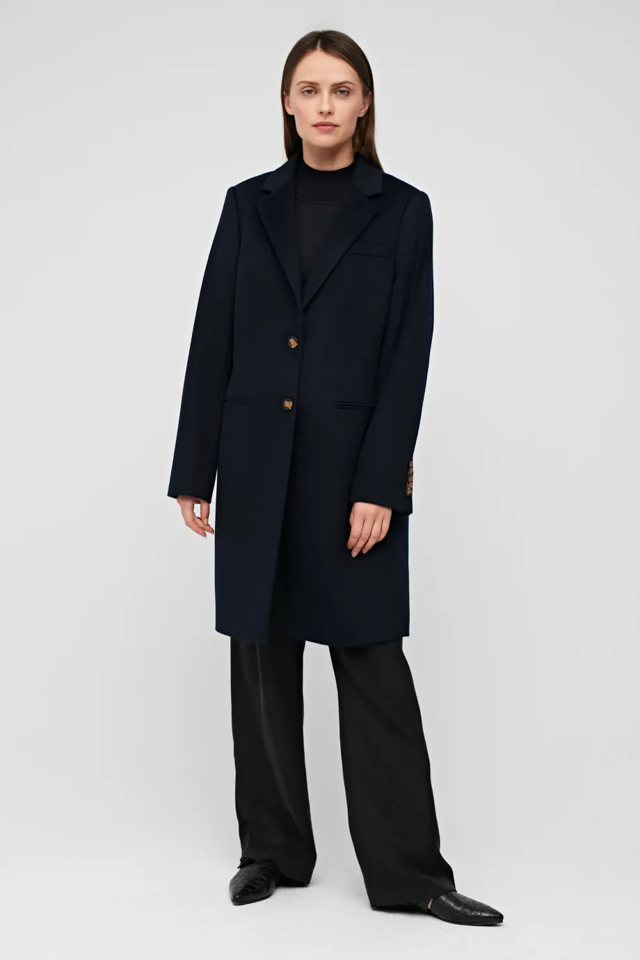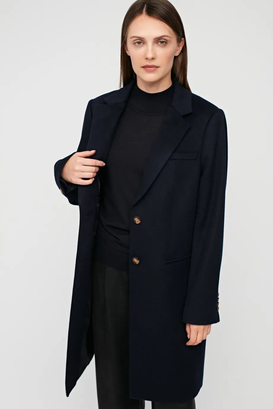 Płaszcz dyplomatka w kolorze atramentowego granatu pasuje do ubrań we wszystkich odcieniach. Minimalistyczny, prosty fason jest odpowiedni dla kobiet o każdym typie sylwetki. Dzięki długości do kolan okrycie jest niezwykle praktyczne i nadaje się do noszenia zarówno późnym latem, chłodną jesienią, mroźną zimą, jak i rześką wiosną.