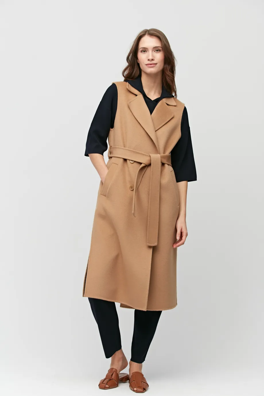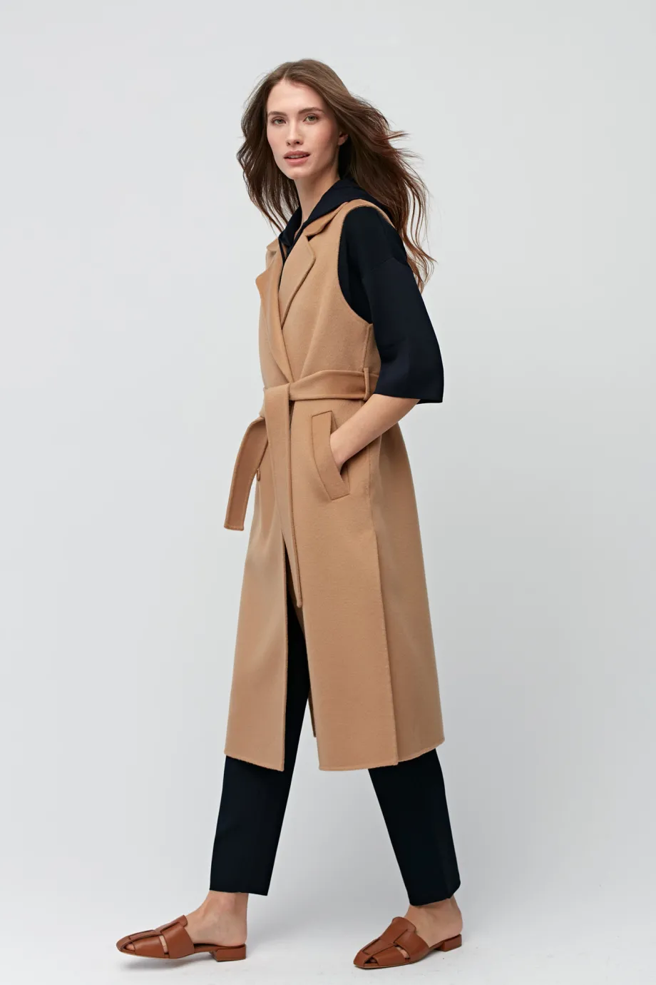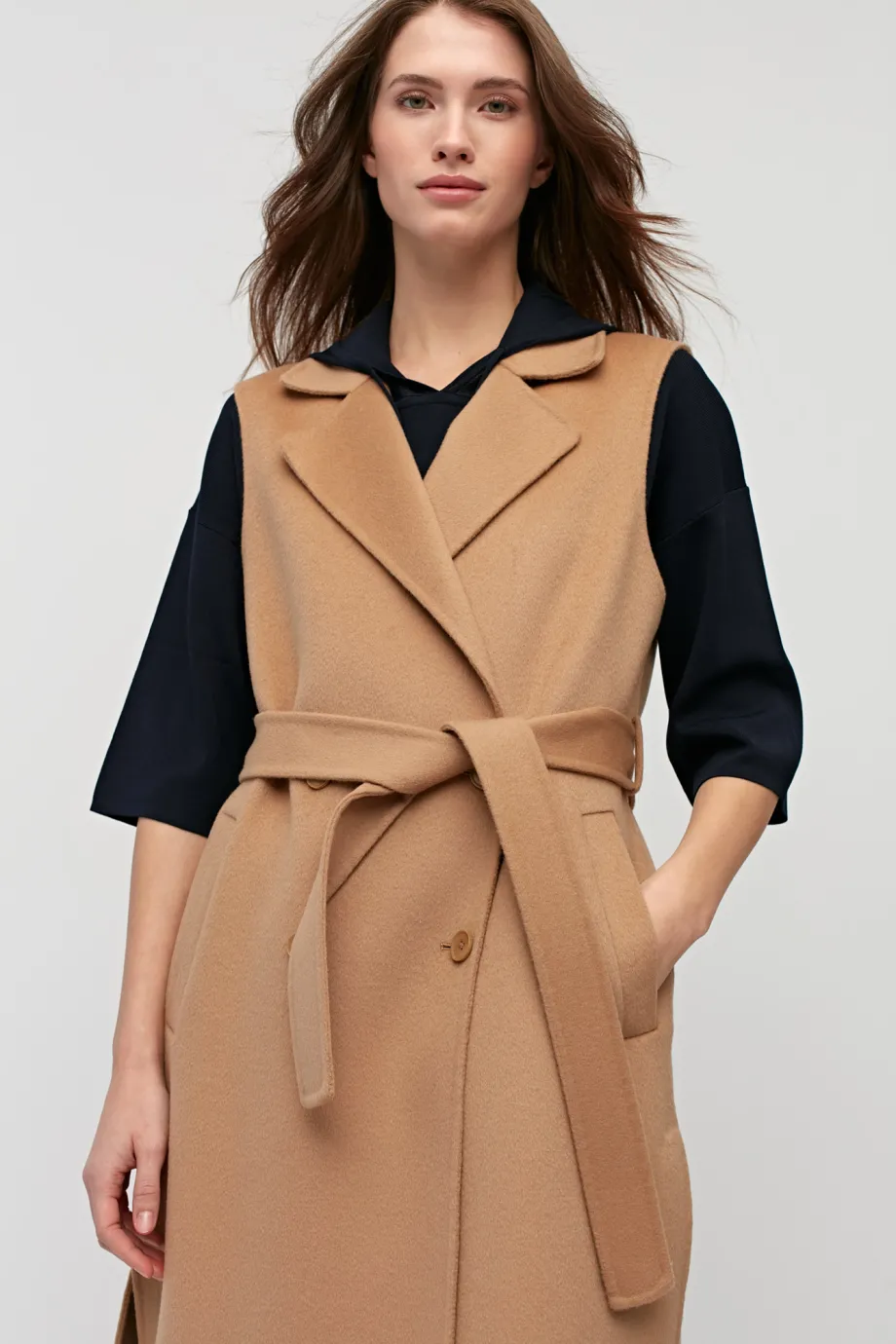 Długa wełniana kamizelka w kolorze camel została w 100% wykonana z najwyższej jakości wełny doubleface. Fason dwurzędowy posiada pasek i boczne kieszenie, co zapewnia maksymalną wygodę. Możesz ją nosić na różne sposoby - zestawiając zarówno z eleganckimi cygaretkami, jak i dzianinową, sportową bluzą z naszej kolekcji. Długa kamizelka zapewni Ci komfort i ciepło, wybierz nasz model i przekonaj się sama!