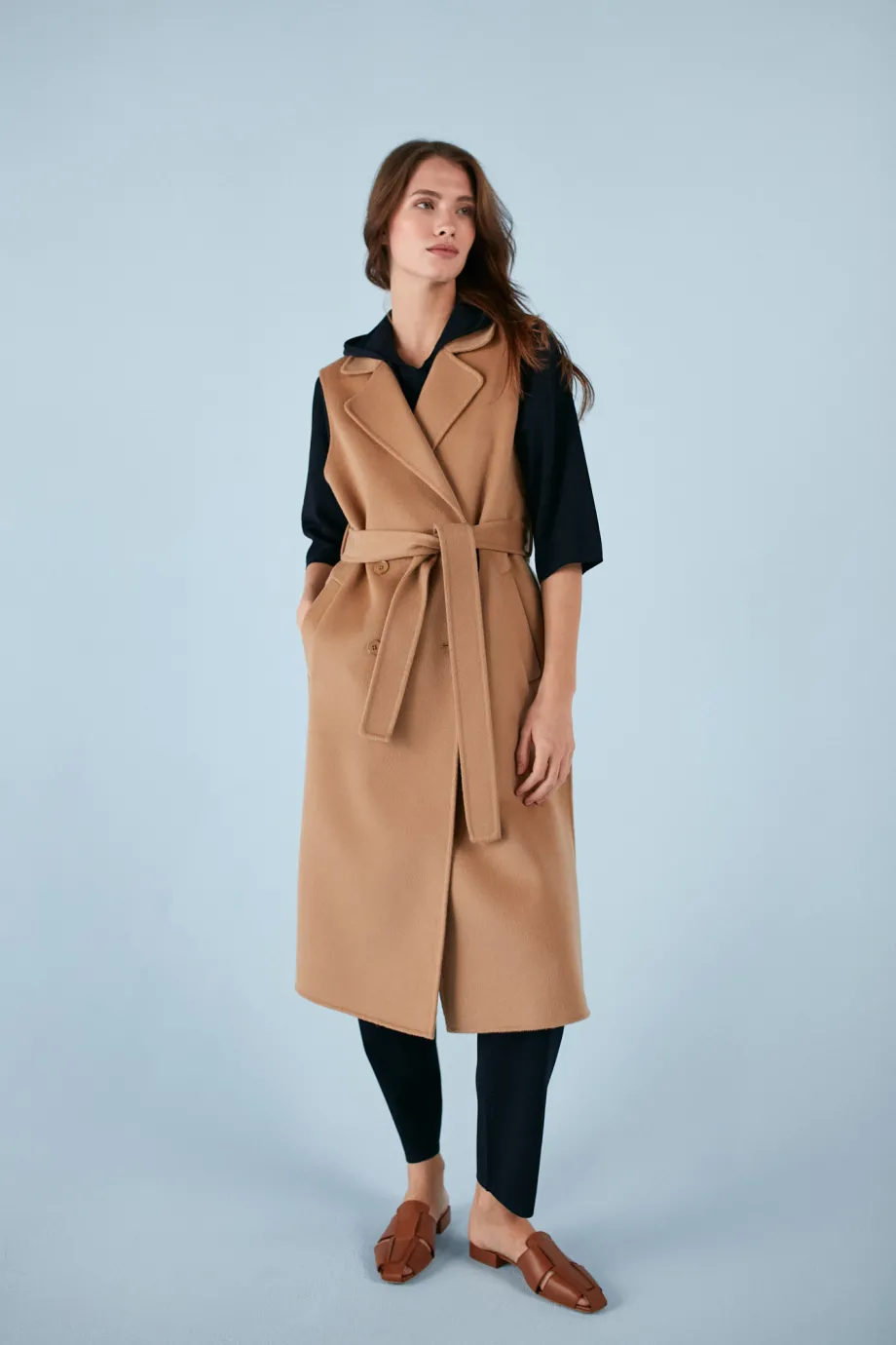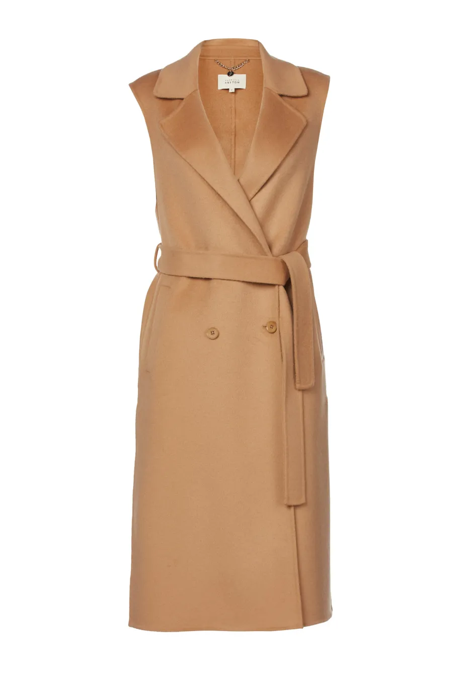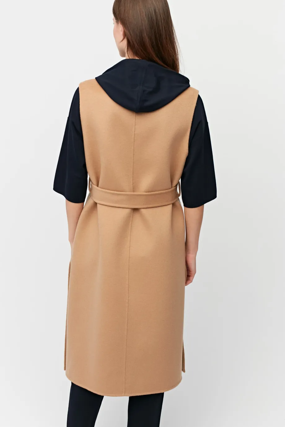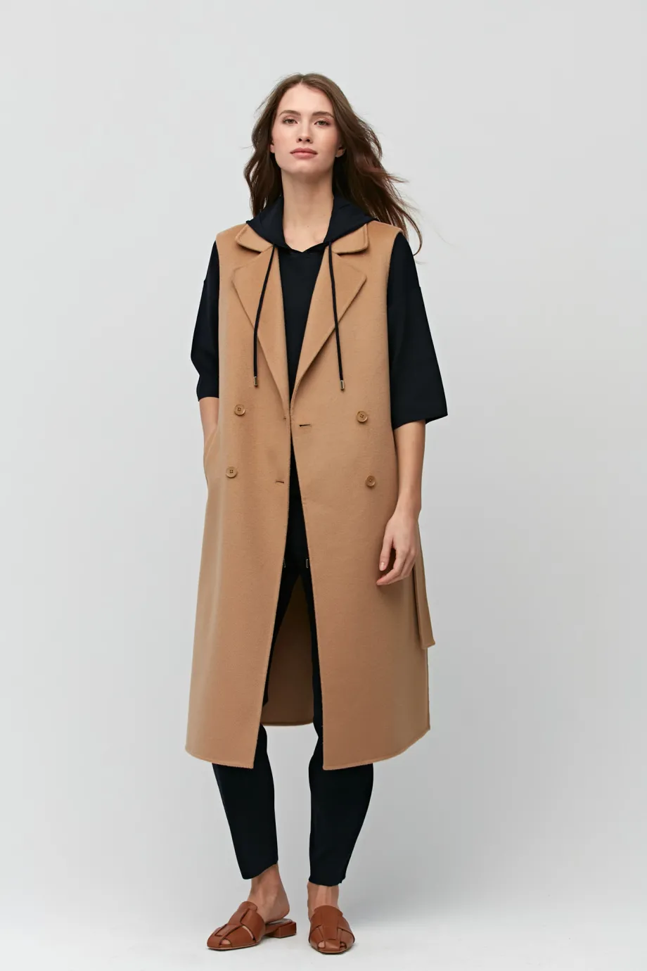 Długa wełniana kamizelka w kolorze camel została w 100% wykonana z najwyższej jakości wełny doubleface. Fason dwurzędowy posiada pasek i boczne kieszenie, co zapewnia maksymalną wygodę. Możesz ją nosić na różne sposoby - zestawiając zarówno z eleganckimi cygaretkami, jak i dzianinową, sportową bluzą z naszej kolekcji. Długa kamizelka zapewni Ci komfort i ciepło, wybierz nasz model i przekonaj się sama!
