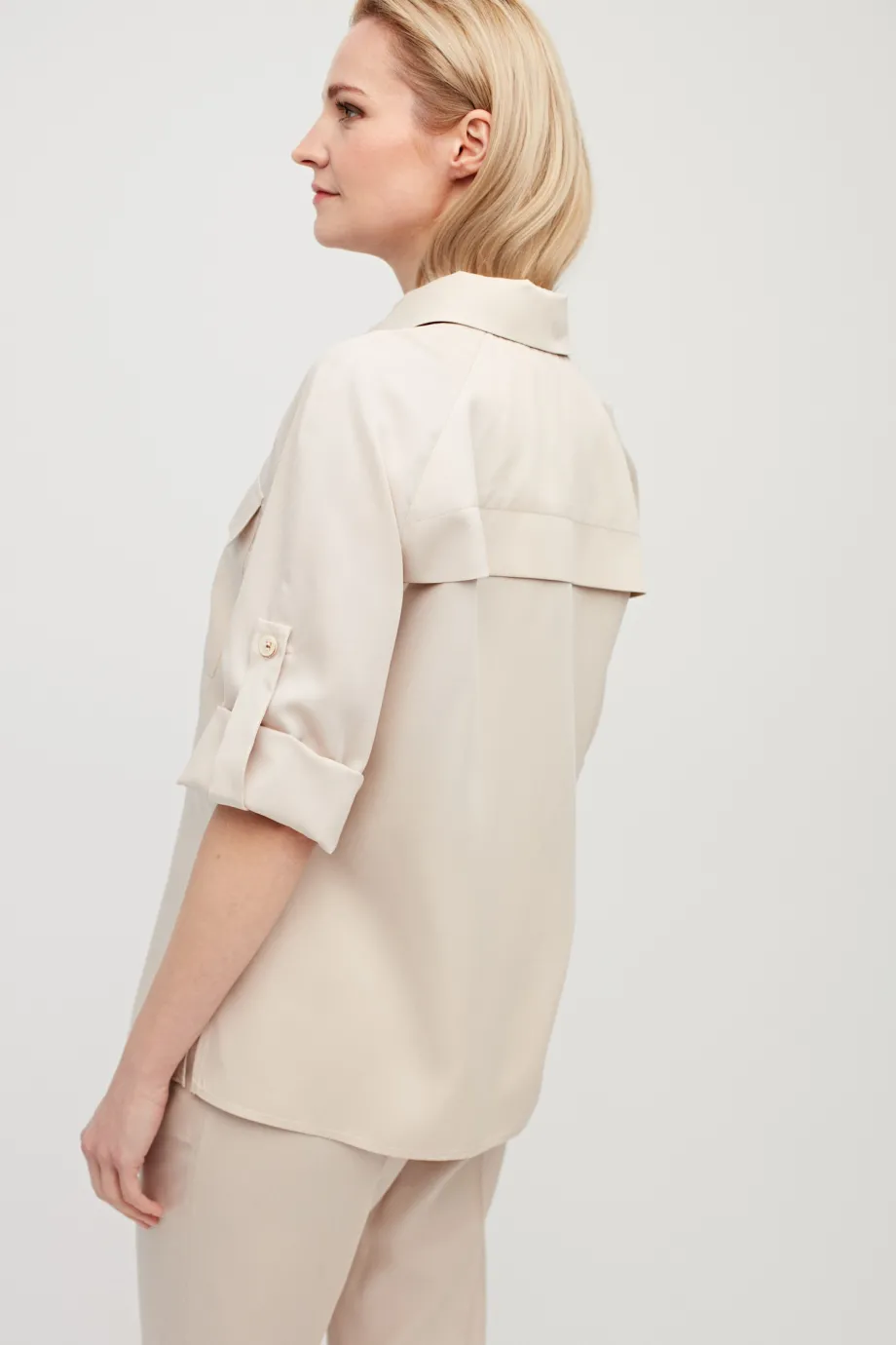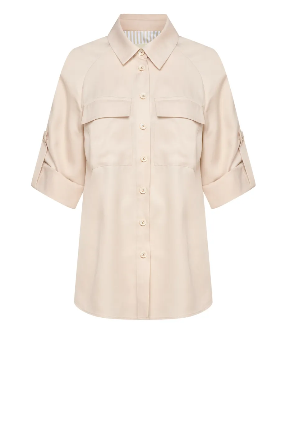 Koszula z kieszeniami Patrizia Aryton ma barwę jasnego, świetlistego beżu, który fantastycznie łączy się z czernią, bielą, granatem czy wszelkimi innymi odcieniami beżu. Doskonale współgra także z hitowymi w tym sezonie taupe, amarantem, błękitem, czerwienią i kobaltem.