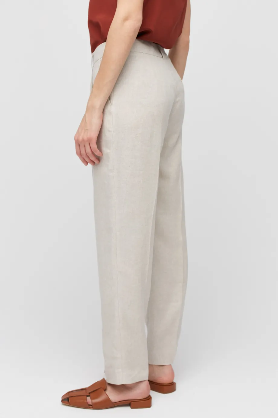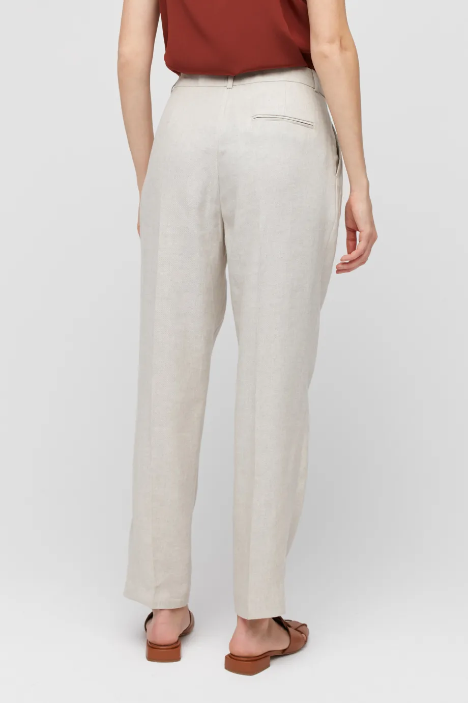 Z pewnością polubisz damskie spodnie z zakładkami! Fason naszych beżowych lnianych spodni został przemyślany tak, by delikatnie modelować sylwetkę, akcentując kobiece kształty, a jednocześnie gwarantując swobodę ruchów i wygodę noszenia przez cały dzień. Kryty zamek i praktyczne kieszenie dodają funkcjonalności, jednak nie zaburzają przy tym minimalistycznej estetyki, dzięki czemu spodnie te doskonale odnajdą się zarówno w eleganckich, formalnych zestawieniach z marynarką, jak i w bardziej swobodnych, codziennych stylizacjach, np. z luźniejszym topem czy swetrem.