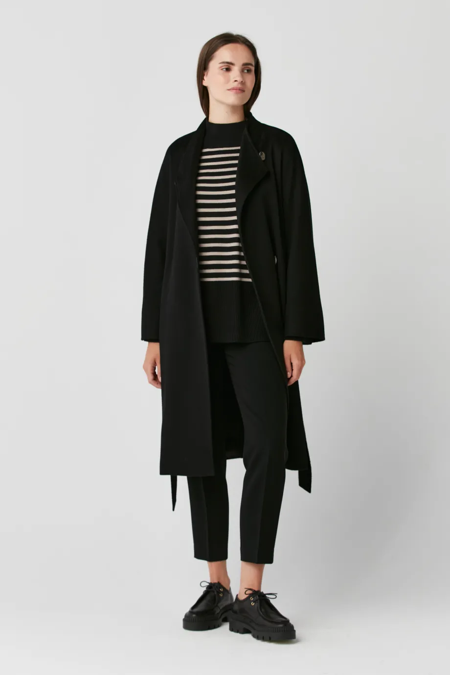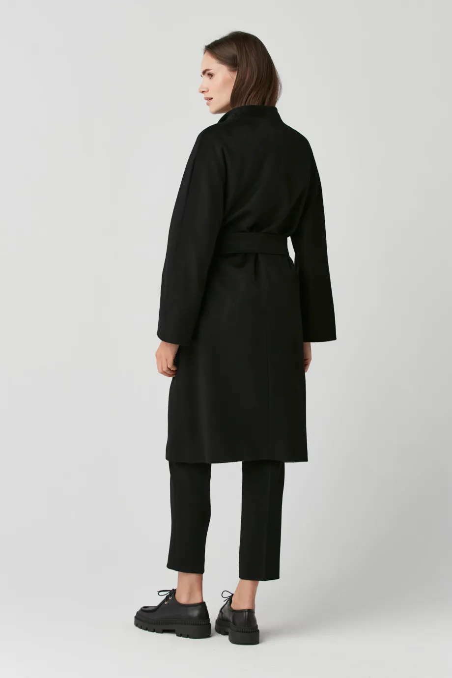 Czarny płaszcz z paskiem i szerokimi rękawami
