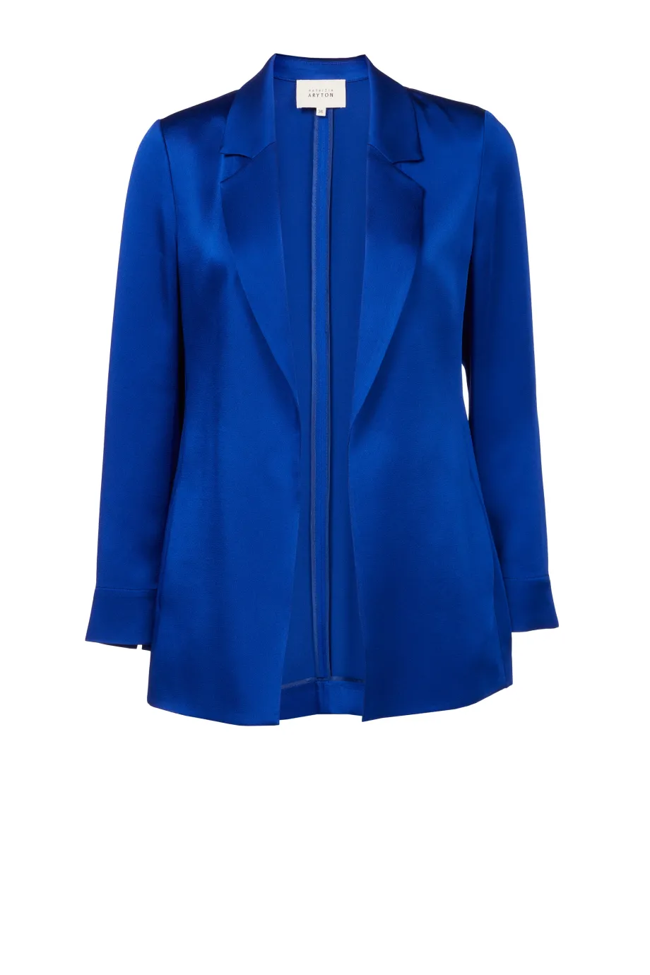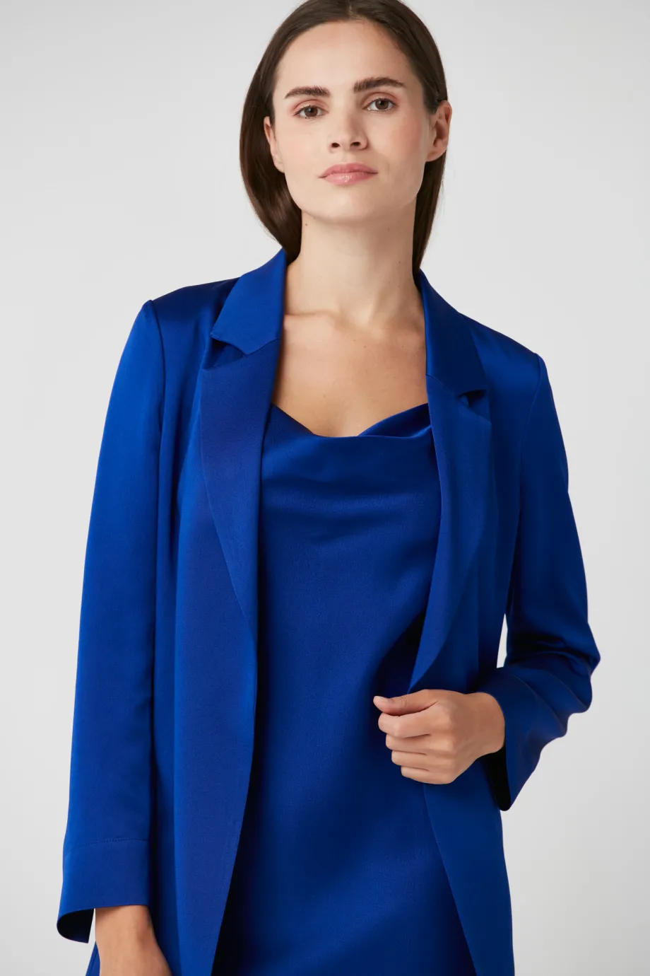 Kolor kobaltowy w stylizacjach biznesowych pomaga osiągnąć efekt power dressing, za to w koktajlowych jest synonimem ekskluzywności, wyrafinowania i wyrazistego wizerunku. Nasz lśniący niezapinany żakiet w tym odcieniu prezentuje się szczególnie luksusowo w zestawieniu z sukienkami lub topami na ramiączkach. Odkryj jego potencjał w tworzeniu najbardziej wysmakowanych i najmodniejszych wieczorowych zestawów.