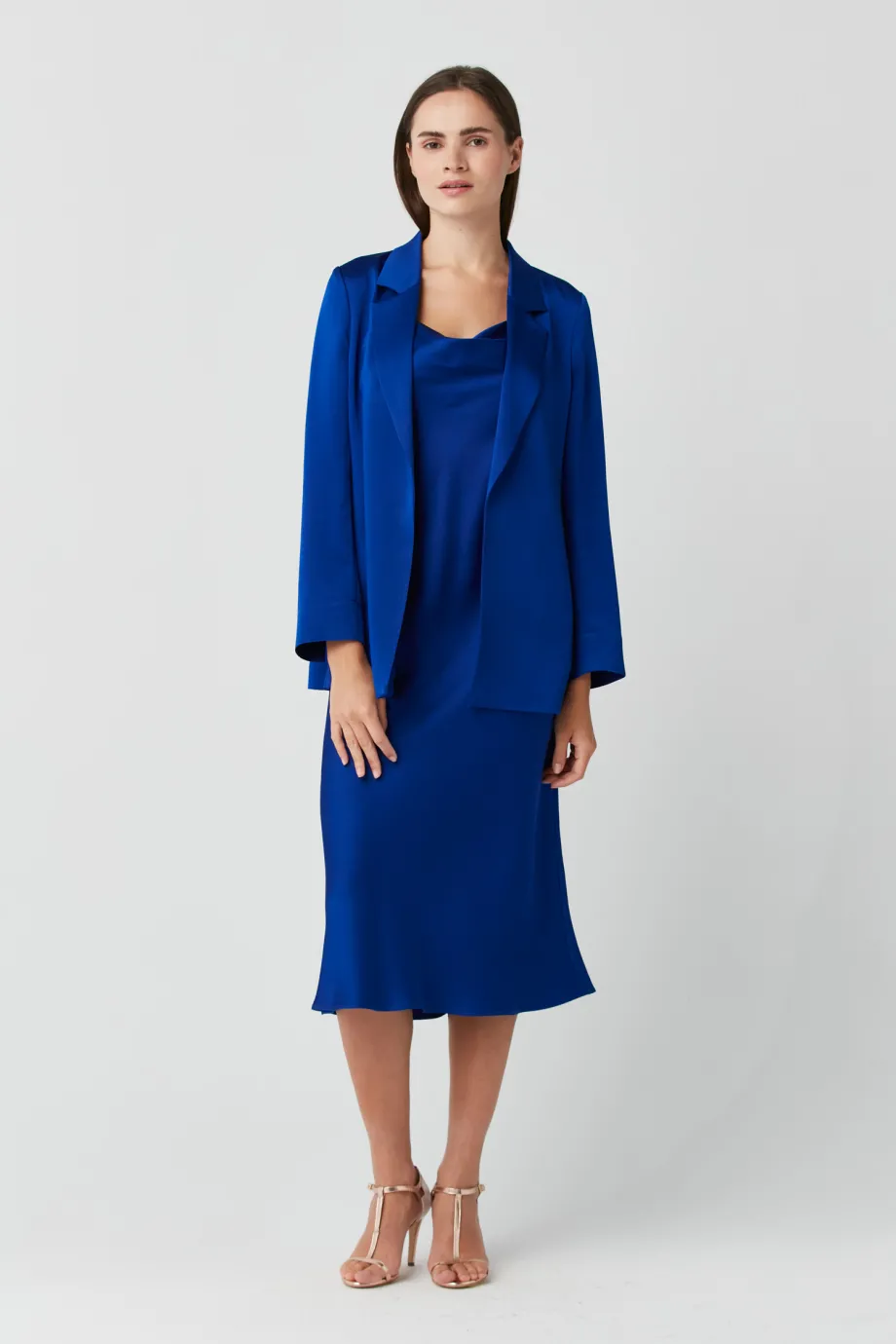 Elegancki żakiet na wesele zestaw z sukienką na regulowanych ramiączkach w tym samym odcieniu i z tkaniny o tym samym składzie. Wykorzystuj go też np. do jednolitych kolorystycznie stylizacji z długą spódnicą i gładką bluzką czy cygaretkami i jedwabnym topem na ramiączkach. Kobalt kapitalnie prezentuje się w kontekście camelu, czerni, śmietany, taupe i złota.