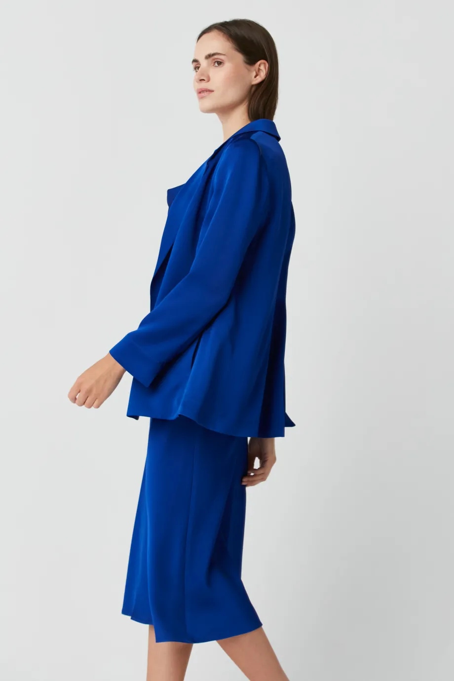 Ten niebieski żakiet do sukienki powstał z myślą o kompromisie pomiędzy tradycyjnym, dobrze pozycjonującym żakietem a luźną narzutką, której materiał opływa ciało. Model posiada więc cechy jednego i drugiego. Długie rękawy typu wstawianego, klasyczny fason i kołnierz to elementy charakterystyczne dla marynarek. Z kolei zmysłowość i leistość subtelnie połyskującej tkaniny kojarzy się z delikatnymi jedwabnymi szalami i bolerkami.