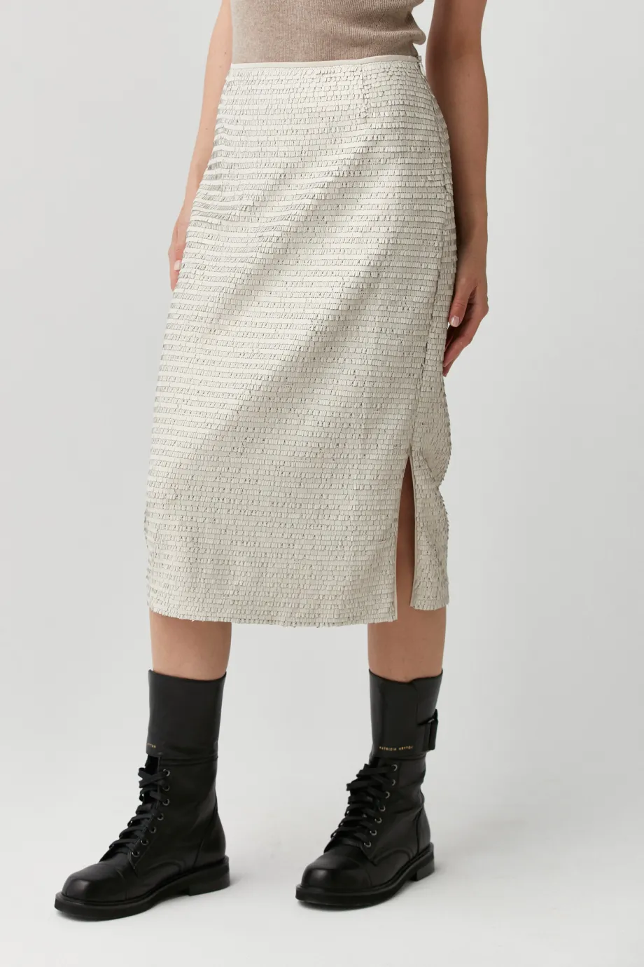Beżowa spódnica midi z rozcięciem i cekinami to połączenie klasyki i nowoczesności, które wzmocnią Twoją pewność siebie. Model o długości midi podkreśla sylwetkę i dodaje elegancji, a ozdobne rozcięcie nadaje lekkości oraz wygody podczas noszenia. Dobierz do niej bluzkę z tej samej tkaniny i stwórz pełen blasku, niepowtarzalny look na wyjątkowe okazje. Po więcej inspiracji zajrzyj do naszych pozostałych kategorii.