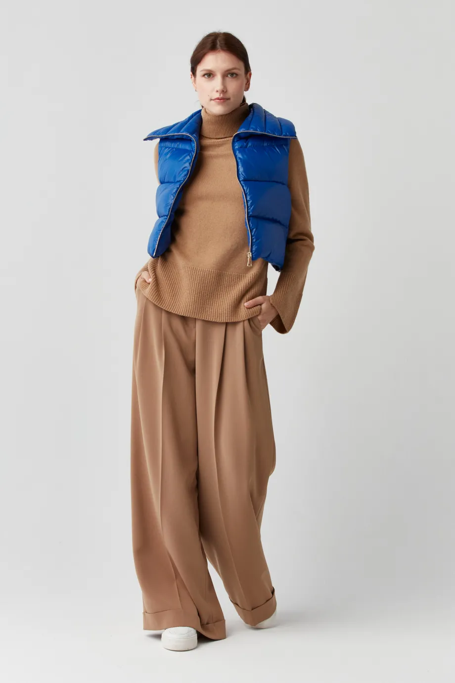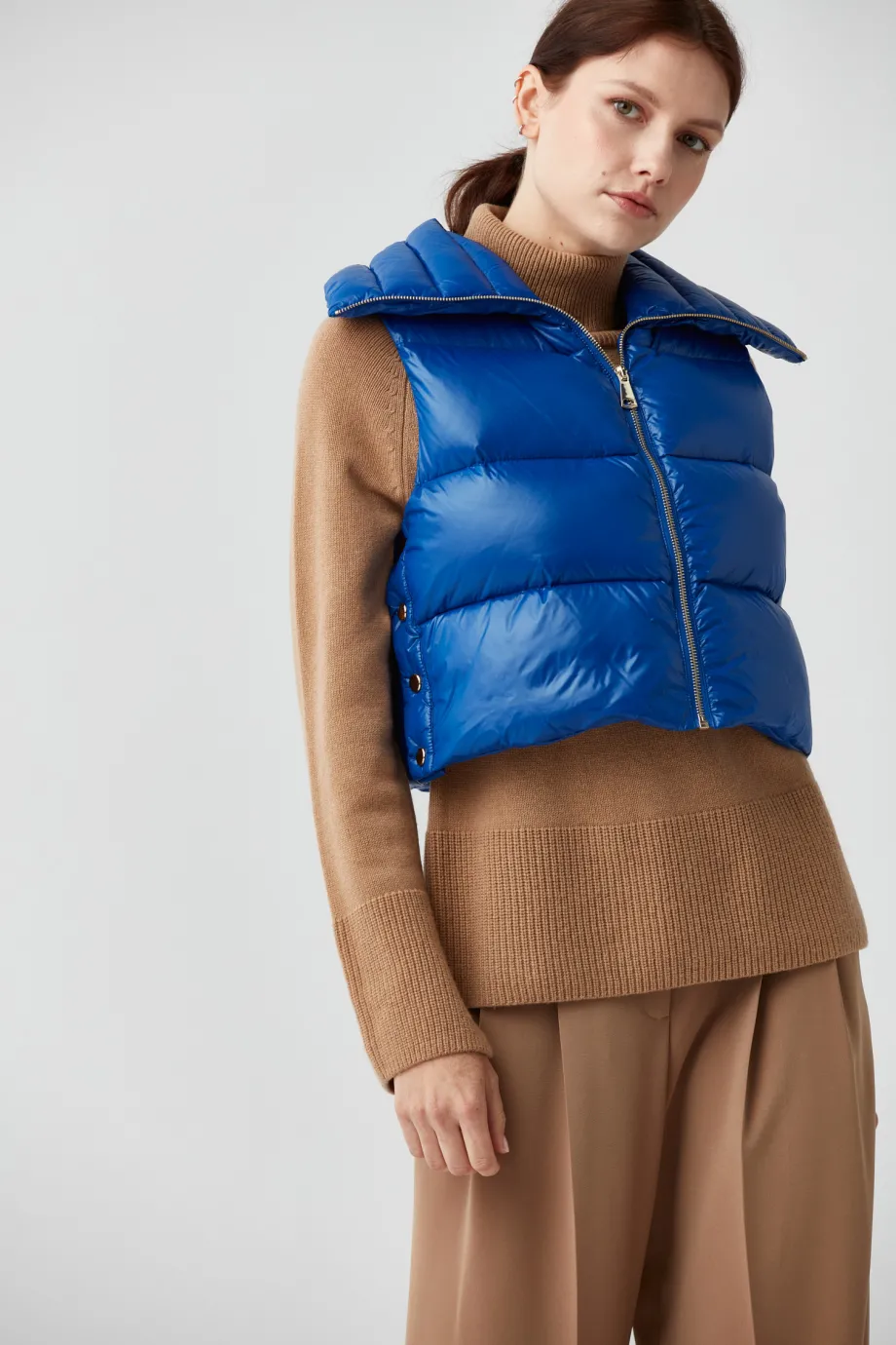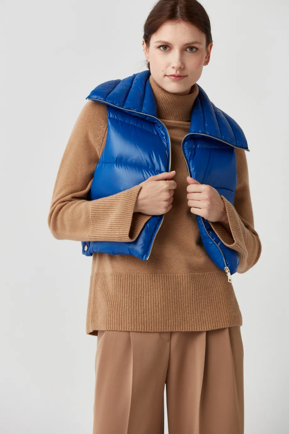 Boczne zapięcia na napy pozwalają na dokładne dopasowanie do proporcji ciała. Wysoka stójka na zamek po rozpięciu tworzy obszerny kołnierz łagodnie opadający na ramiona, ukazujący drobniejsze pikowane pasy. Kamizelka puchowa Patrizia Aryton doskonale wygląda też całkowicie rozpięta jako oryginalne uzupełnienie jesiennych i zimowych outfitów.