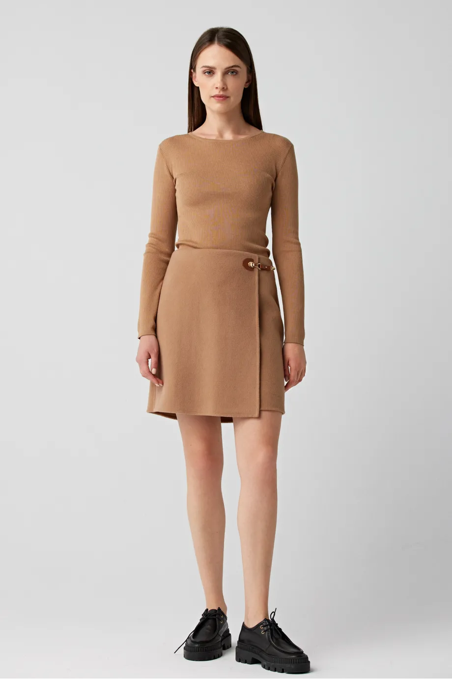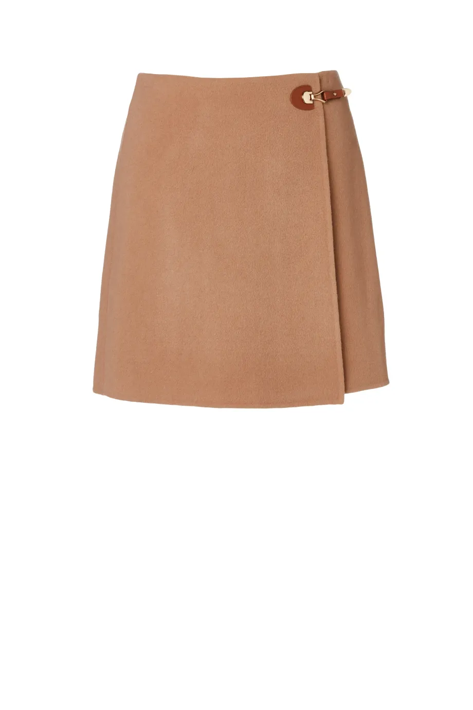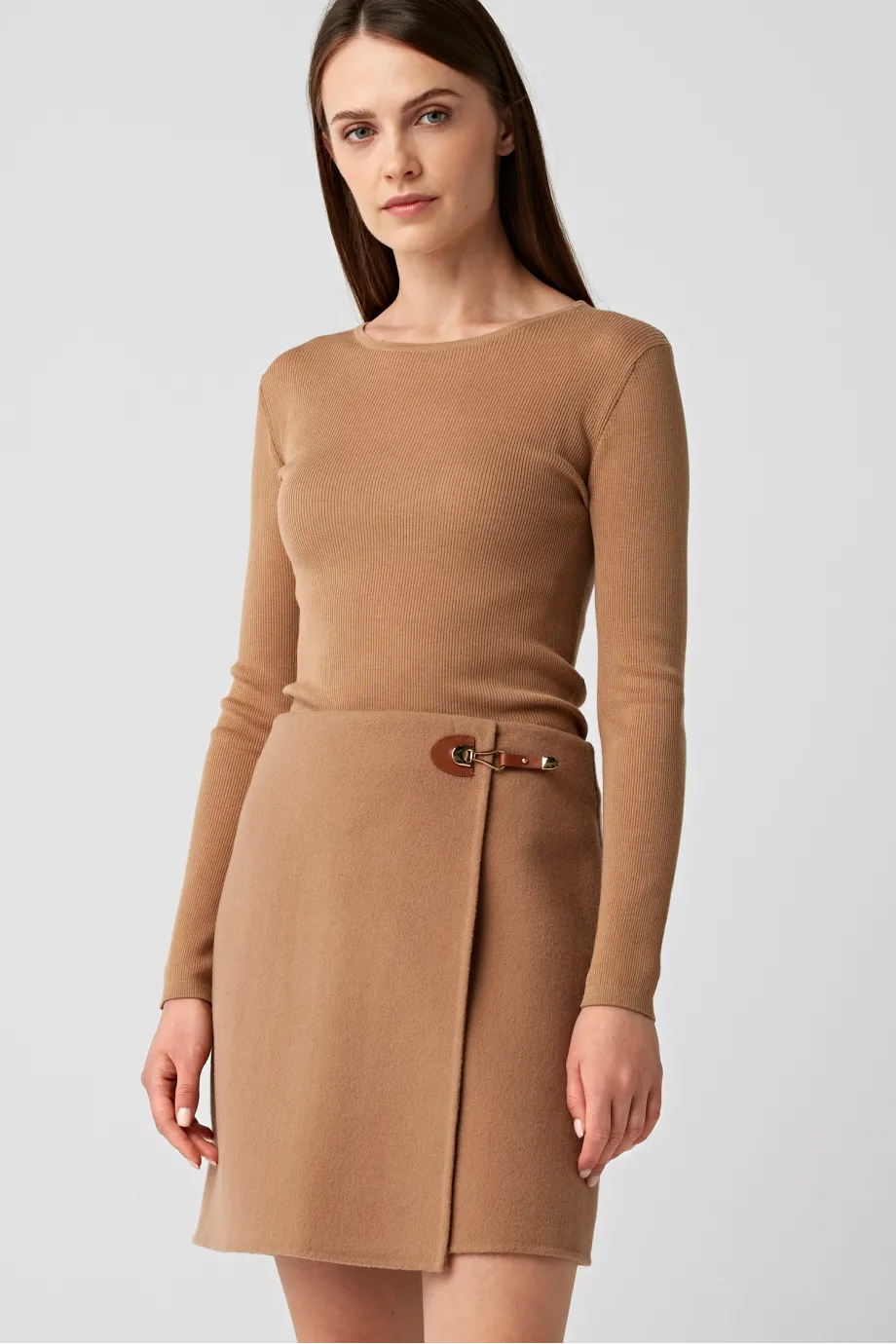 Camelowa spódnica łączy w sobie klasykę z nowoczesnym, minimalistycznym designem. Kopertowy fason z eleganckim zapięciem na klamrę wykonaną z połączenia skóry i metalu to niewielki detal, który nadaje produktowi szlachetnego wykończenia i luksusowego akcentu, a przy tym zapewnia idealne dopasowanie do sylwetki. Naturalne, ciepłe odcienie camel świetnie komponują się z szeroką gamą kolorów, co sprawia, że nasza mini spódnica może być noszona zarówno w zestawieniach biznesowych z elegancką koszulą, jak i casualowych np. z dzianinową bluzką w tym samym kolorze i sneakersami.