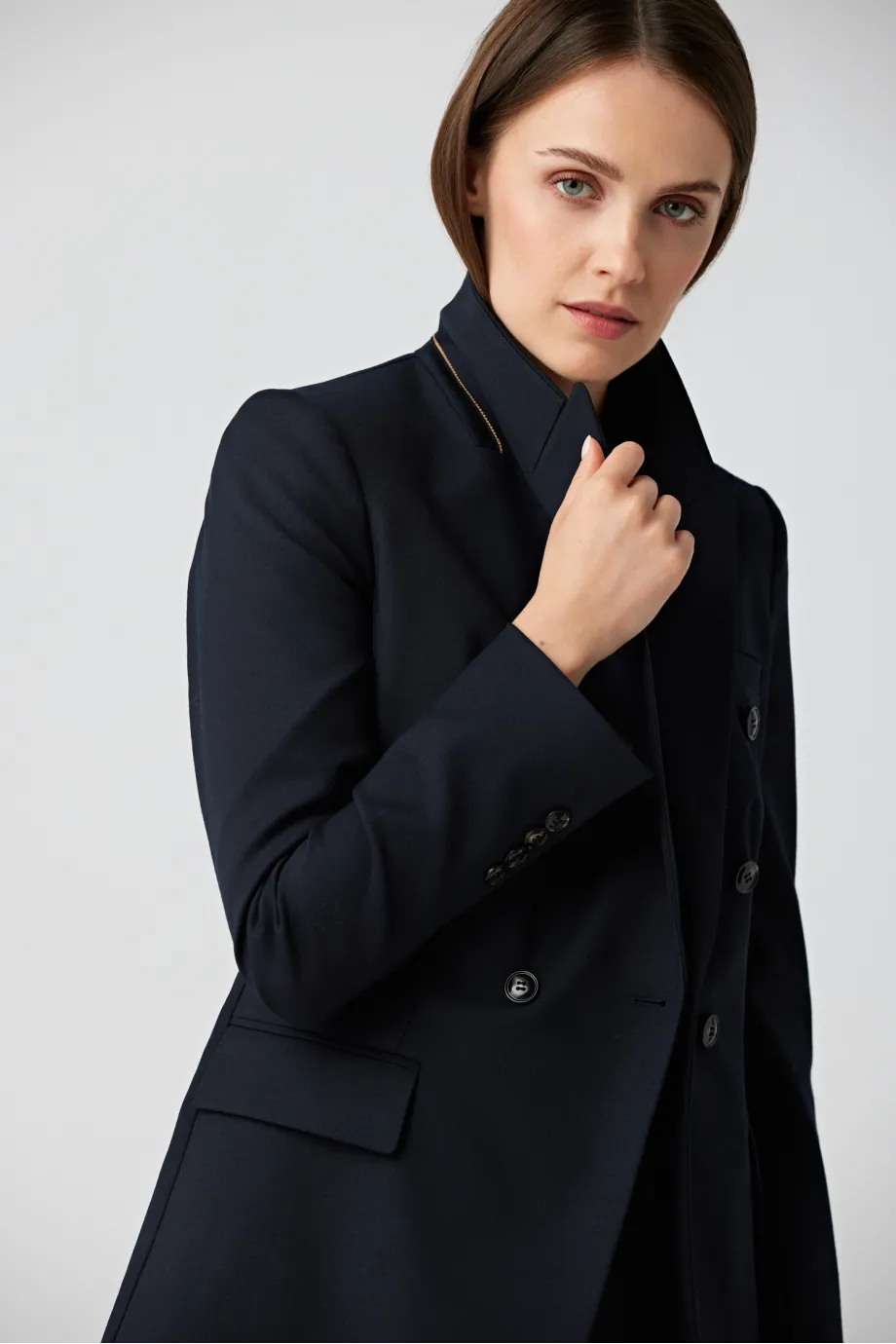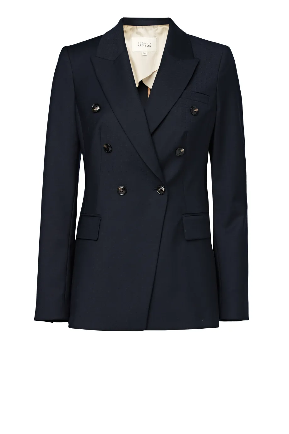 Wełniany żakiet damski Sophie swoim granatowym kolorem nawiązuje do ultramodnego stylu marynarskiego. Dodatkowy dekoracyjny akcent tworzą duże biało-granatowe guziki, które są jednym z motywów przewodnich najnowszych kolekcji Patrizia Aryton. Ozdobiono nimi także klasyczne długie rękawy.