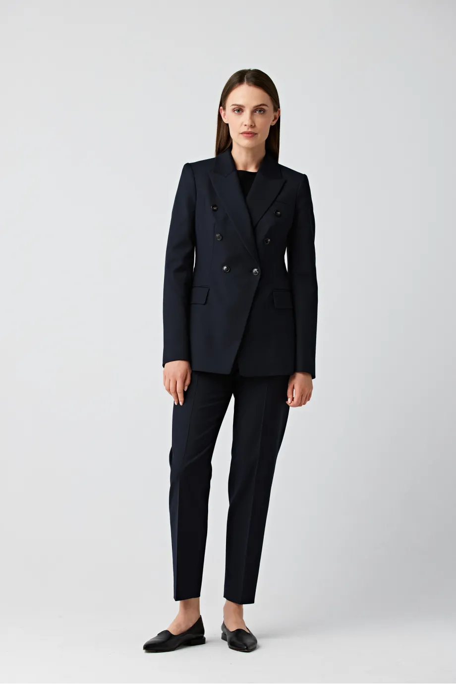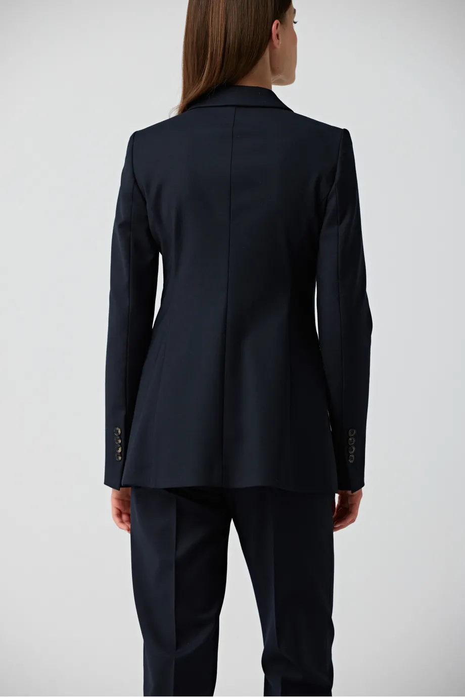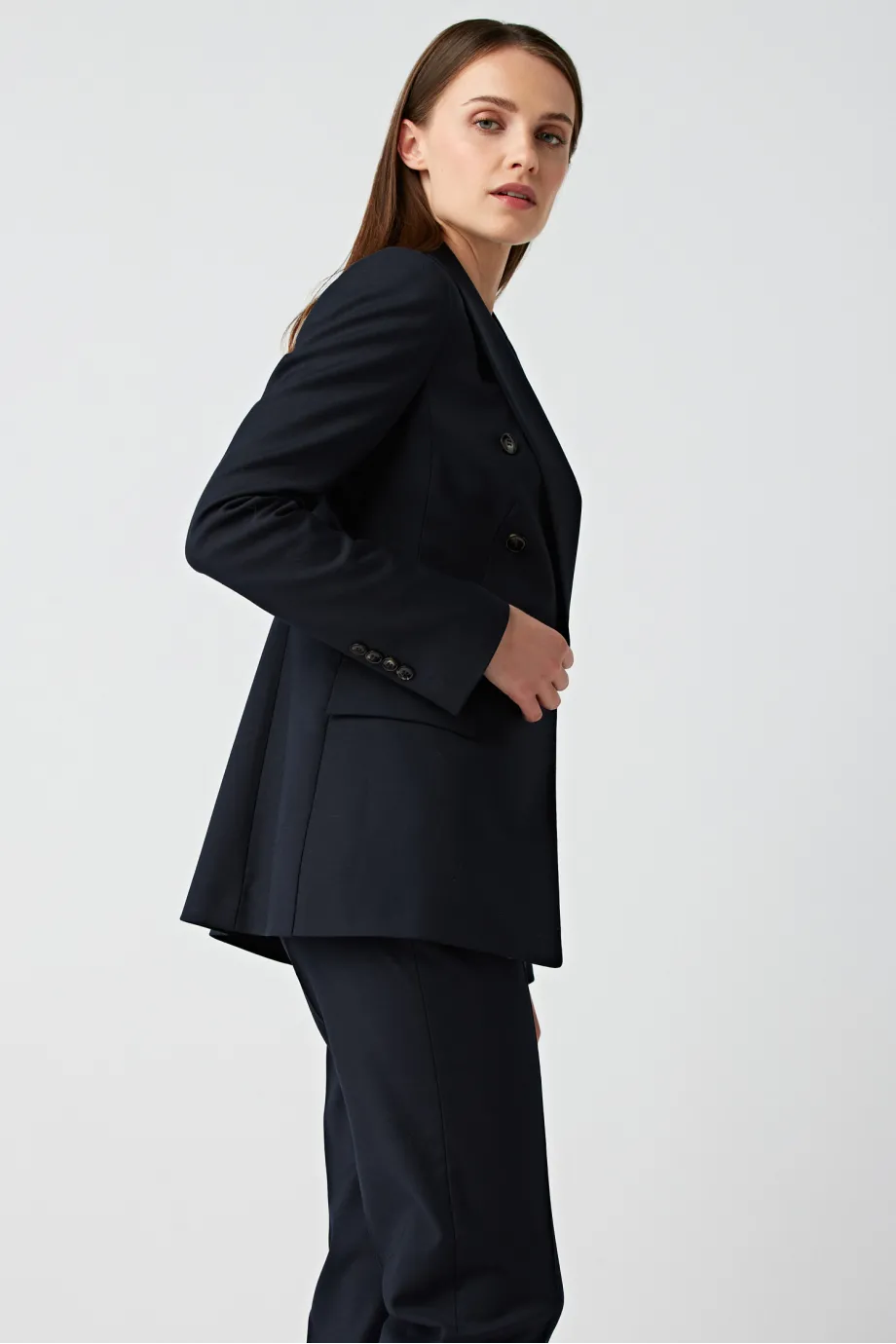 Lekko taliowany fason granatowego żakietu do garnituru podkreśla atuty figury i doskonale prezentuje się na każdym typie sylwetki. Dwurzędowe zapinanie nadaje żakietowi Sophie mocno wyrafinowanego charakteru, który zostaje subtelnie przełamany przez praktyczne kieszeni z klapką.