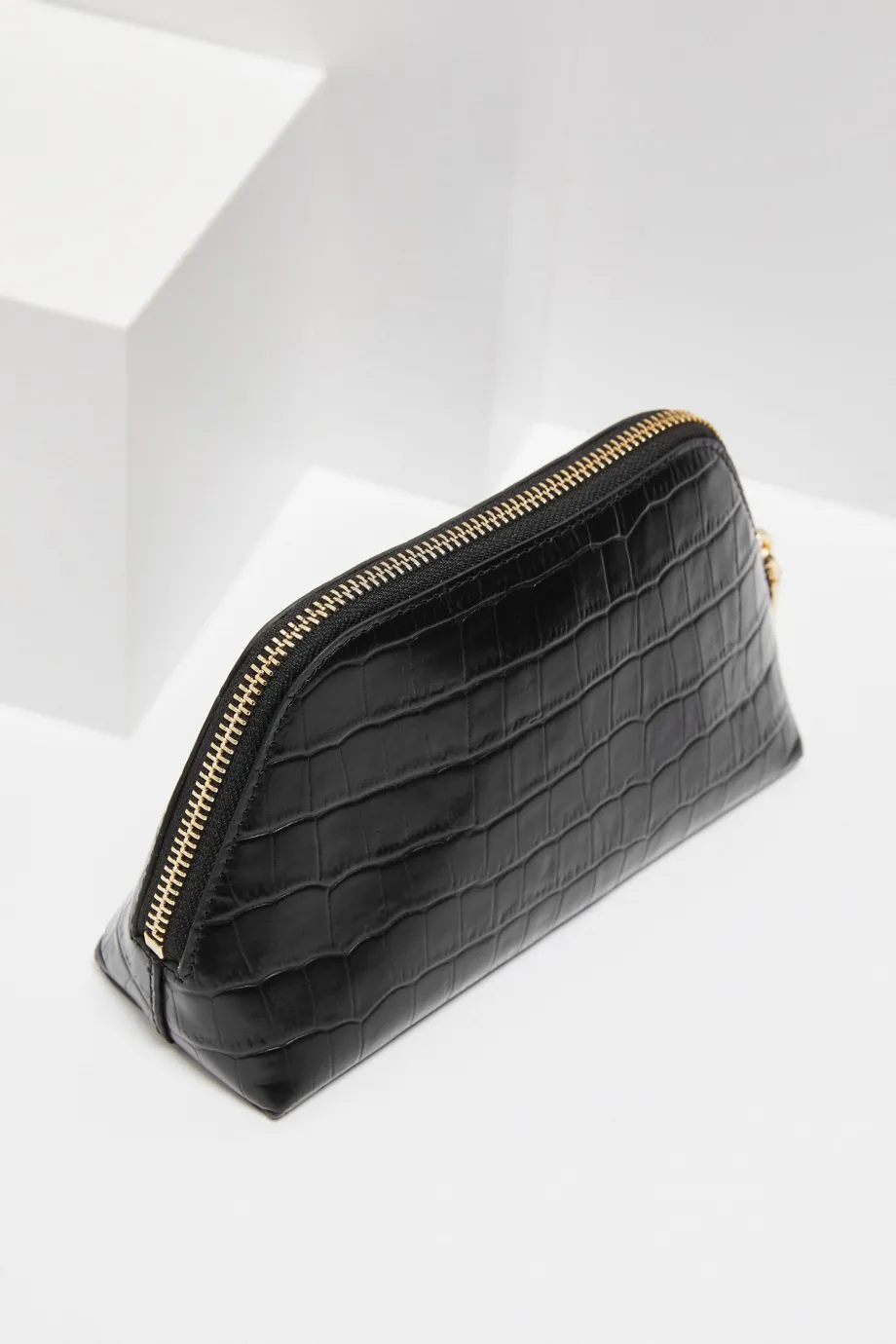 Model zamykany na elegancki złoty zamek prezentuje się wyjątkowo szlachetnie i podkreśla luksusowy charakter dodatku. Jego poręczny rozmiar sprawia, że bez trudu zmieści się w torebce, a jednocześnie oferuje wystarczająco dużo miejsca, by pomieścić wszystkie niezbędne kosmetyki i drobiazgi. Subtelna faktura skóry croco przyciąga wzrok, nadając całości wyrafinowanego charakteru, który doskonale łączy klasykę z nowoczesnym designem.