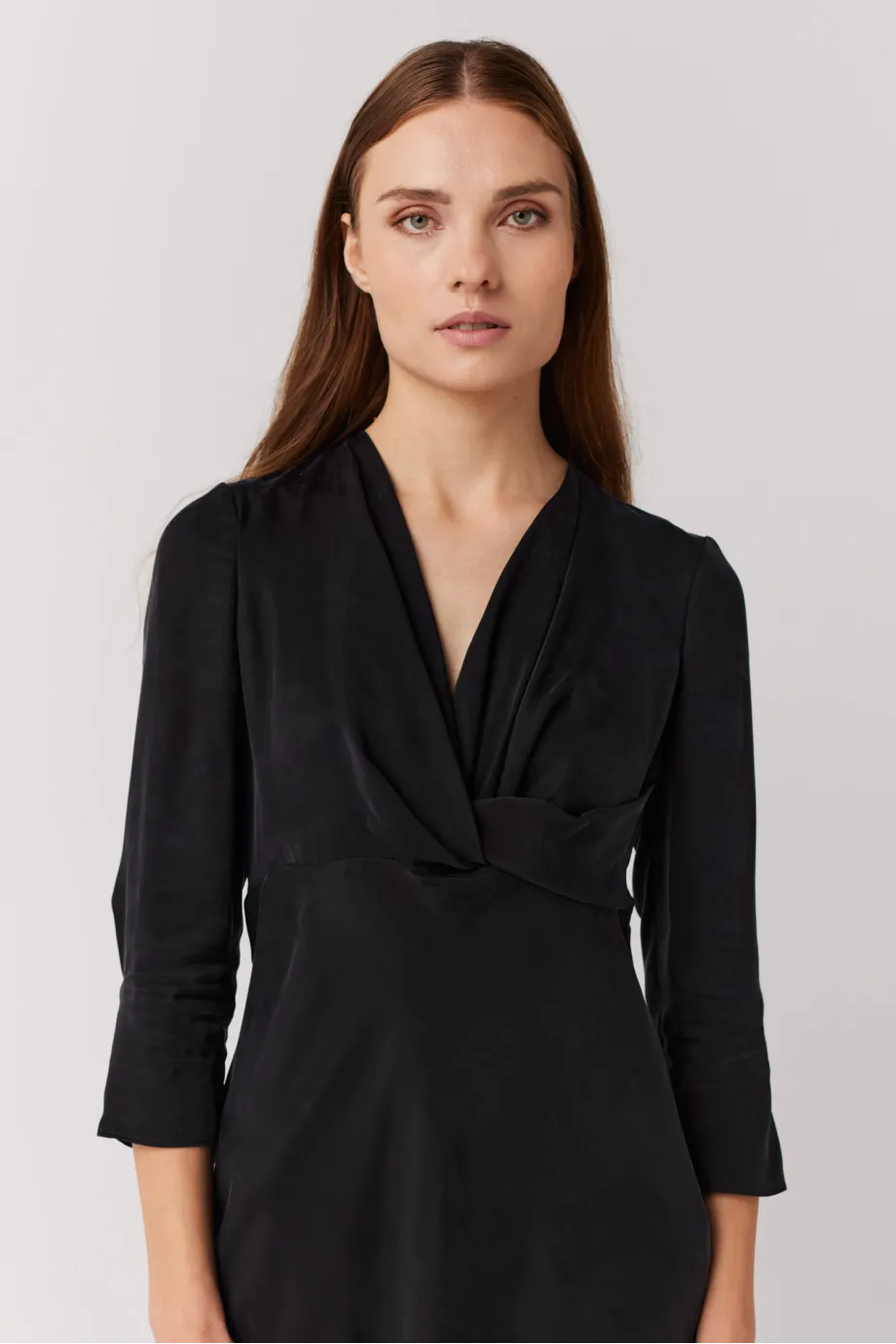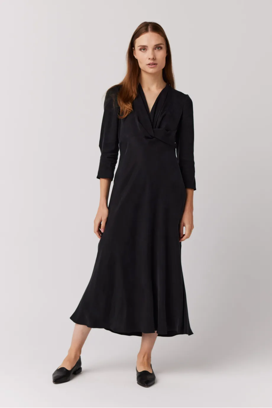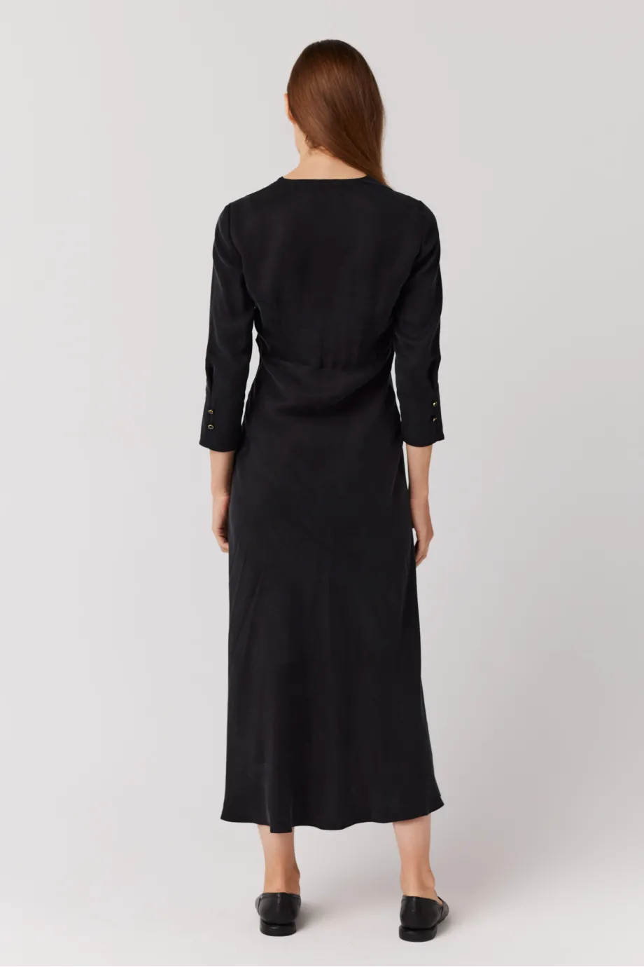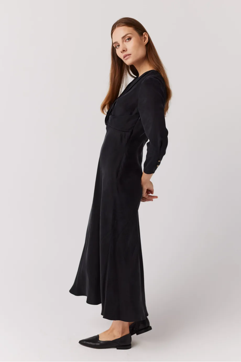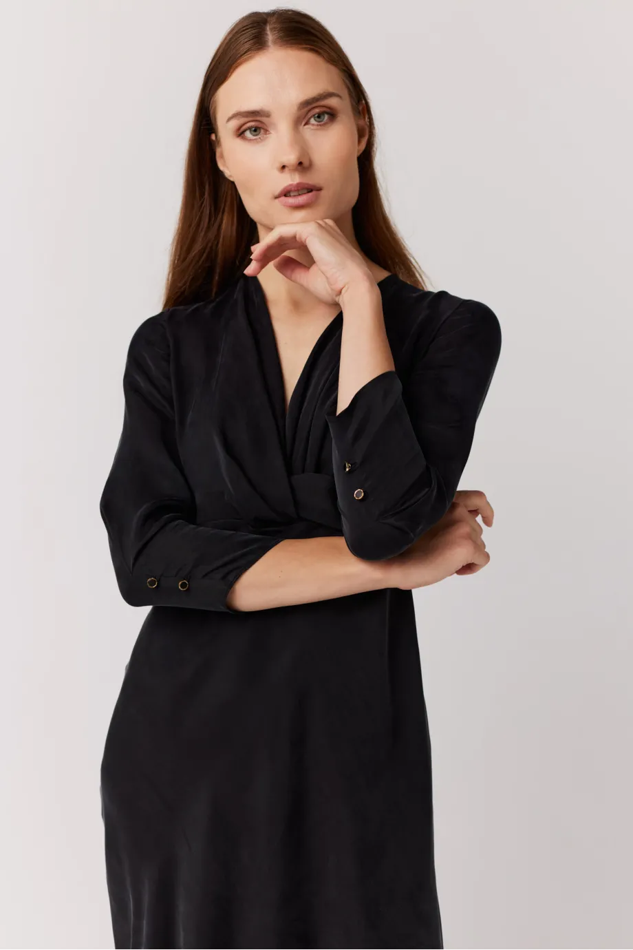 Sukienka cupro, czyli uszyta z włókien miedziowych, posiada rękawy ¾ typu wstawianego ozdobione guzikami. Zmysłowa, magiczna czerń pogłębia szlachetność miękkiej w dotyku, ekskluzywnej tkaniny. Model występuje także w luksusowej, burgundowej barwie.