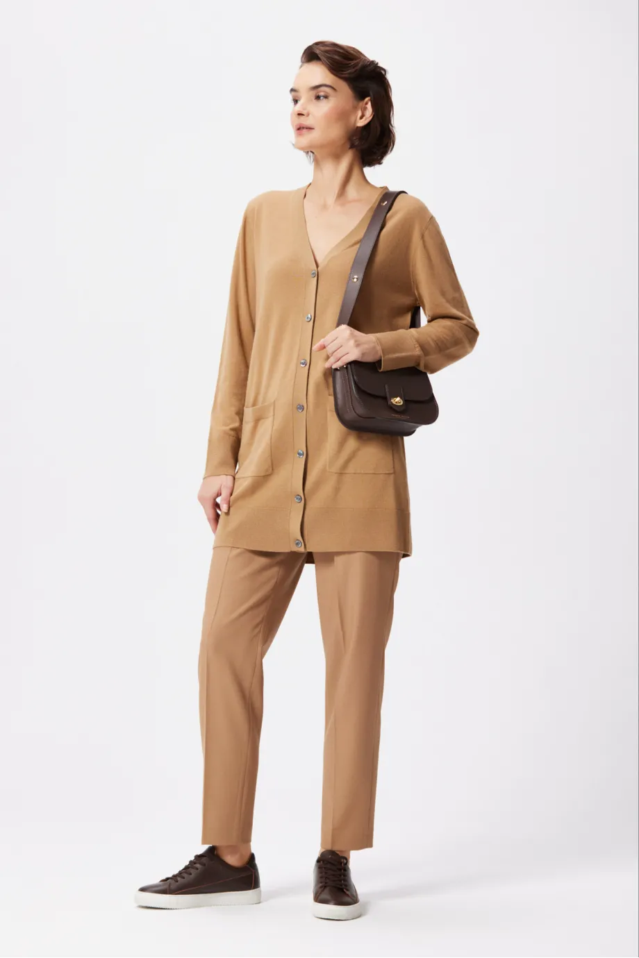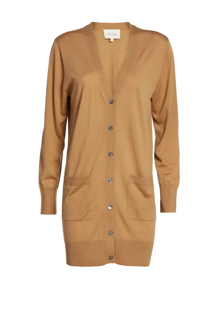 Camel to kolor wpisany w DNA marki Patrizia Aryton. W tym sezonie spotykamy go m.in. w postawi hitowych kardiganów z wełny merino. Ten długi kardigan z kieszeniami ma prostą, wszechstronną formę, która sprawdzi się w stylizacjach casualowych, smart casualowych, a nawet koktajlowych czy zamiast marynarki w duchu soft office.