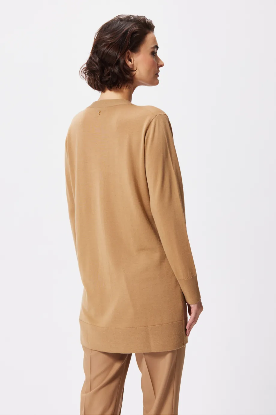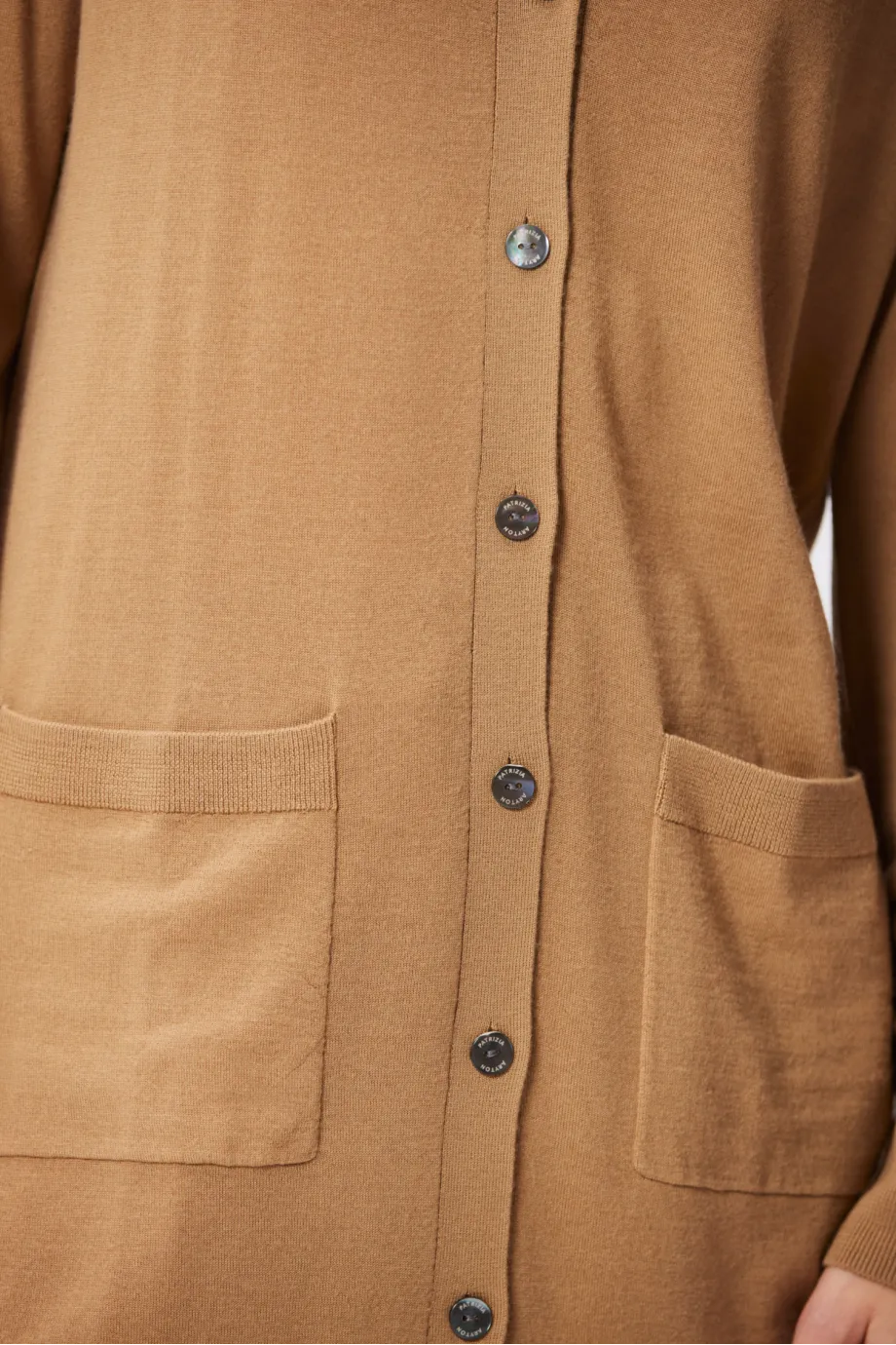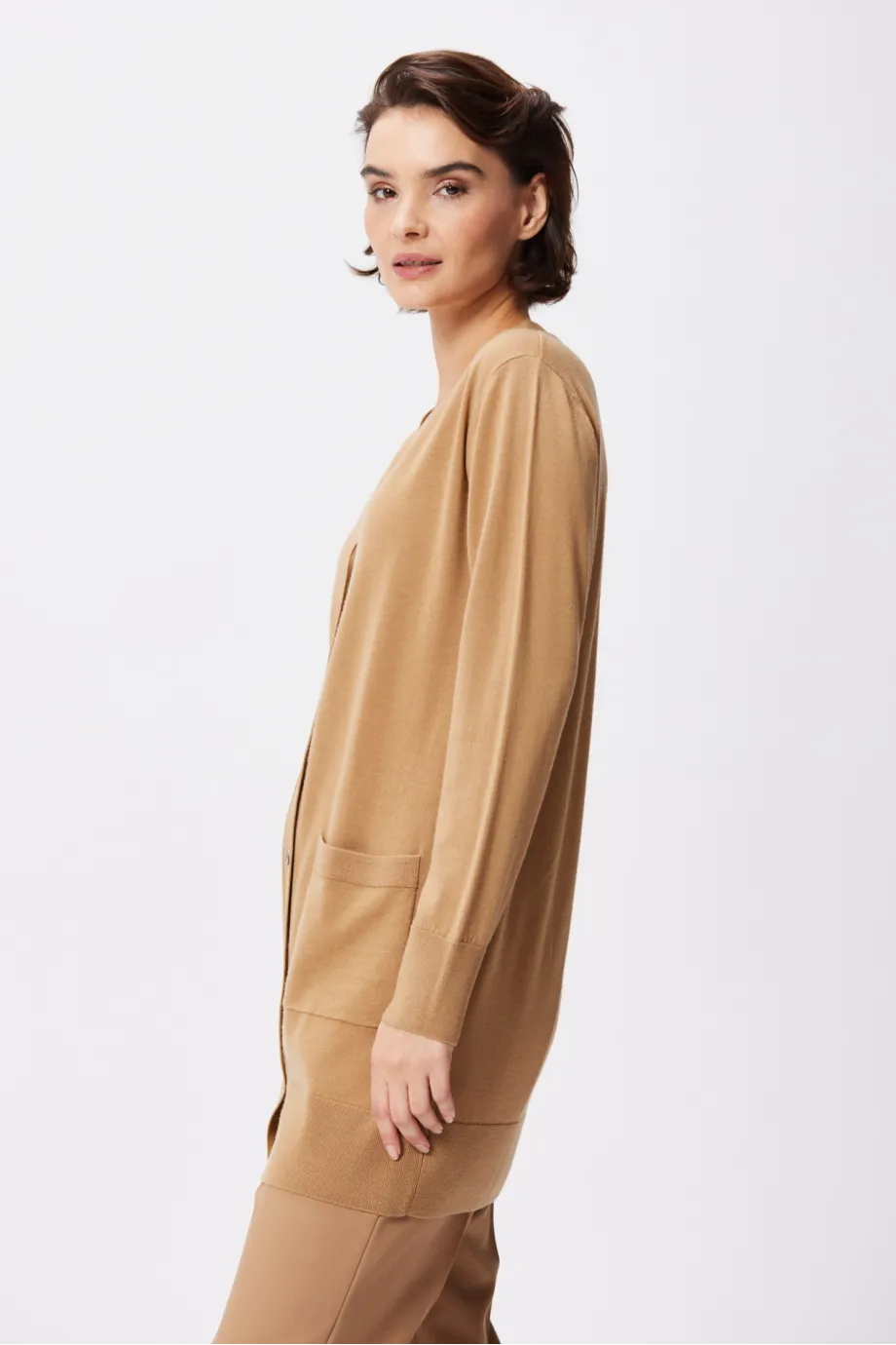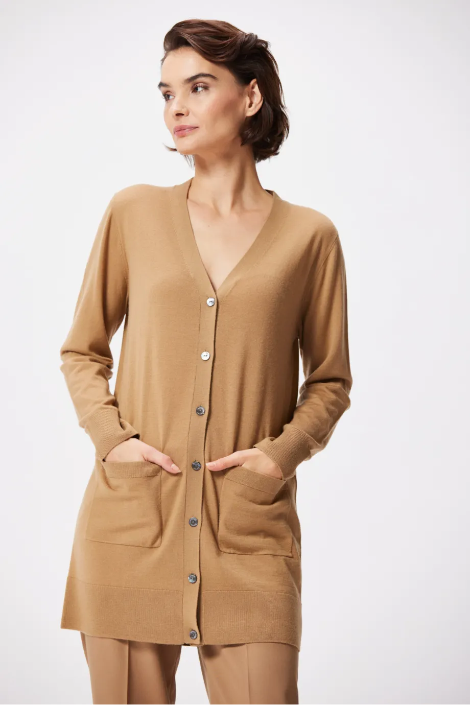 Camelowy kardigan z wełny merino uszyto z dzianiny o splocie single jersey, powstałej na maszynie o uigleniu równym 16 GG. Materiał jest więc stosunkowo cienki i lejący, a zarazem otulający i miękki. Wstawiane rękawy pomagają pozycjonować sylwetkę, a guziki z masy perłowej dodają całości subtelnego szyku.