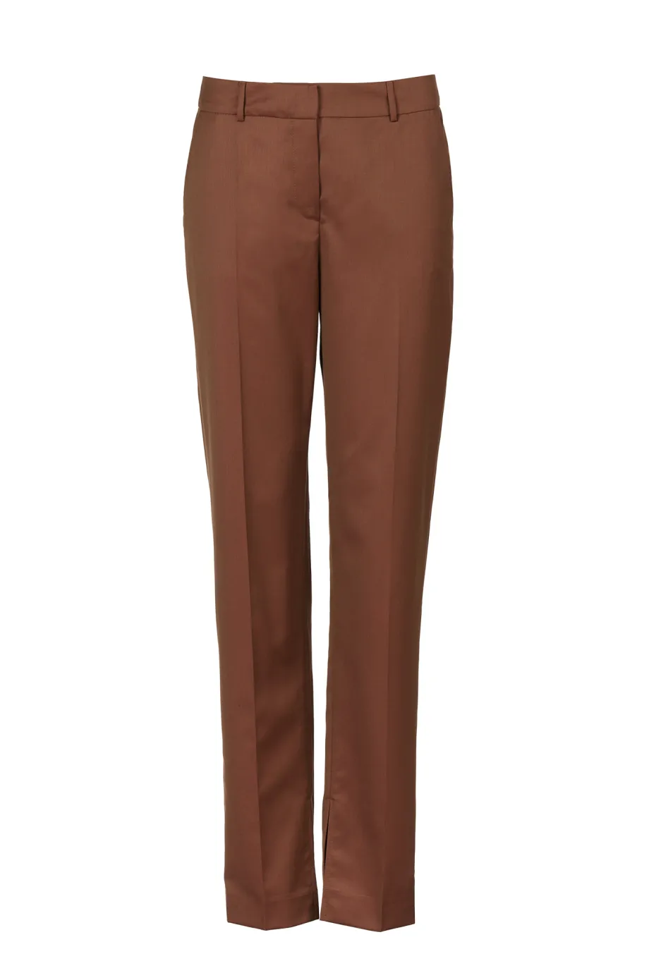 Brązowe spodnie garniturowe z rozcięciem na nogawce