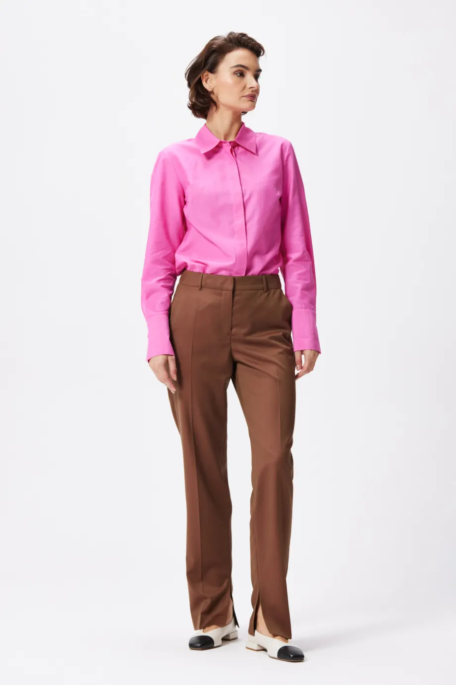 Brązowe spodnie do garnituru Patrizia Aryton są wykonane z wełny wyższej klasy, cienkiej, lejącej i delikatnej. Posiadają proste nogawki i prasowanie w kant oraz inne elementy charakterystyczne dla oficjalnych fasonów, jak szlufki, kieszenie i kryty zamek. Od środka zapinane są na guzik z naturalnego orzecha. Nie sposób nie zwrócić uwagi na ozdobne lamowania od wewnątrz. Są one symbolem najwyższej staranności krawiectwa i dbałości nawet o te szczegóły, które wpływają na komfort użytkowania, choć na pierwszy rzut oka ich nie widać.