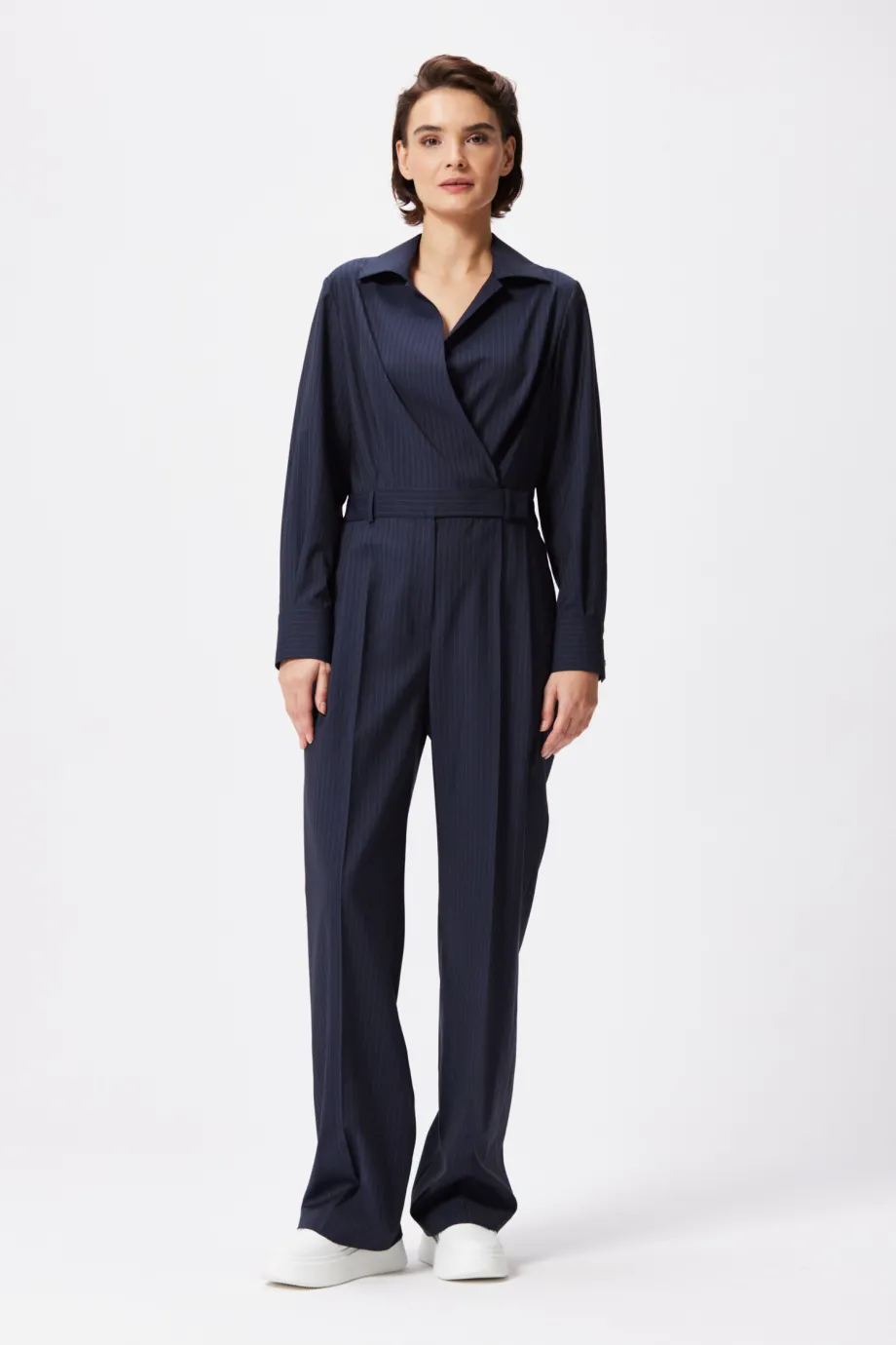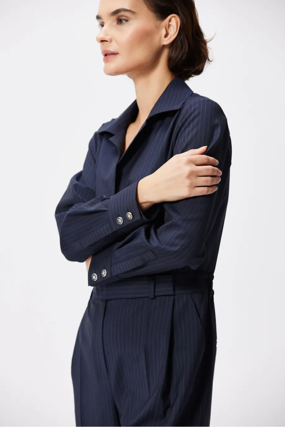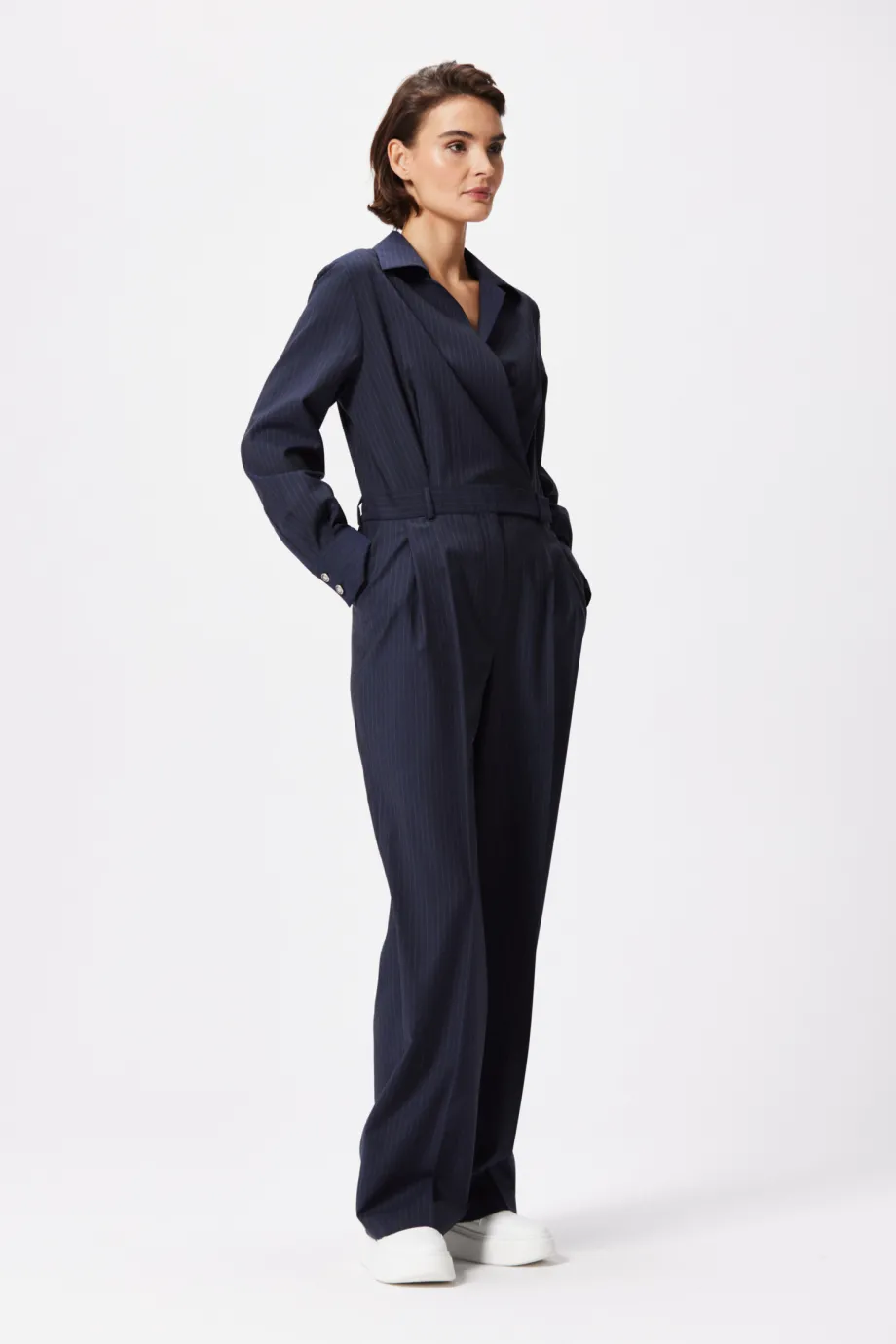 Elegancki kombinezon z długim rękawem, damski, sprawdzi się zawsze wtedy, gdy chcesz wyglądać profesjonalnie i czuć się kobieco. Sprzyja temu zarówno formalny krój, jak i wykwintny odcień nasyconego granatu atramentowego z jasnymi cienkimi prążkami. Model wyróżniają m.in. wstawiane rękawy, szykowny kołnierzyk czy kontrafałda na plecach. Na mankietach i w talii umieszczono metalowe guziki, a wewnątrz dodano guzik z orzecha corozo, służący do regulacji szerokości spodni.