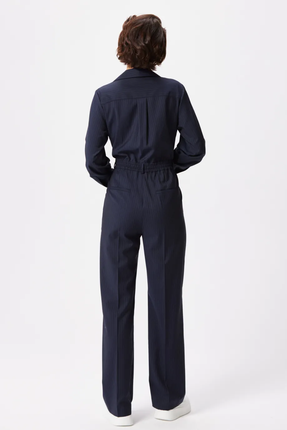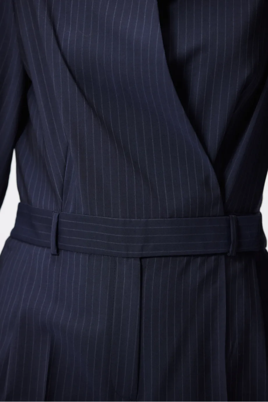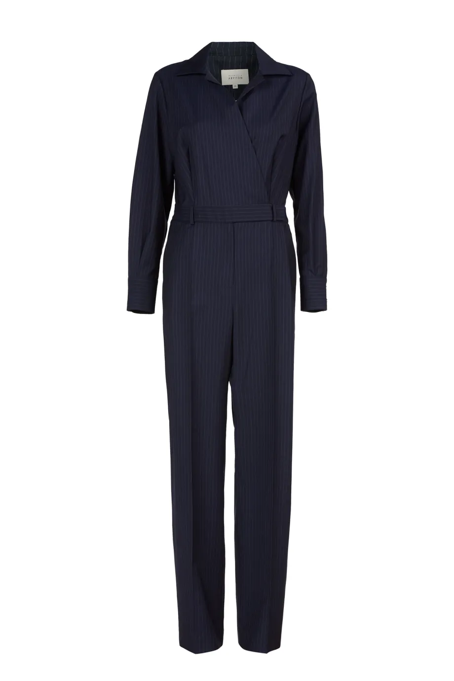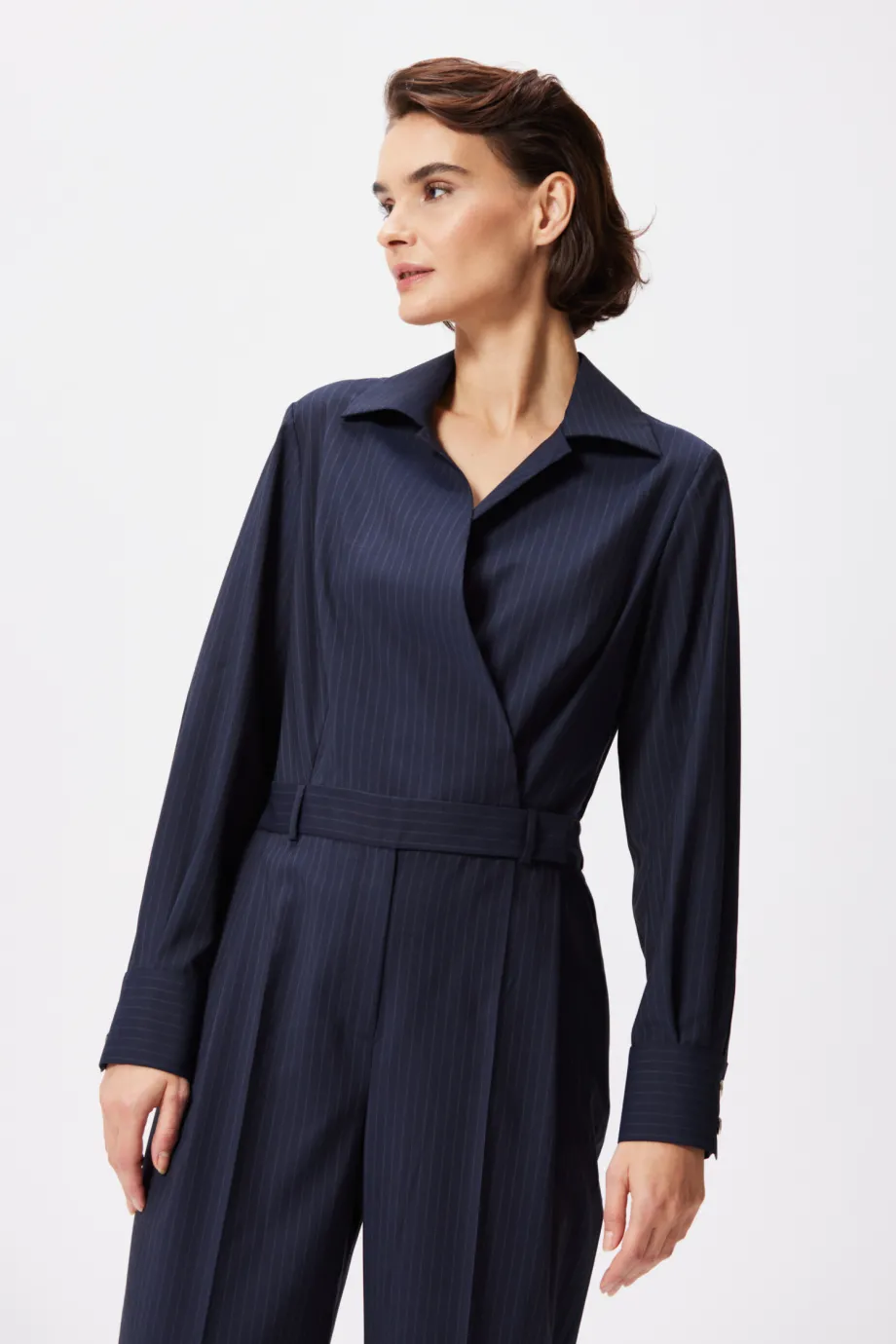 Elegancki kombinezon z długim rękawem, damski, sprawdzi się zawsze wtedy, gdy chcesz wyglądać profesjonalnie i czuć się kobieco. Sprzyja temu zarówno formalny krój, jak i wykwintny odcień nasyconego granatu atramentowego z jasnymi cienkimi prążkami. Model wyróżniają m.in. wstawiane rękawy, szykowny kołnierzyk czy kontrafałda na plecach. Na mankietach i w talii umieszczono metalowe guziki, a wewnątrz dodano guzik z orzecha corozo, służący do regulacji szerokości spodni.