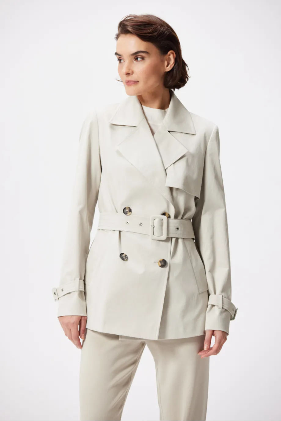 - Trencz dwurzędowy w kolorze chłodnego beżu
