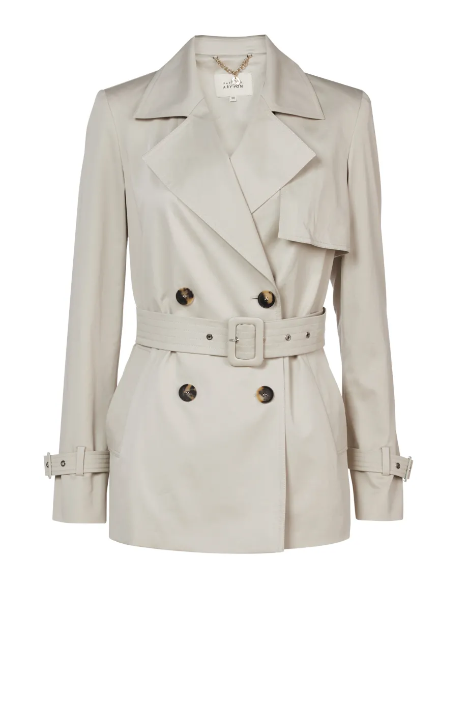 Krótki beżowy trencz Patrizia Aryton ma barwę jasnego, chłodnego beżu, który perfekcyjnie komponuje się ze wszystkimi odcieniami. Krój płaszcza jest odpowiedni dla każdego typu figury, a tkanina pomaga pozycjonować sylwetkę. Długość za pośladki to idealny kompromis pomiędzy całkiem krótką kurtką a klasycznym prochowcem.