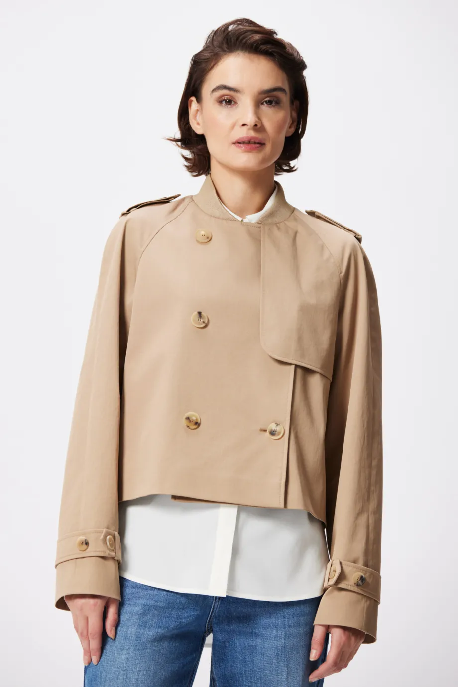 Krótka kurtka trencz ma kolor jasnego, łagodnego camelu. Świetnie harmonizują z nim guziki z rogu bawolego, w odcieniach beżu i brązu. Tworzą one dwurzędowe zapięcie i są obecne także na rękawach, zdobiąc odpinane pagony. Tego rodzaju nawiązanie do stylu militarnego zastosowano również na ramionach.