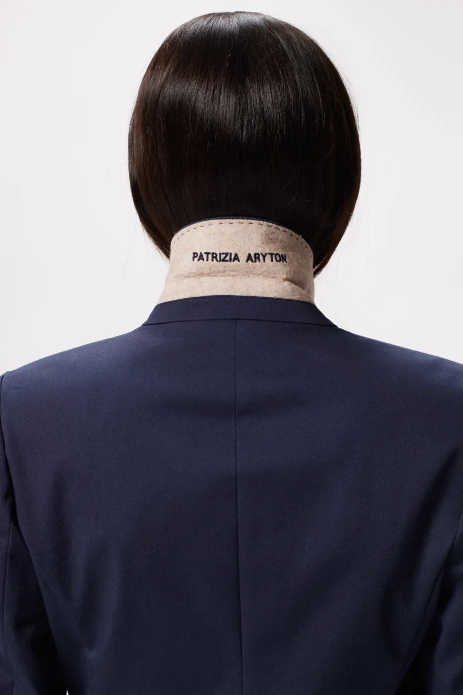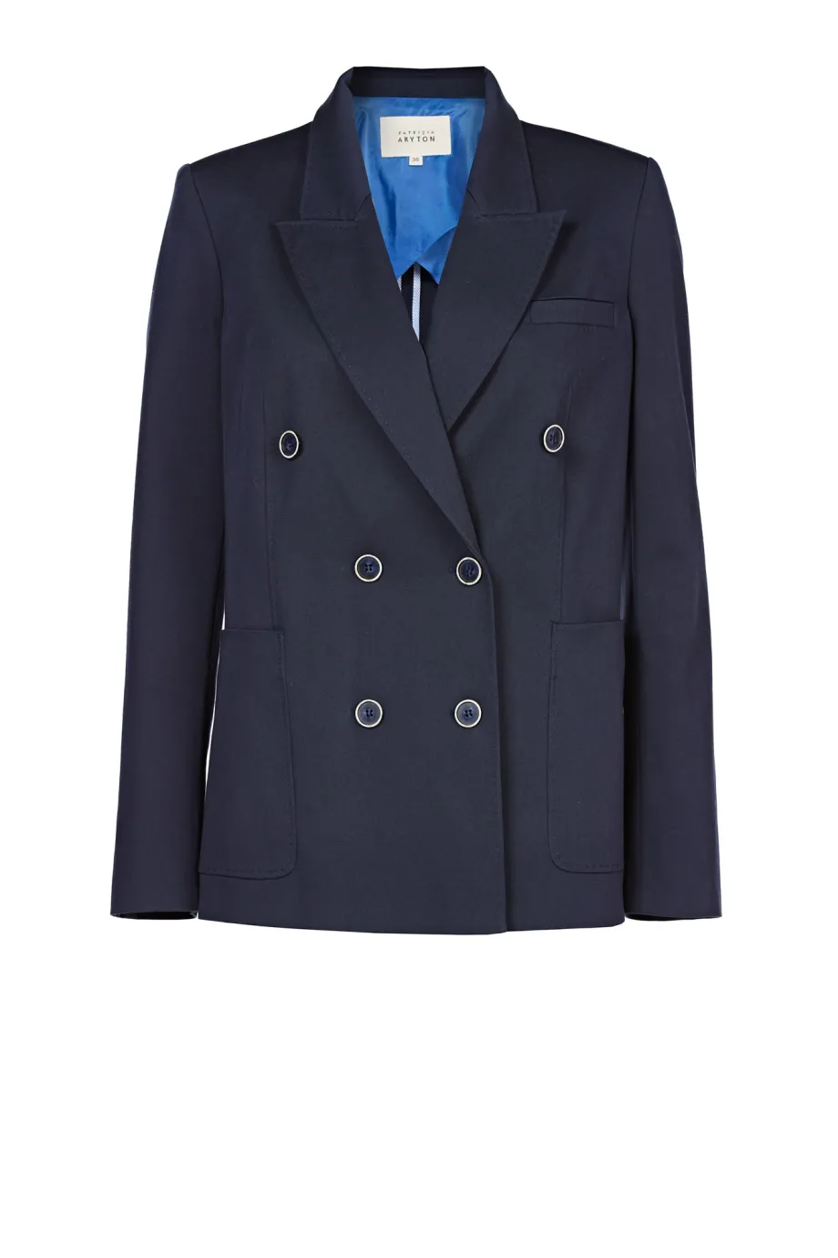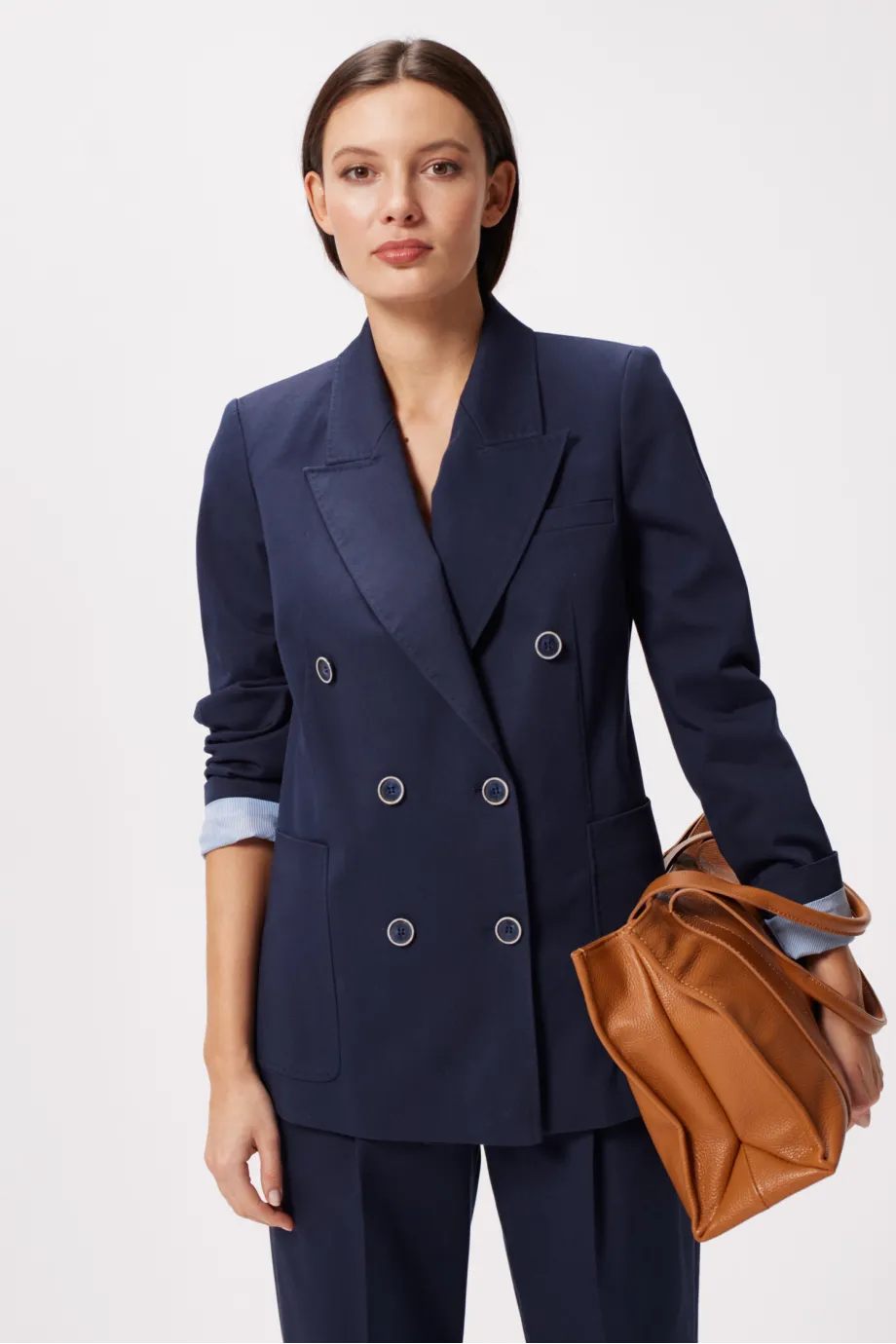 Granatowy odcień żakietu to nie tylko klasyka gatunku, ale też synonim elegancji i ponadczasowego stylu. Idealnie wkomponuje się w garderobę każdej kobiety sukcesu, dodając jej profesjonalnego i szykownego charakteru. Dwurzędowe zapięcie na guziki z naturalnego orzecha to subtelny akcent, który podkreśli Twój wyrafinowany gust. Długi rękaw z mankietami zapinanymi na guziki dopełnia całości, zapewniając elegancki wygląd, a kieszenie dodają praktyczności.