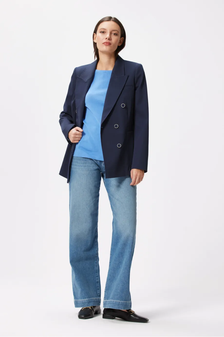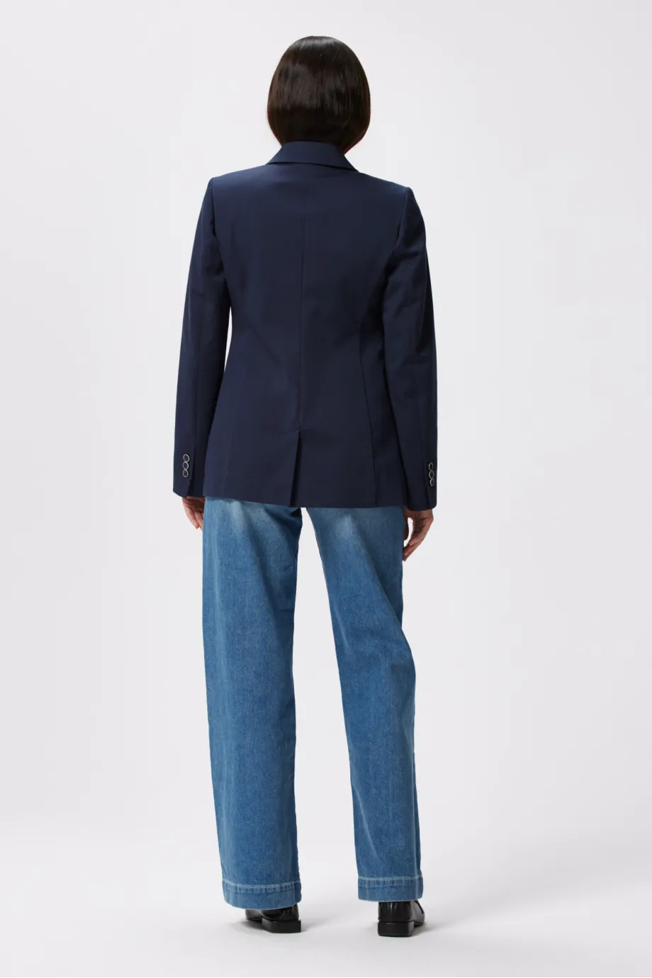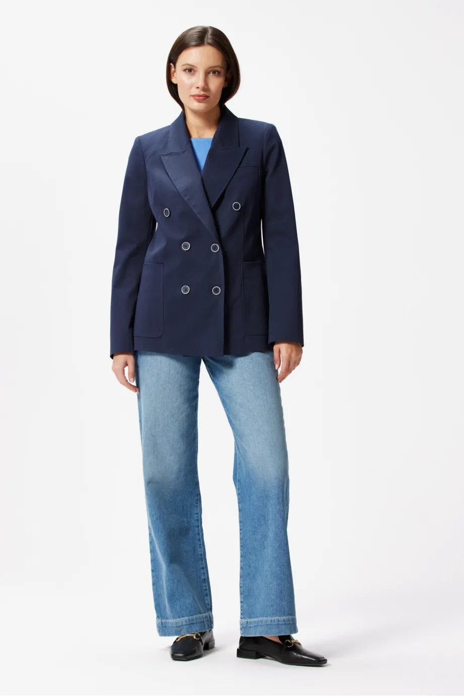 Granatowy odcień żakietu to nie tylko klasyka gatunku, ale też synonim elegancji i ponadczasowego stylu. Idealnie wkomponuje się w garderobę każdej kobiety sukcesu, dodając jej profesjonalnego i szykownego charakteru. Dwurzędowe zapięcie na guziki z naturalnego orzecha to subtelny akcent, który podkreśli Twój wyrafinowany gust. Długi rękaw z mankietami zapinanymi na guziki dopełnia całości, zapewniając elegancki wygląd, a kieszenie dodają praktyczności.