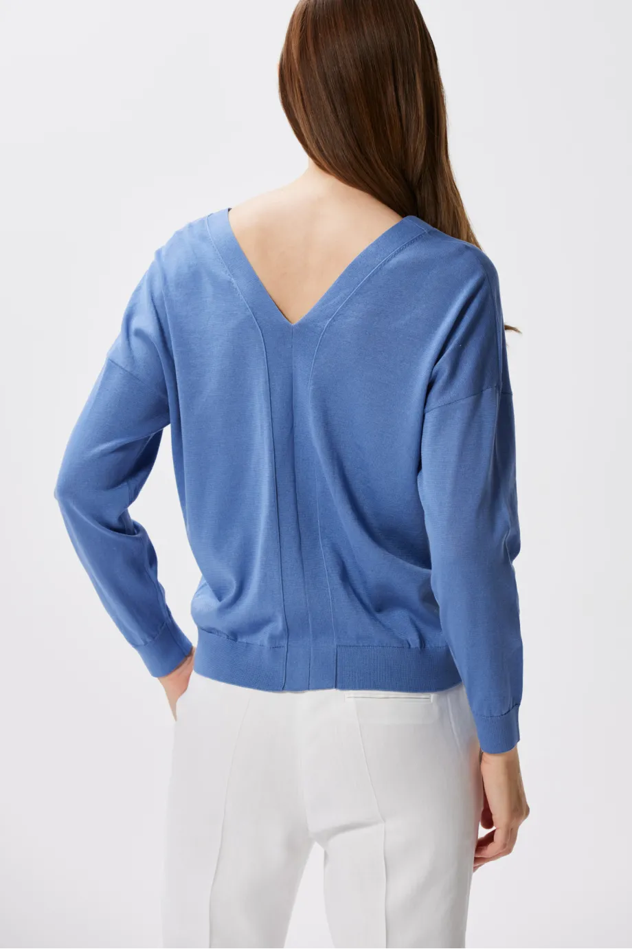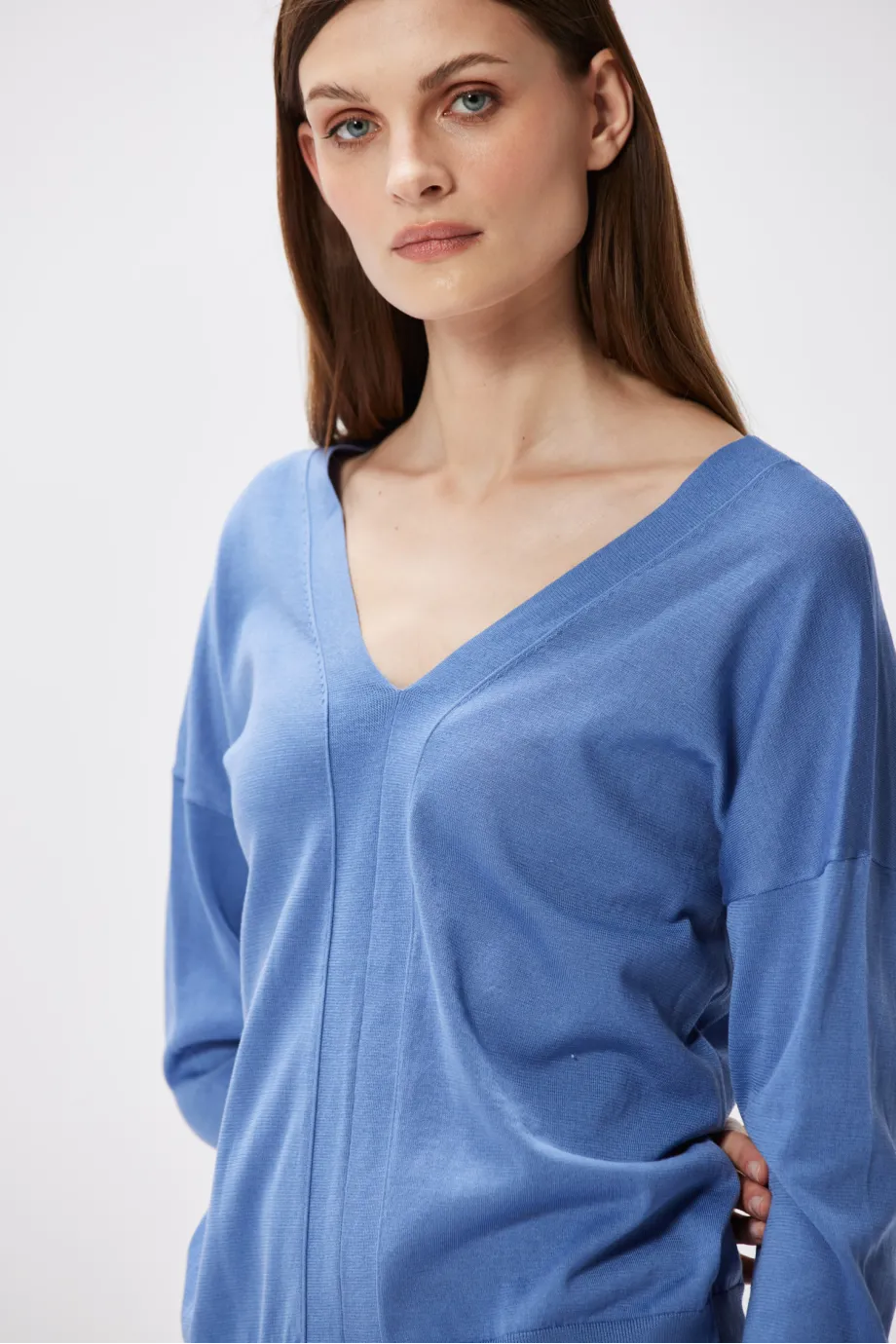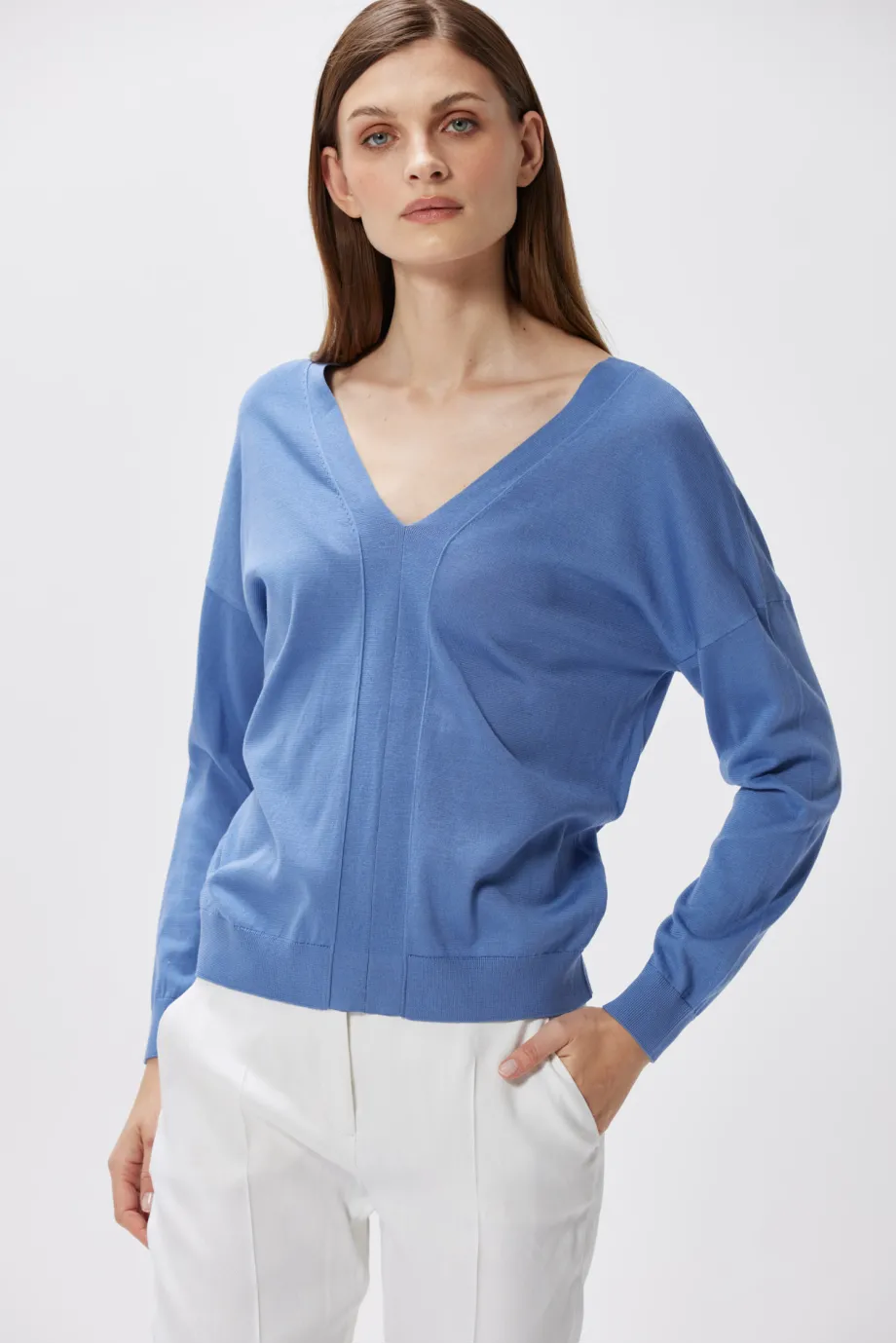 Prezentujemy bawełnianą bluzkę z długim rękawem, która delikatnie otula sylwetkę, idealnie dopasowując się do jej kształtów, a to wszystko dzięki wykorzystaniu niezwykle delikatnej dzianiny o splocie single jersey. Bluzka z dekoltem V zarówno z przodu, jak i na plecach dodaje temu modelowi kobiecości i subtelnej zmysłowości, z kolei luźna forma i długie rękawy sprawiają, że jest to propozycja niezwykle wygodna, zapewniająca komfort noszenia przez cały dzień. Wybierz błękitną bluzkę damską w odcieniu jeansu lub postaw na subtelniejszą wersję w kolorze morelowego beżu - każda z nich doskonale wpisze się w klimat letnich i wiosennych stylizacji.
