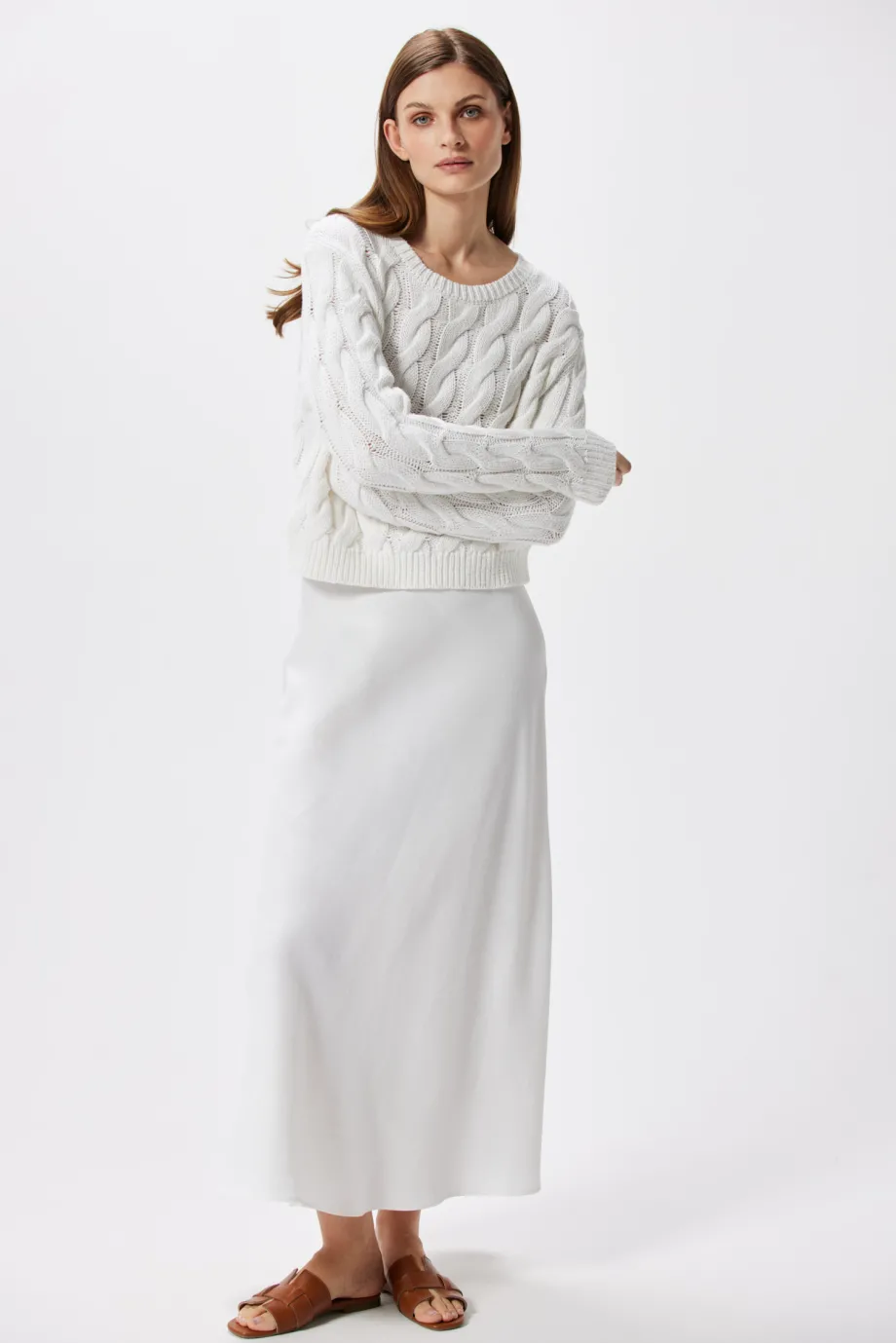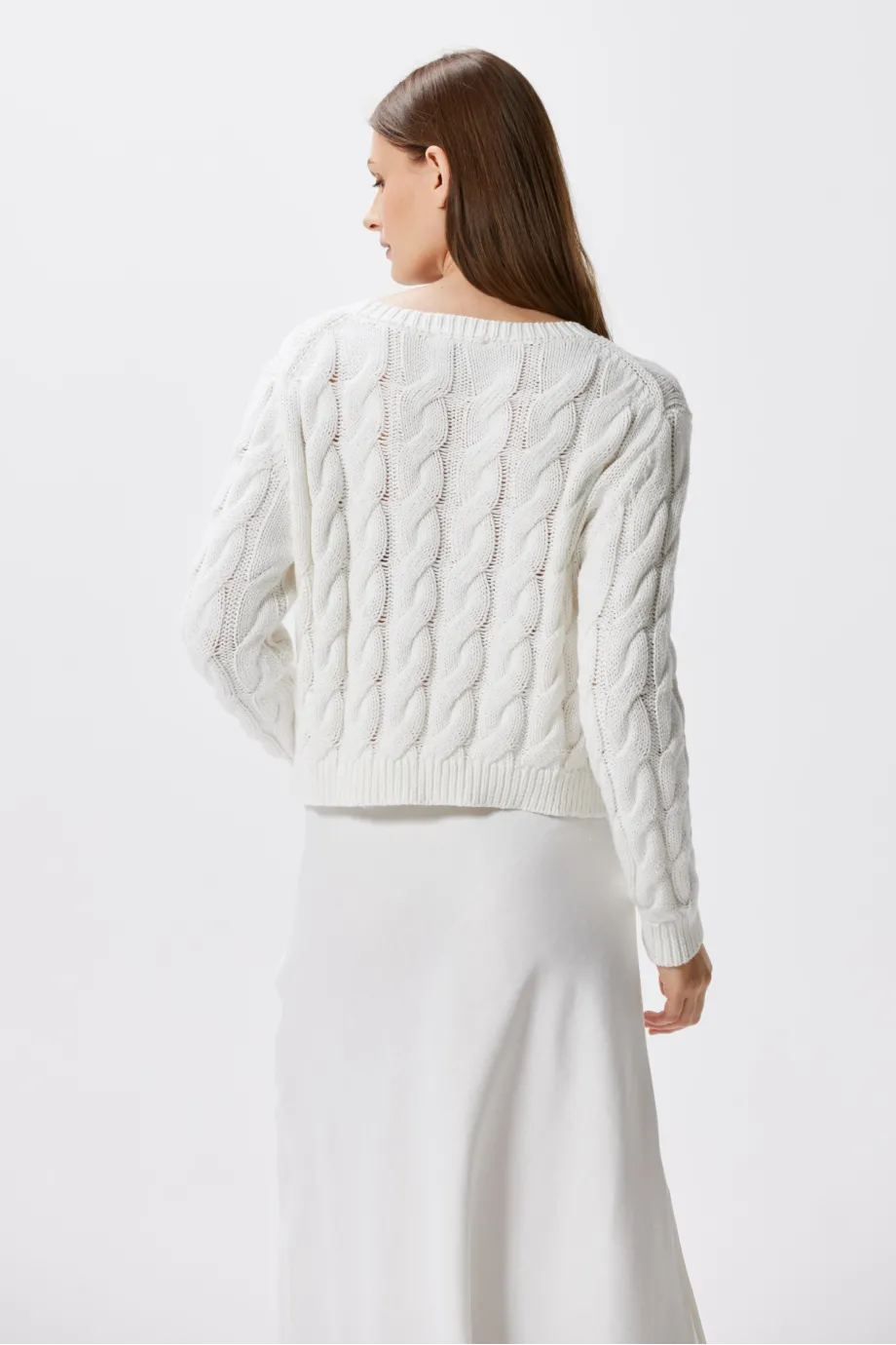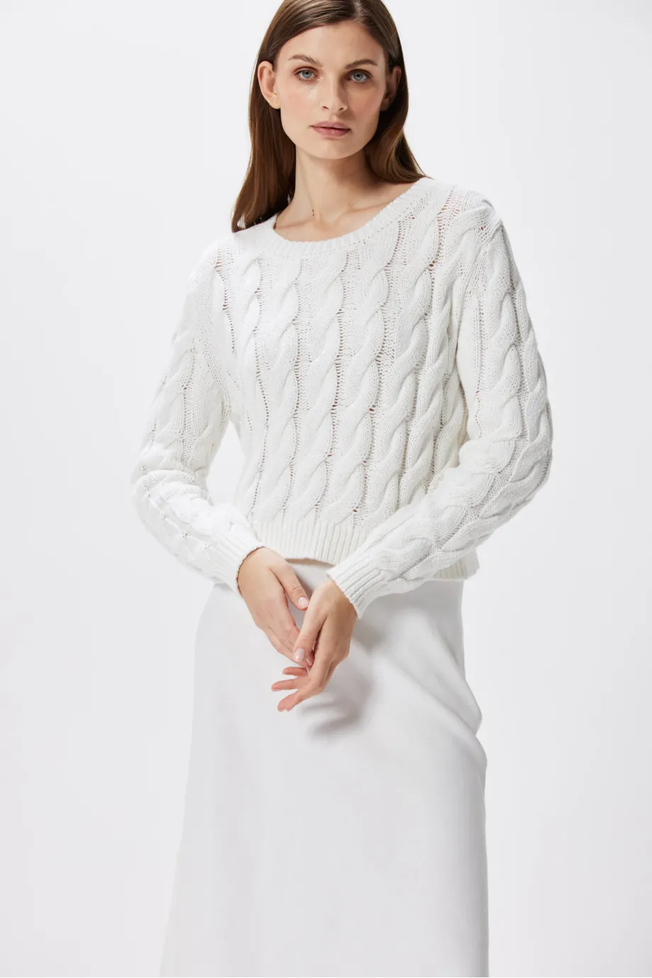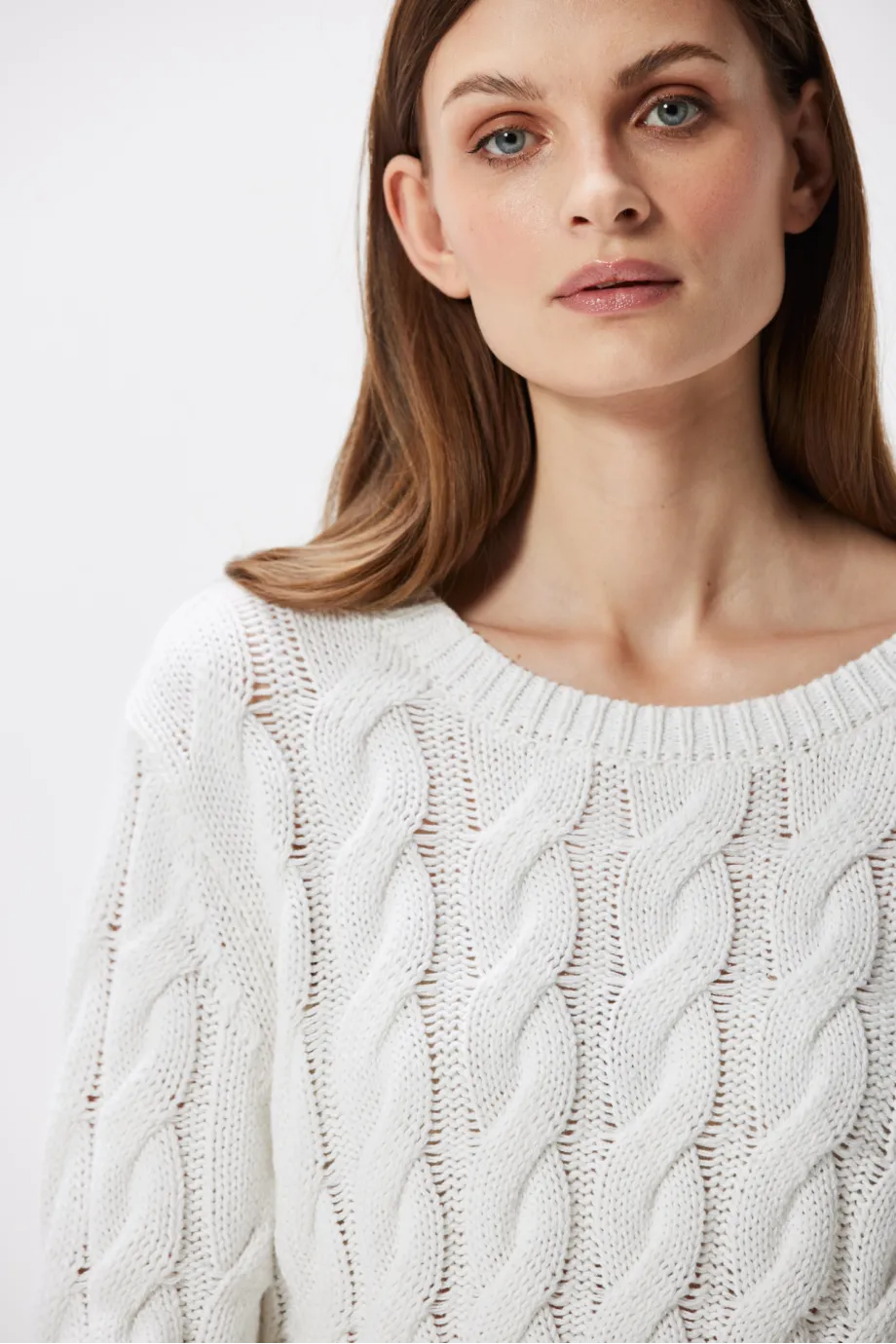 Biały sweter w warkoczowy splot