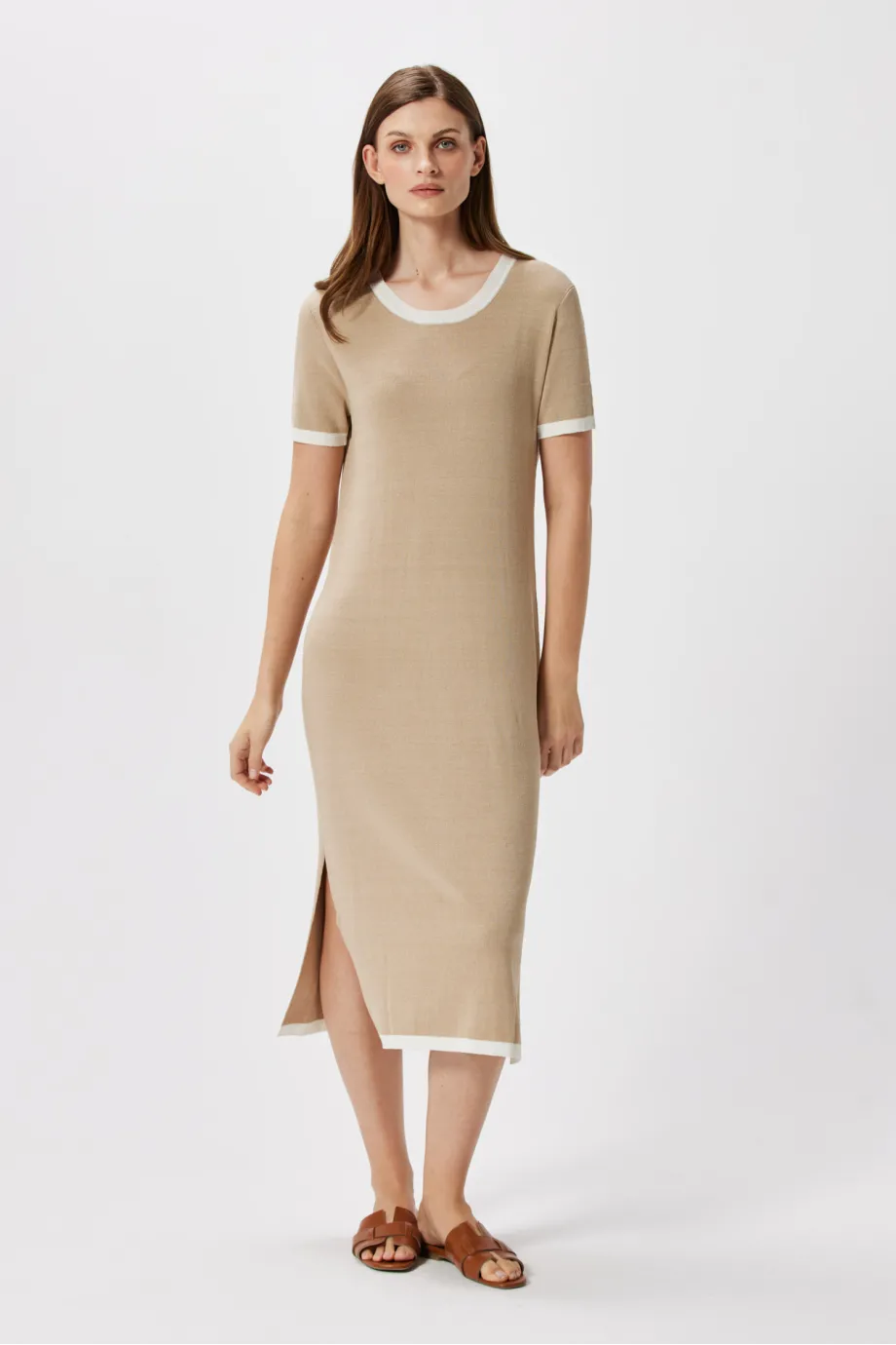 Beżowa sukienka midi z rozcięciem ozdobiona lamówką