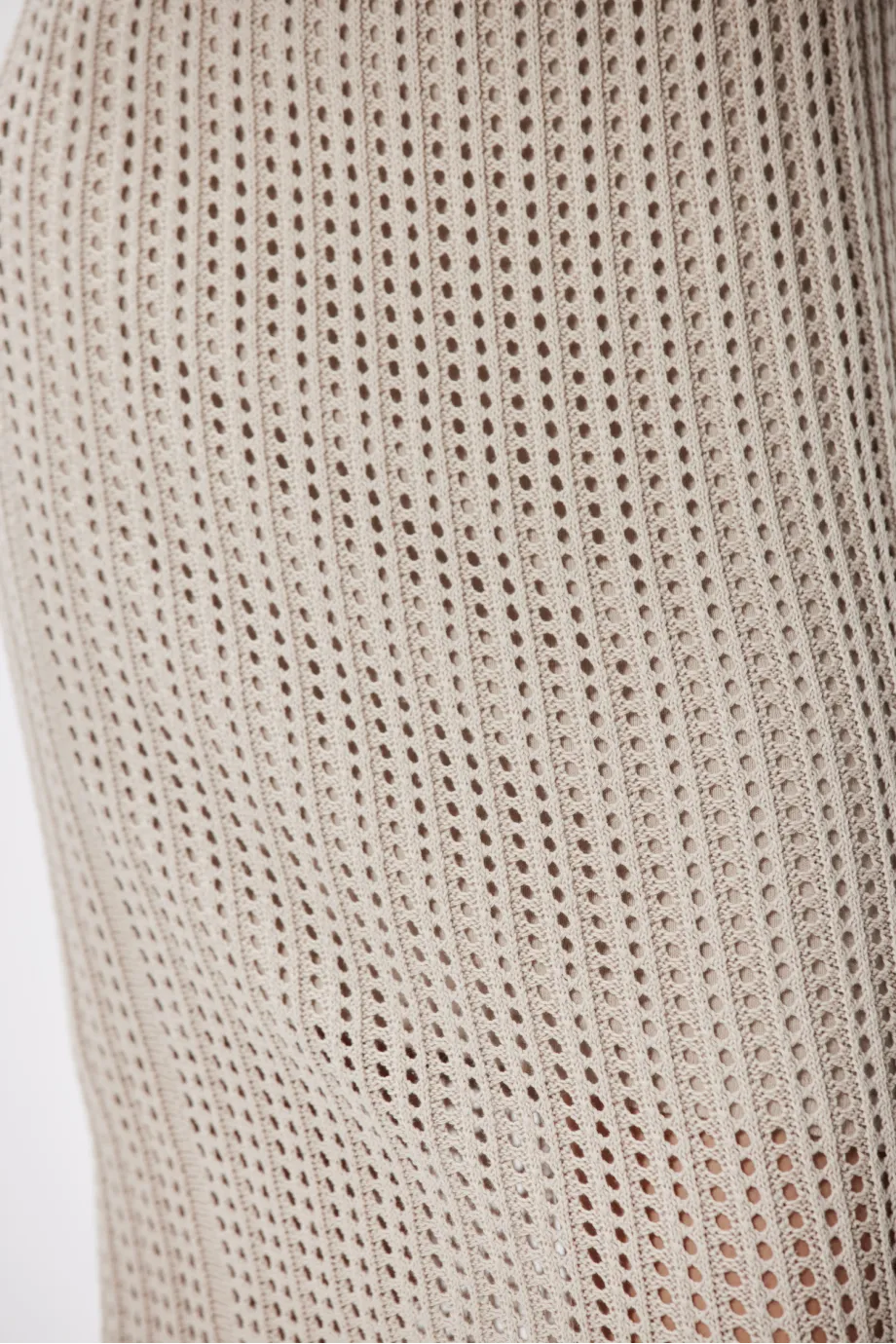 Odkryj beżową dzianinową sukienkę midi, która idealnie wpisze się w Twój letni styl! Wykonana z miękkiej, bawełnianej dzianiny, doskonale dopasuje się do Twojej sylwetki, zapewniając komfort i podkreślając atuty kobiecej figury. Wykonana na maszynie o uigleniu 7 GG, sukienka charakteryzuje się wyjątkowym ażurowym splotem, dodającym jej lekkości i subtelnego uroku. Lekka i zwiewna konstrukcja bez rękawów oraz podszewka z czystej bawełny, zapewnią Ci idealny komfort termiczny w upalne dni.