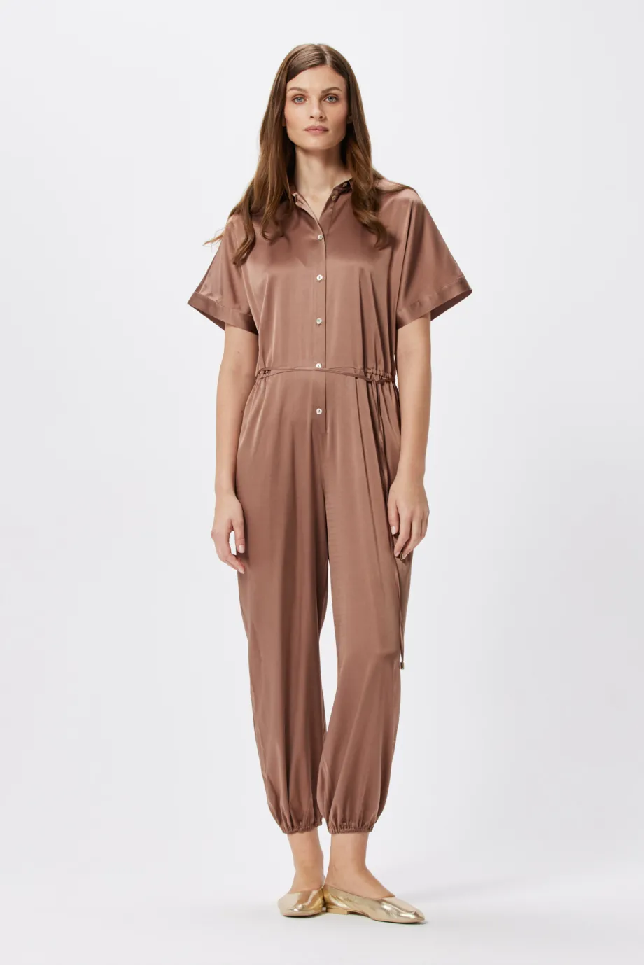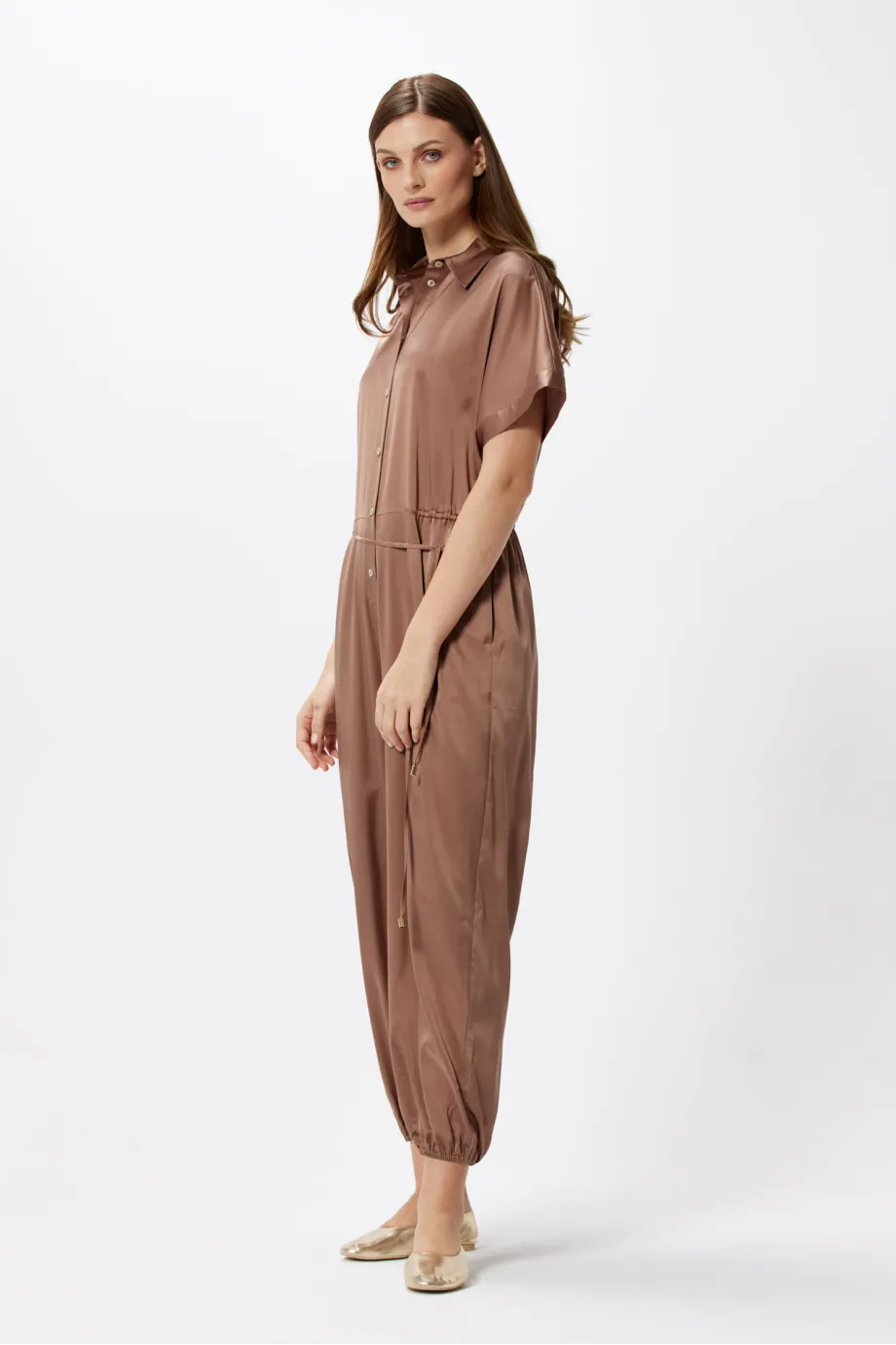 Spodnium ma krótki, szeroki rękaw oraz luźne nogawki sięgające nad kostkę, zakończone gumką. Forma modelu jest swobodna, bo w takich najatrakcyjniej prezentujemy się w jedwabnych strojach. Brązowy kombinezon damski wyposażono w jednorzędowe zapięcie na guziki z macicy perłowej, harmonizujące z satynowym połyskiem tkaniny.