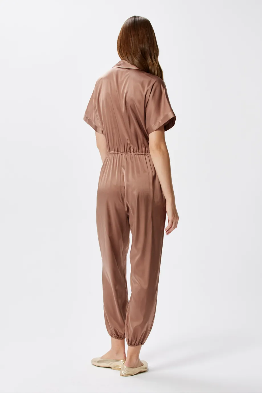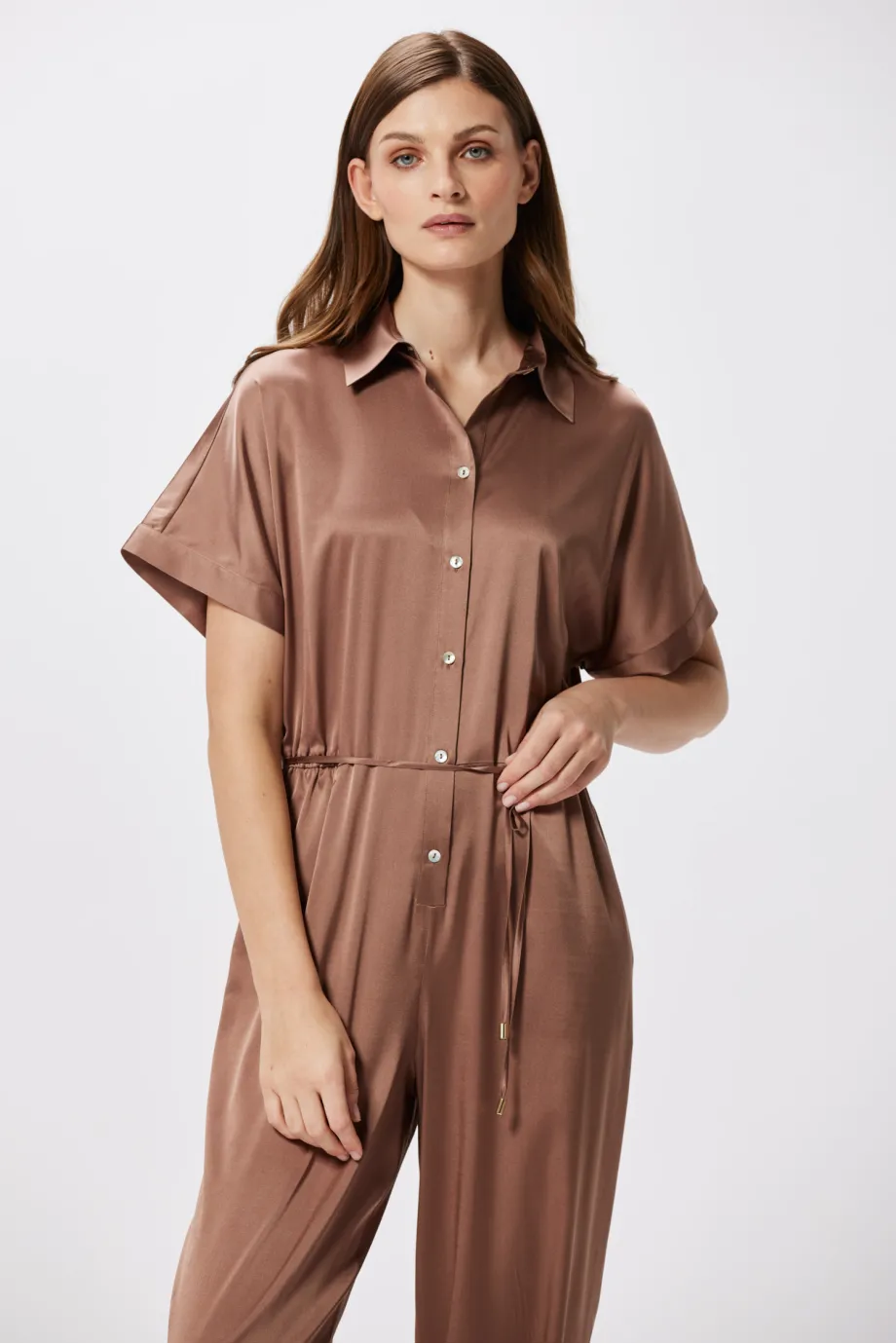 Ten kombinezon z jedwabiu ma odcień brązu pudrowego, czyli rozbielonego z dyskretnymi pigmentami złota i różu. Barwa stanowi jedną z naszych ulubionych w tym sezonie i fantastycznie łączy się ze wszystkimi kolorami bazowymi oraz modnymi pudrowym różem, śmietanką, złotem, czystą bielą, czekoladą, amarantem czy oranżem.
