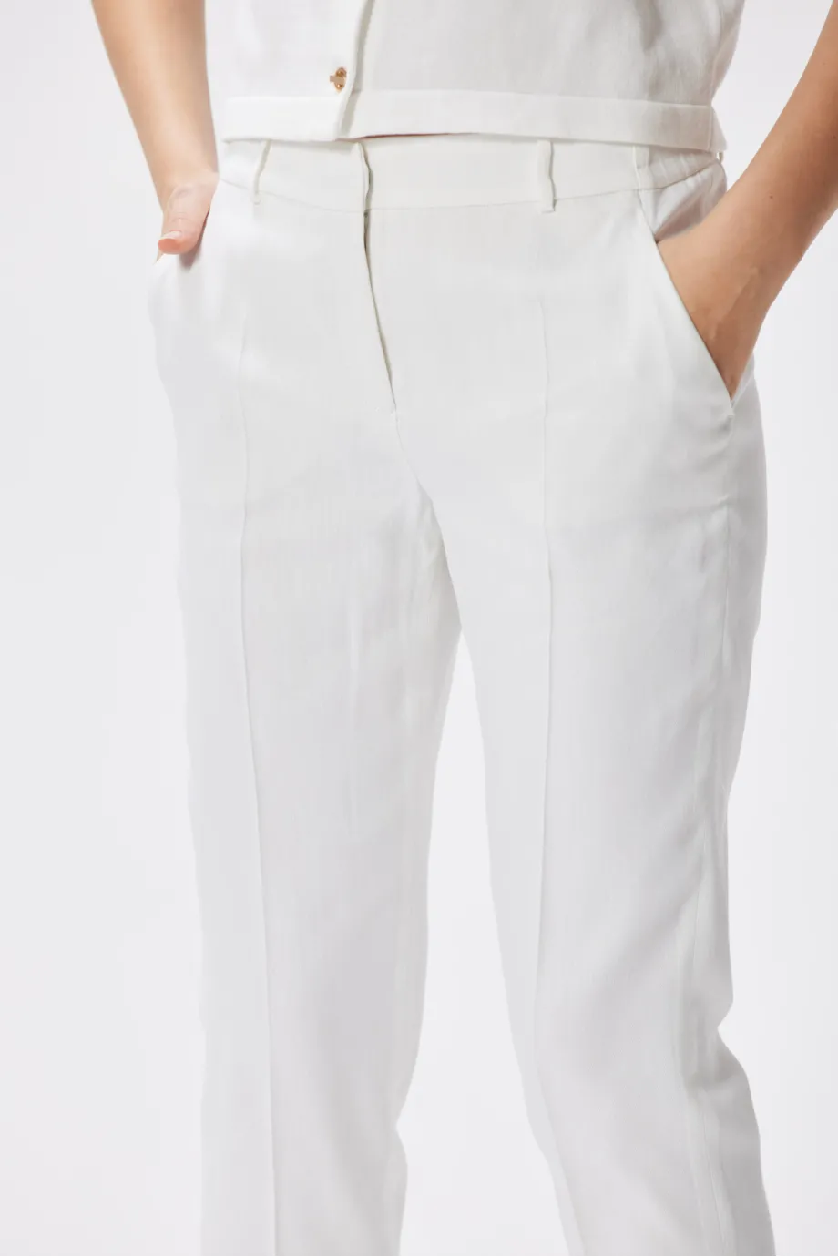 Nasze długie lniane spodnie do garnituru, damskie, posiadają wszystkie cechy klasycznych cygaretek. Mają kieszenie i szlufki, prasowanie w kant oraz zapięcie na kryty zamek i guzik z prawdziwego orzecha. Nogawka ma krój bliższy ciału, ale jednocześnie jest optymalnie luźna i subtelnie zwęża się ku dołowi. Dzięki cienkiej i lejącej tkaninie, spodnie pięknie układają się na sylwetce, wysmuklając ją, dodając kobiecości i gwarantując komfort noszenia. Wewnątrz spodni dostrzeżesz dekoracyjne lamówki. Dbamy o każdy detal wykończenia - nawet tam, gdzie sięga tylko Twój wzrok.