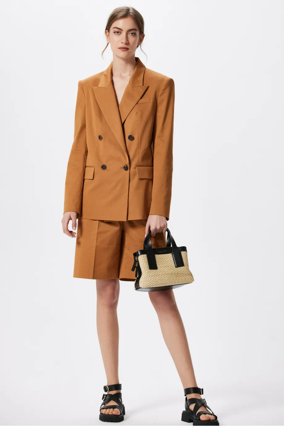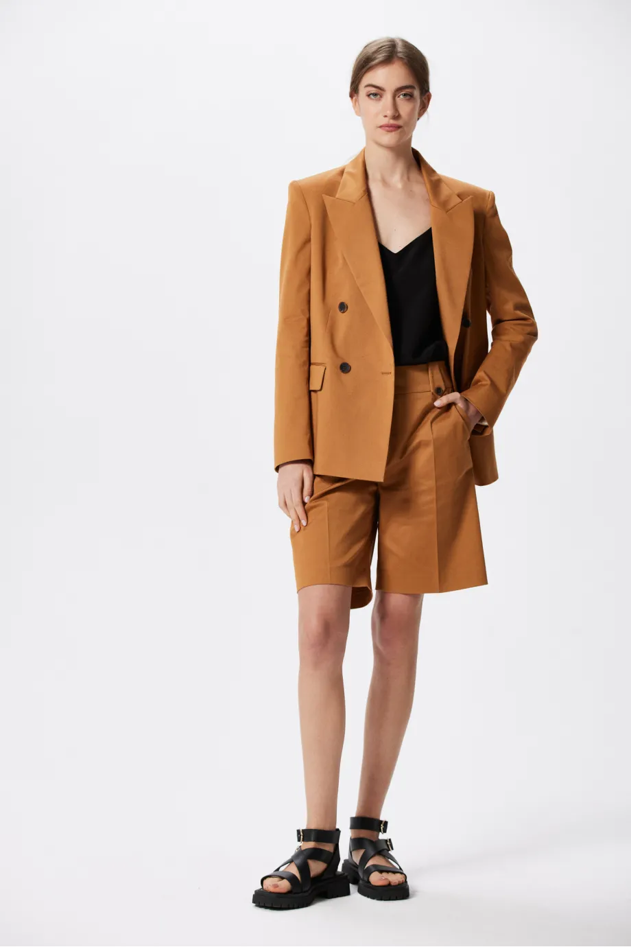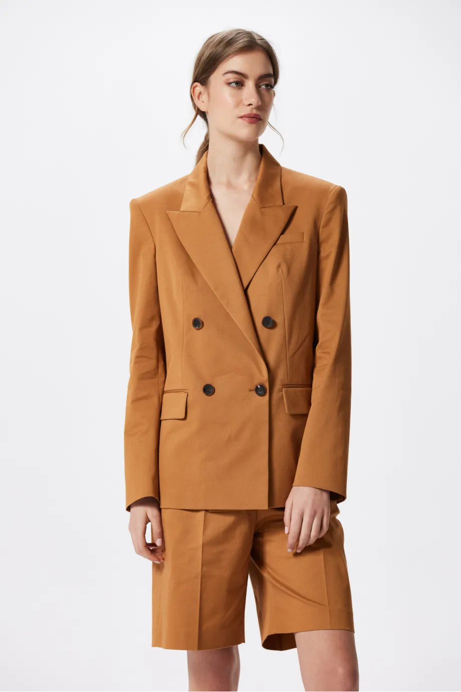 Co powiesz na prosty żakiet dwurzędowy z długim rękawem, zapinany na guziki wykonane z naturalnego rogu bawolego, a jednocześnie wyjątkowy ze względu na swój kolor? Dzięki półpodszewce i ozdobnemu pipingowi wewnątrz całość prezentuje się elegancko, a bawełniana tkanina z dodatkiem elastanu subtelnie modeluje sylwetkę, zachowując przy tym komfort noszenia. Żakiet możesz zestawić z eleganckimi szortami uszytymi z tej samej tkaniny, tworząc spójny i efektowny garnitur w nowoczesnym wydaniu.