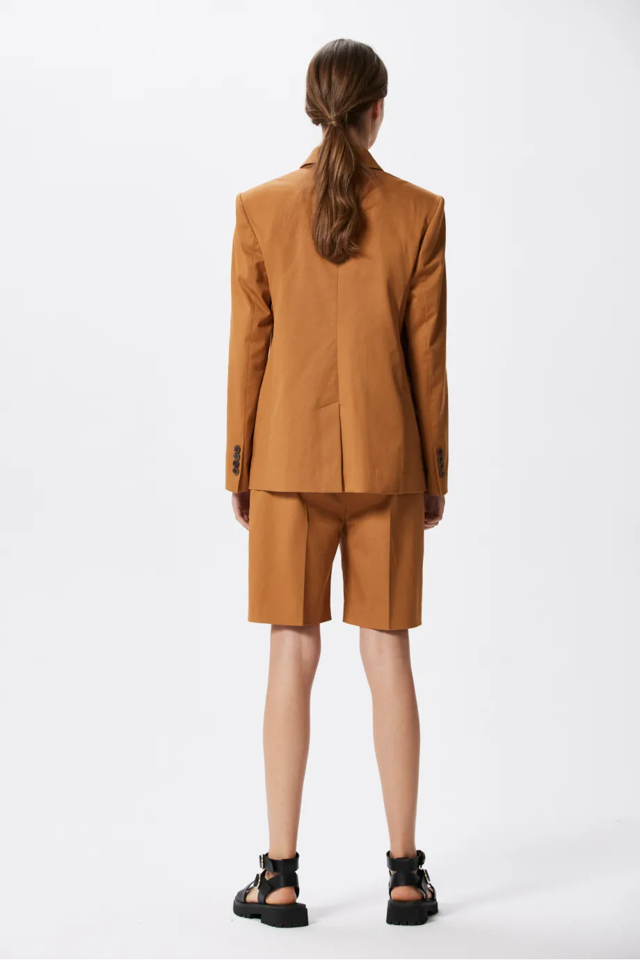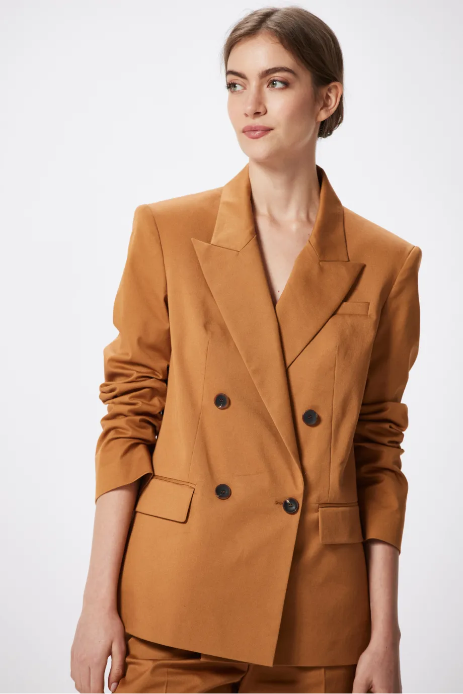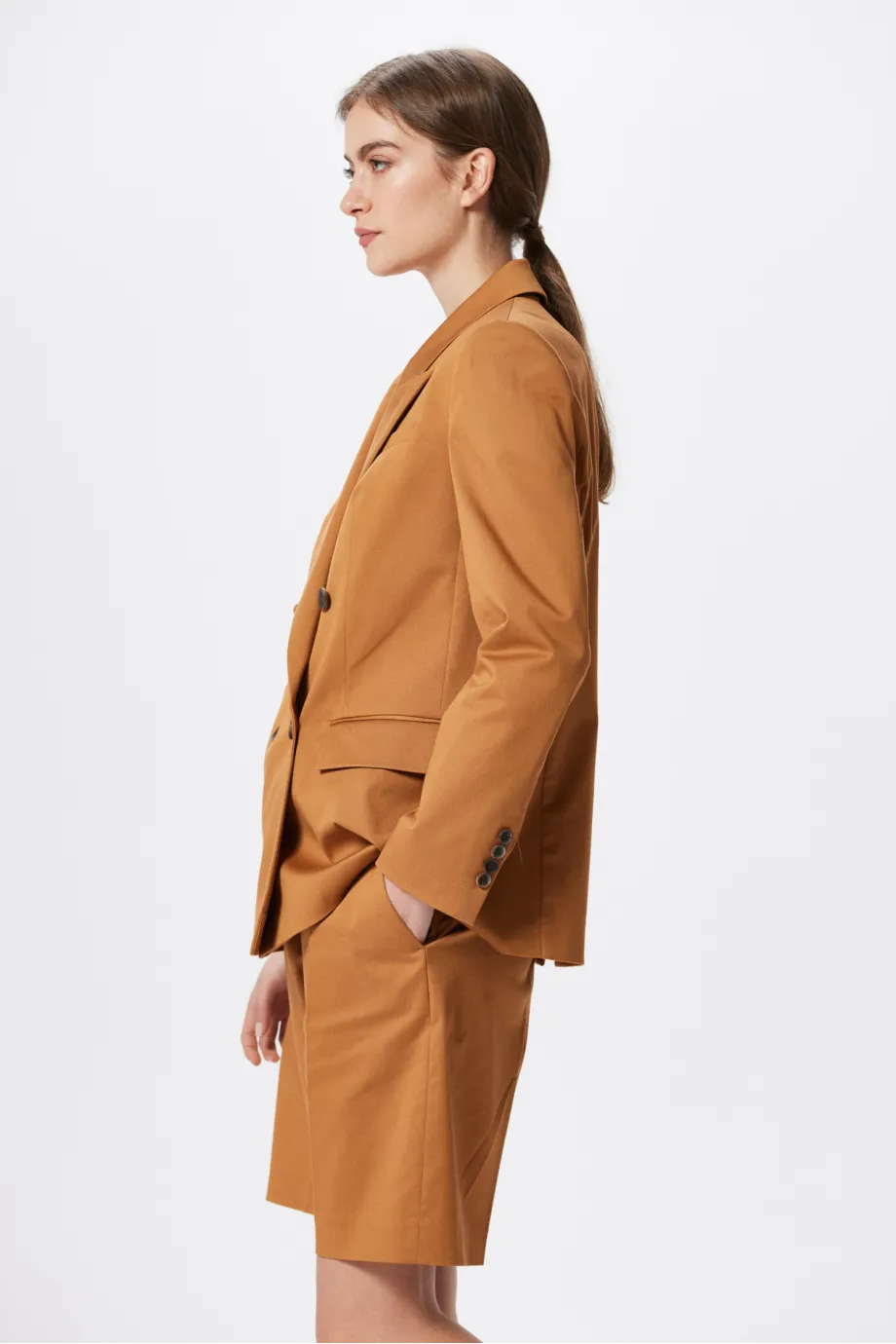 Co powiesz na prosty żakiet dwurzędowy z długim rękawem, zapinany na guziki wykonane z naturalnego rogu bawolego, a jednocześnie wyjątkowy ze względu na swój kolor? Dzięki półpodszewce i ozdobnemu pipingowi wewnątrz całość prezentuje się elegancko, a bawełniana tkanina z dodatkiem elastanu subtelnie modeluje sylwetkę, zachowując przy tym komfort noszenia. Żakiet możesz zestawić z eleganckimi szortami uszytymi z tej samej tkaniny, tworząc spójny i efektowny garnitur w nowoczesnym wydaniu.