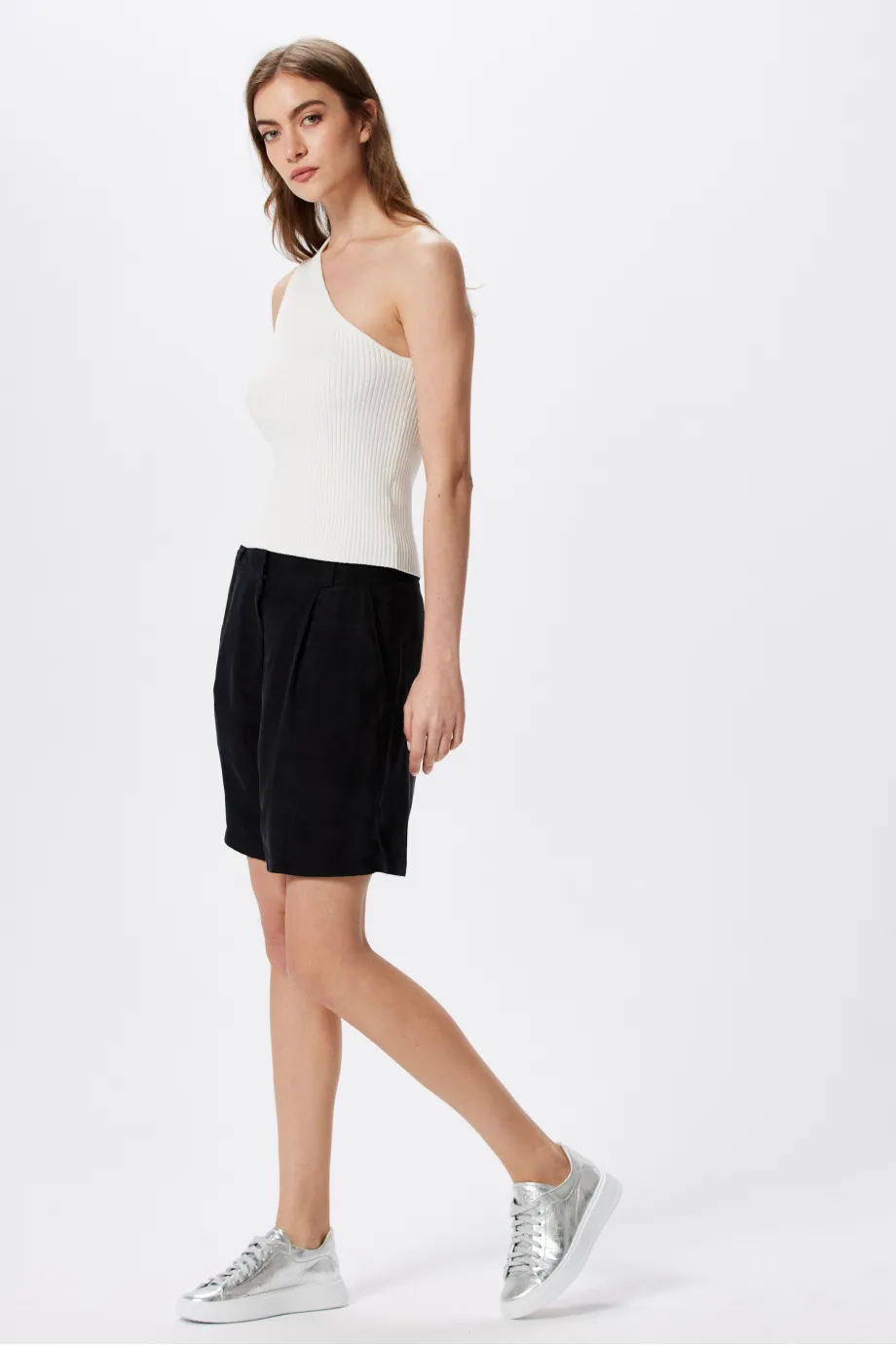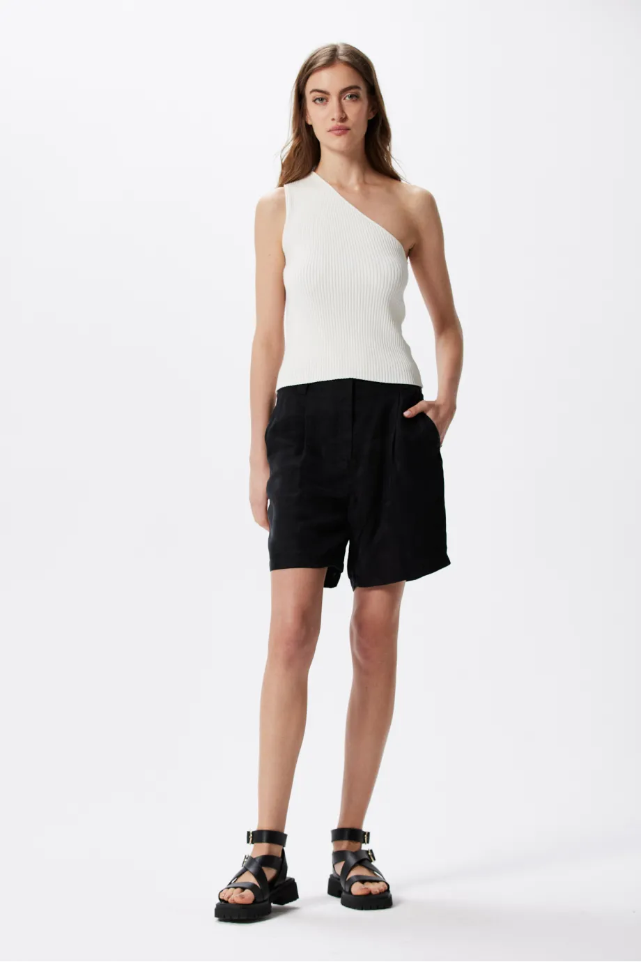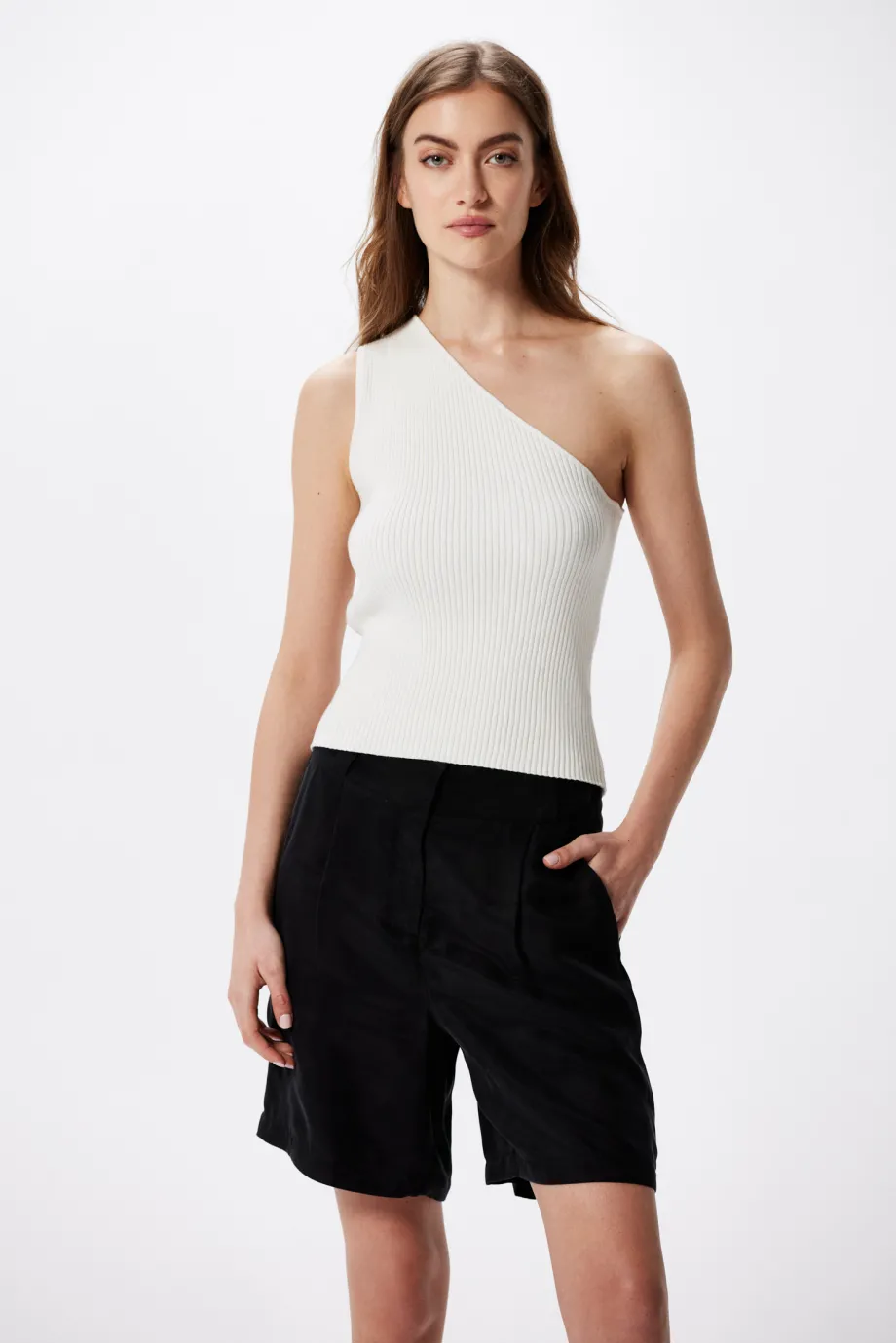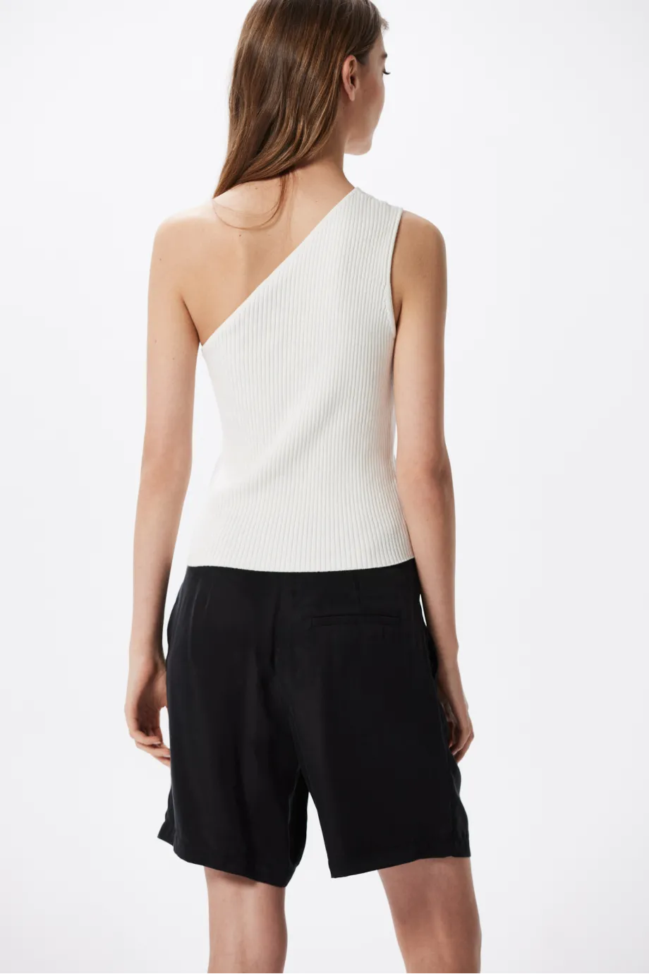 Jego największym atutem jest asymetryczny krój - top na jedno ramię, który pięknie eksponuje linię ramion i dodaje stylizacji wyrazistego charakteru. Dopasowany fason subtelnie podkreśla figurę, a dzianina wykonana w splocie rib 3x2 i na maszynie o uigleniu 12 GG nadaje całości wyjątkowej struktury. Biel tkaniny rozświetla cerę i wprowadza do stylizacji nutę nowoczesnej elegancji. To idealny wybór, gdy chcesz wyróżnić się klasą i prostą, ale efektowną formą. Doskonale prezentuje się zarówno w duecie z elegancką spódnicą midi i szpilkami, jak i w zestawie ze spodniami z wysokim stanem, tworząc minimalistyczny, a jednocześnie luksusowy look.