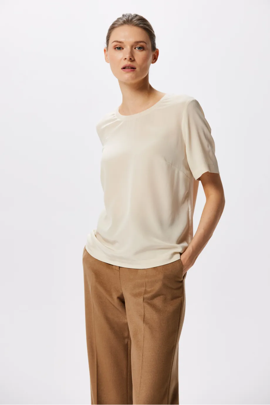 Jedwabna bluzka z krótkim rękawem to znany Ci już szykowny basic, który co sezon pojawia się w naszych kolekcjach w innej wersji kolorystycznej. Tym razem mamy dla Ciebie wariant ciepły beż, czyli odcień plasujący się gdzieś pomiędzy camelem a śmietaną. Beżowa Brigitte to elegancka bluzka pod żakiet, reprezentująca serię Classic Line. Ale jeśli zdecydujesz się założyć ją do jeansów, będziesz naprawdę zaskoczona efektem! Wpleć ekskluzywny choć prosty w formie element do swoich codziennych strojów i poczuj dotyk prawdziwego luksusu na swojej skórze!