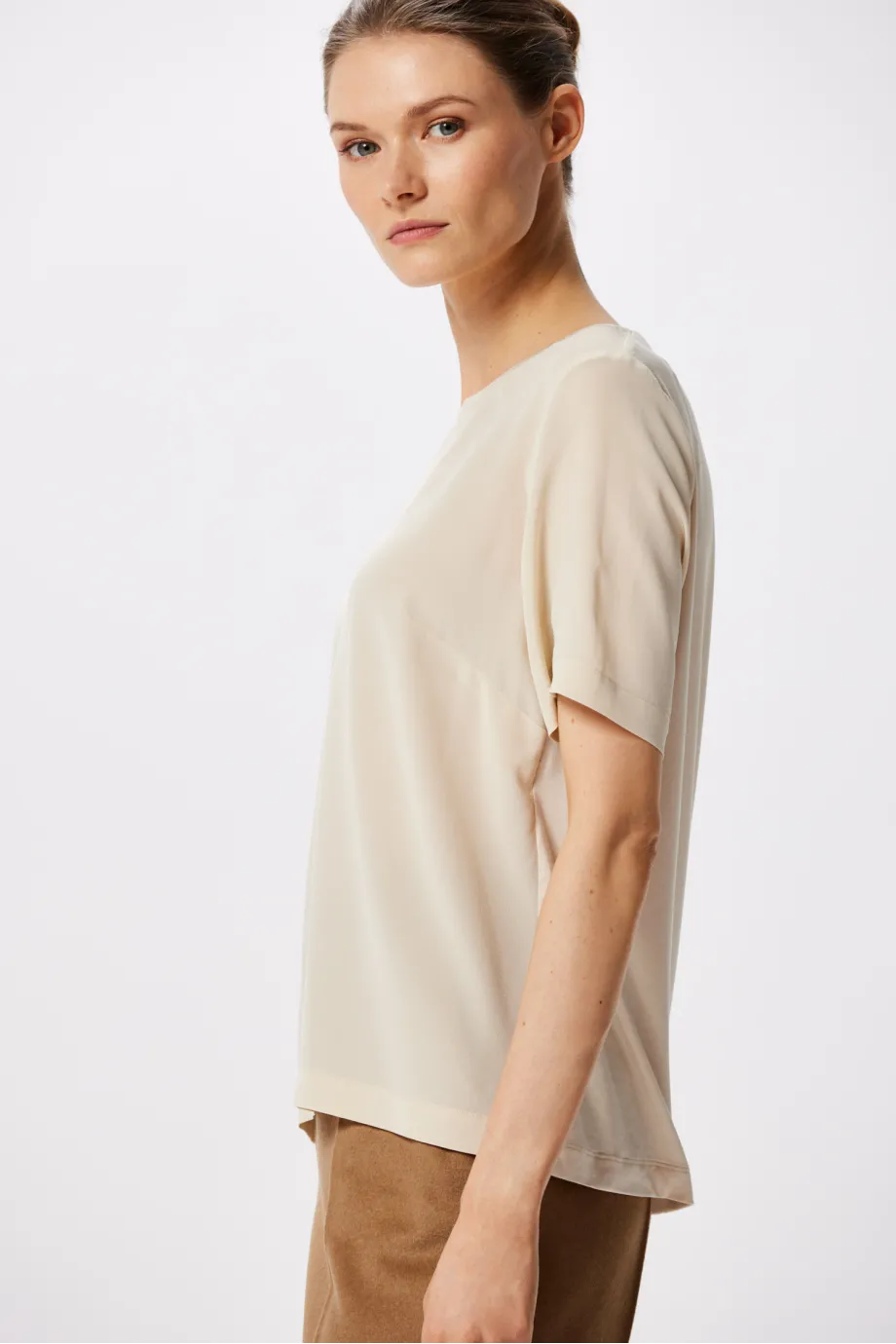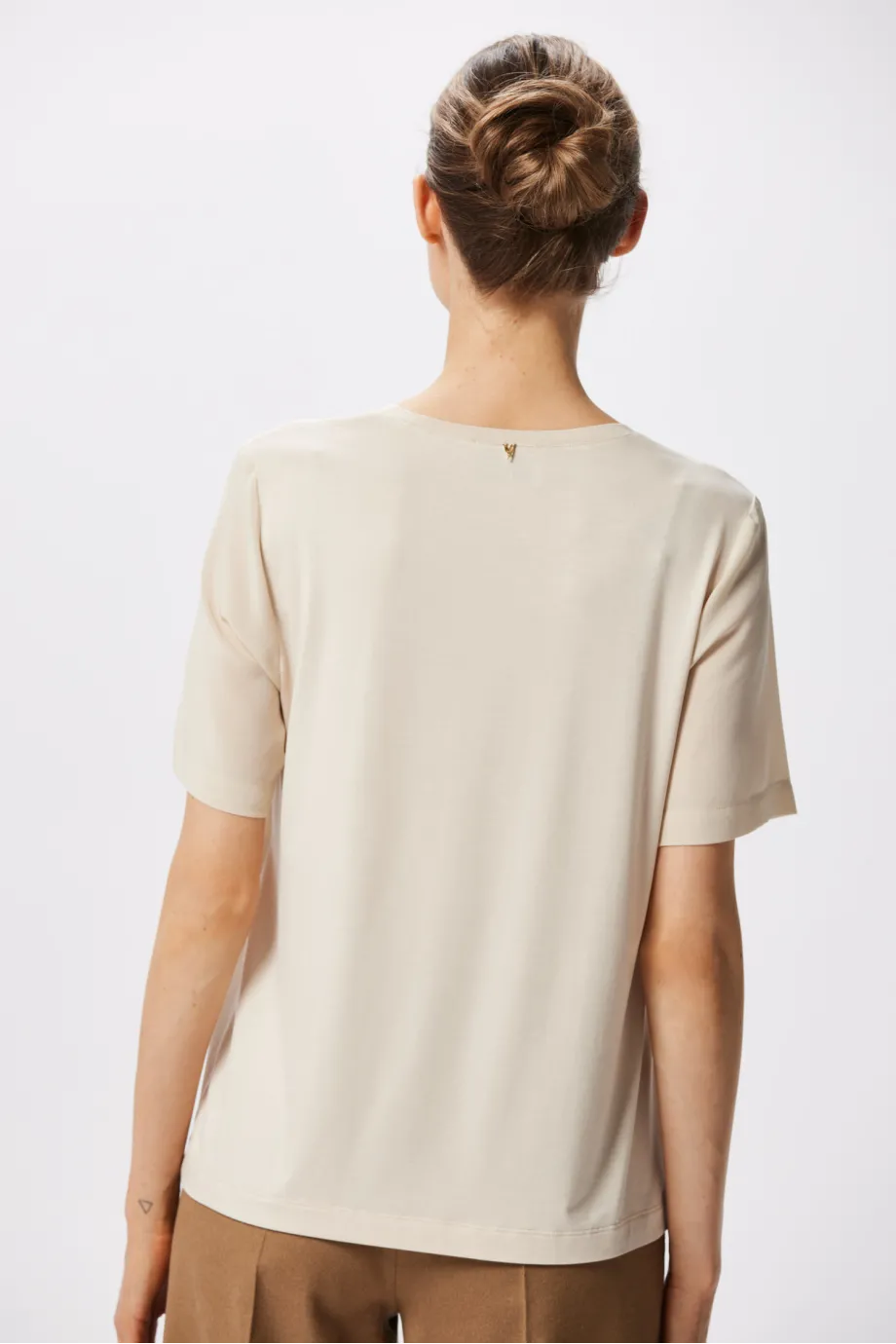 Bluzka z okrągłym dekoltem Patrizia Aryton jest bardziej wszechstronna niż myślisz. Zastąpisz nią biurową koszulę, koktajlowy model do wieczorowej spódnicy, ale też swobodny t-shirt. Jak to możliwe? Wszystko zawdzięczamy jej plastycznemu, ale eleganckiemu krojowi, tkaninie o ultragładkiej powierzchni oraz ponadczasowej i twarzowej barwie. Luźny krój, krótki rękaw i okrągły dekolt gwarantują niezrównaną wygodę. Oddychający, sprawiający wrażenie chłodnego i lekko śliski materiał jest jak druga skóra. A jasny ciepły beż ma moc rozświetlania.
