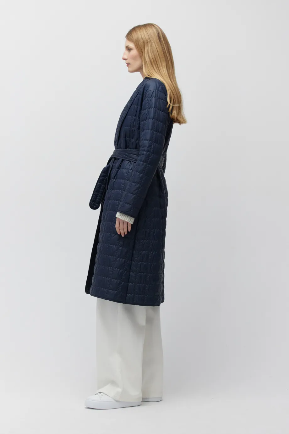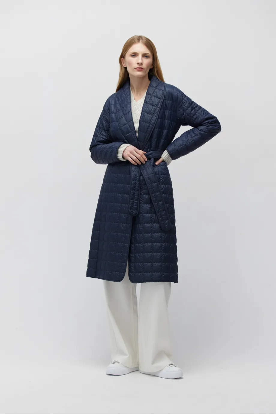 Odwracamy role! Wełna w środek, a pikowana tkanina na zewnątrz - co Ty na to? Będzie ciepło, nieco outdoorowo, ale wciąż bardzo elegancko i kobieco! Przed Tobą długa lekka kurtka puchowa w kolorze granatu - must have nadchodzącej jesieni i zimy! Noś ją do zestawów casualowych i smart casualowych, na co dzień i weekendowe wypady!