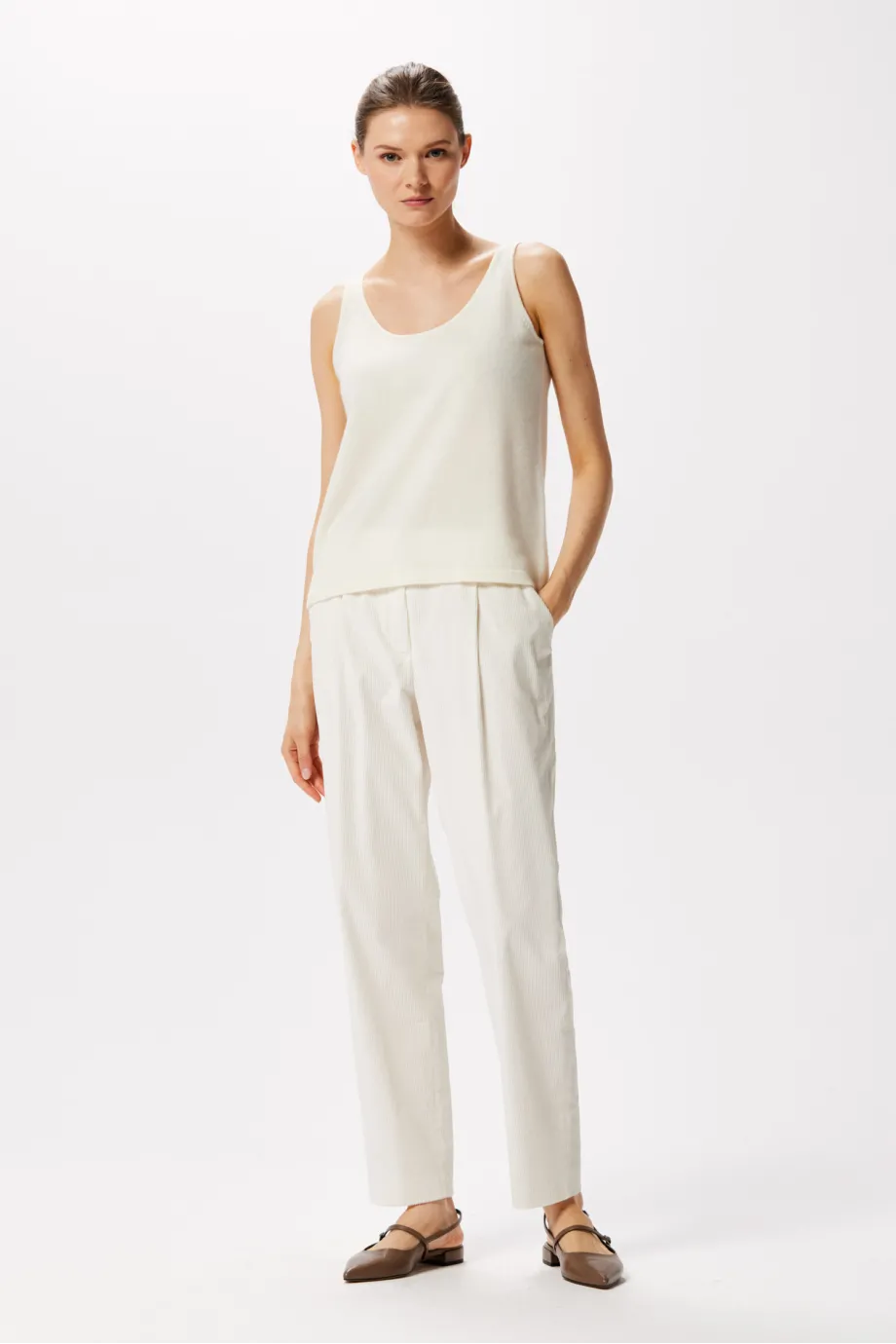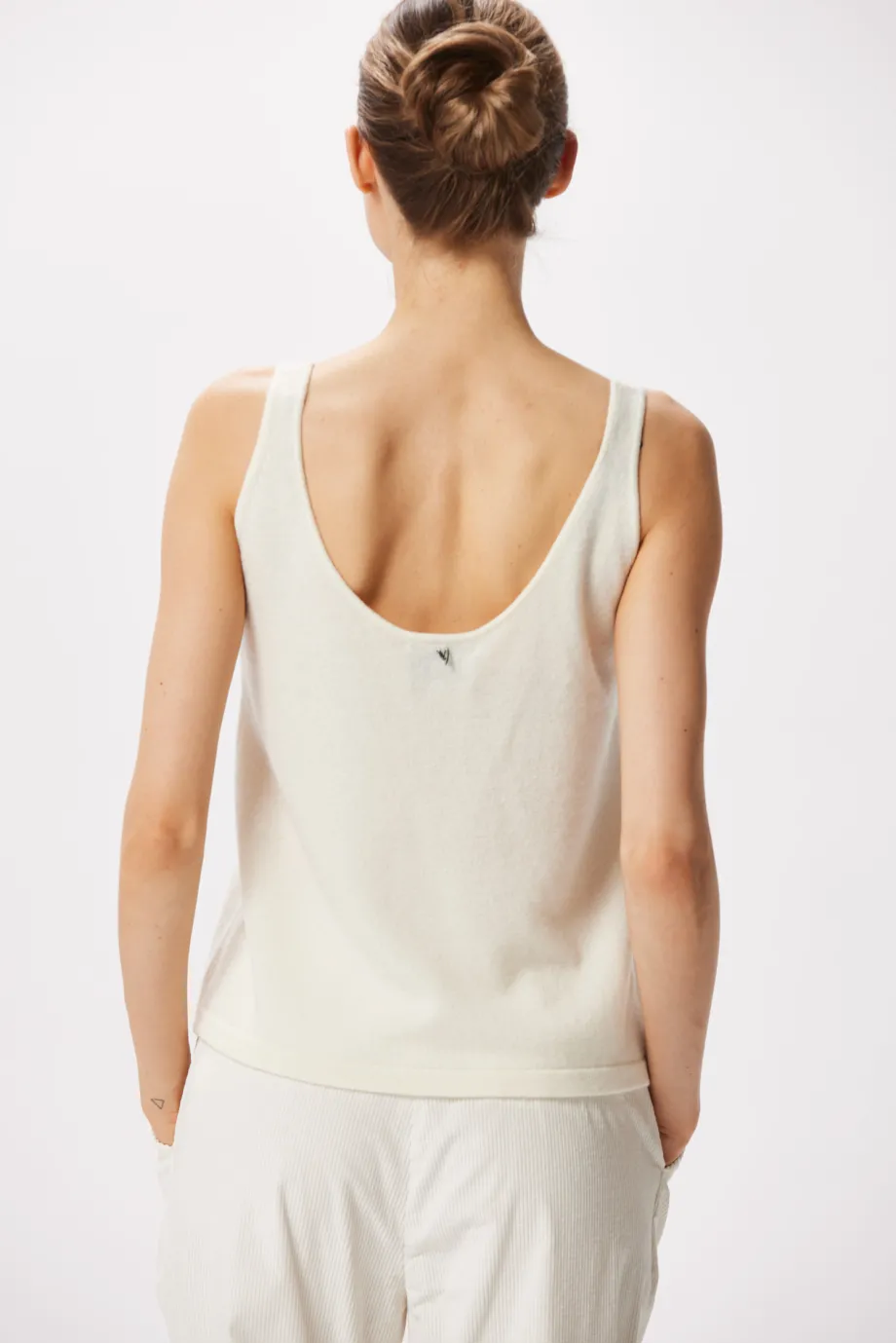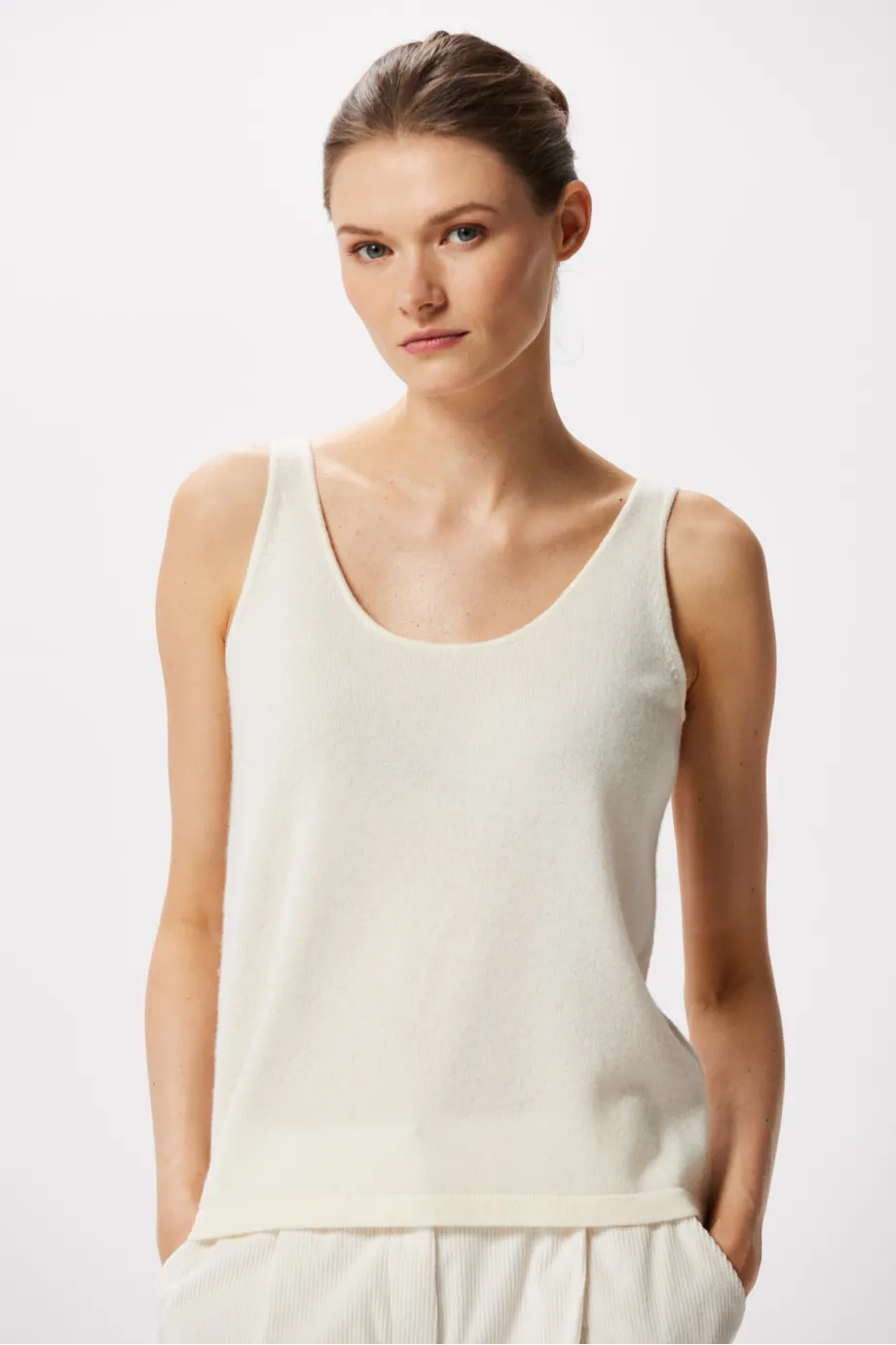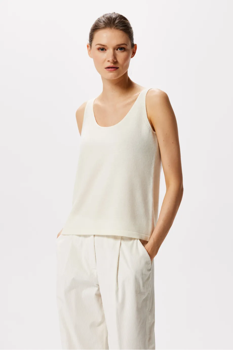 Elegancki biały top na ramiączkach to jedna z naszych propozycji, oferująca nie tylko minimalistyczny design, ale przede wszystkim niezrównany komfort noszenia. Miękka, otulająca dzianina o precyzyjnym splocie single jersey sprawia, że nasz top z kaszmirem idealnie układa się na ciele, podkreślając sylwetkę z zachowaniem lekkości i naturalnej swobody ruchów. To baza garderoby, którą pokochasz za jej uniwersalność i szlachetne wykończenie – doskonała zarówno pod elegancki garnitur, jak i noszona solo w zestawie z jedwabnymi spodniami czy kaszmirowym kardiganem.