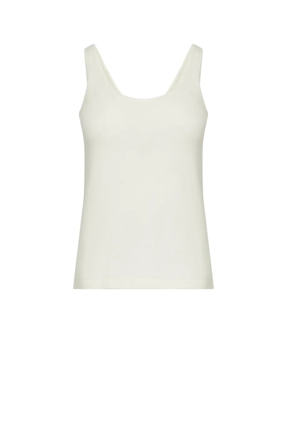 Biały top na szerokich ramiączkach w ponadczasowym śmietankowym odcieniu, wprowadza do stylizacji świeżość i niewymuszoną elegancję. Top został zaprojektowany z myślą o maksymalnym komforcie i funkcjonalności – szerokie ramiączka zapewniają idealne proporcje, a subtelnie zaokrąglony dekolt z przodu i z tyłu dodaje mu wyrafinowanego charakteru. Krój blisko ciała pięknie podkreśla linię ramion i dekoltu, nie tracąc przy tym na wygodzie i miękkości.
