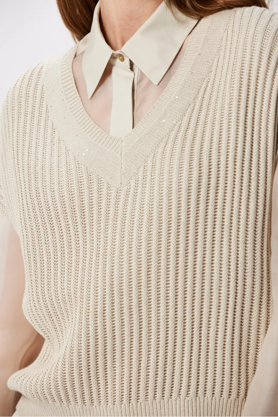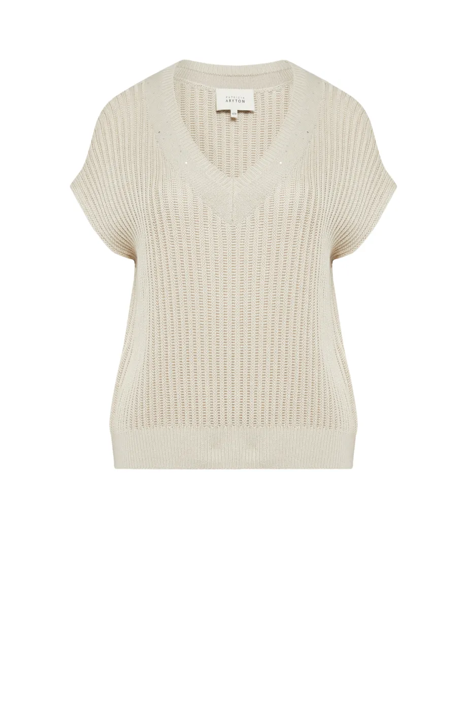 Luźna bluzka damska w odcieniu jasnego chłodnego beżu wyróżnia się oryginalnym splotem dzianiny, która powstała na maszynie o uigleniu 7GG. Wysmuklający optycznie dekolt w szpic ozdobiono lśniącymi drobinkami, a dół ubrania wykończono ściągaczem. Beżowa bluzka damska, elegancka i bardzo wygodna, świetnie prezentuje się w mono- i total lookach, a jeśli outfit z jej udziałem wzbogacisz o występującą linearnie czerń, stworzysz zmiękczoną, bardzo modną obecnie wersję stylizacji black&white.