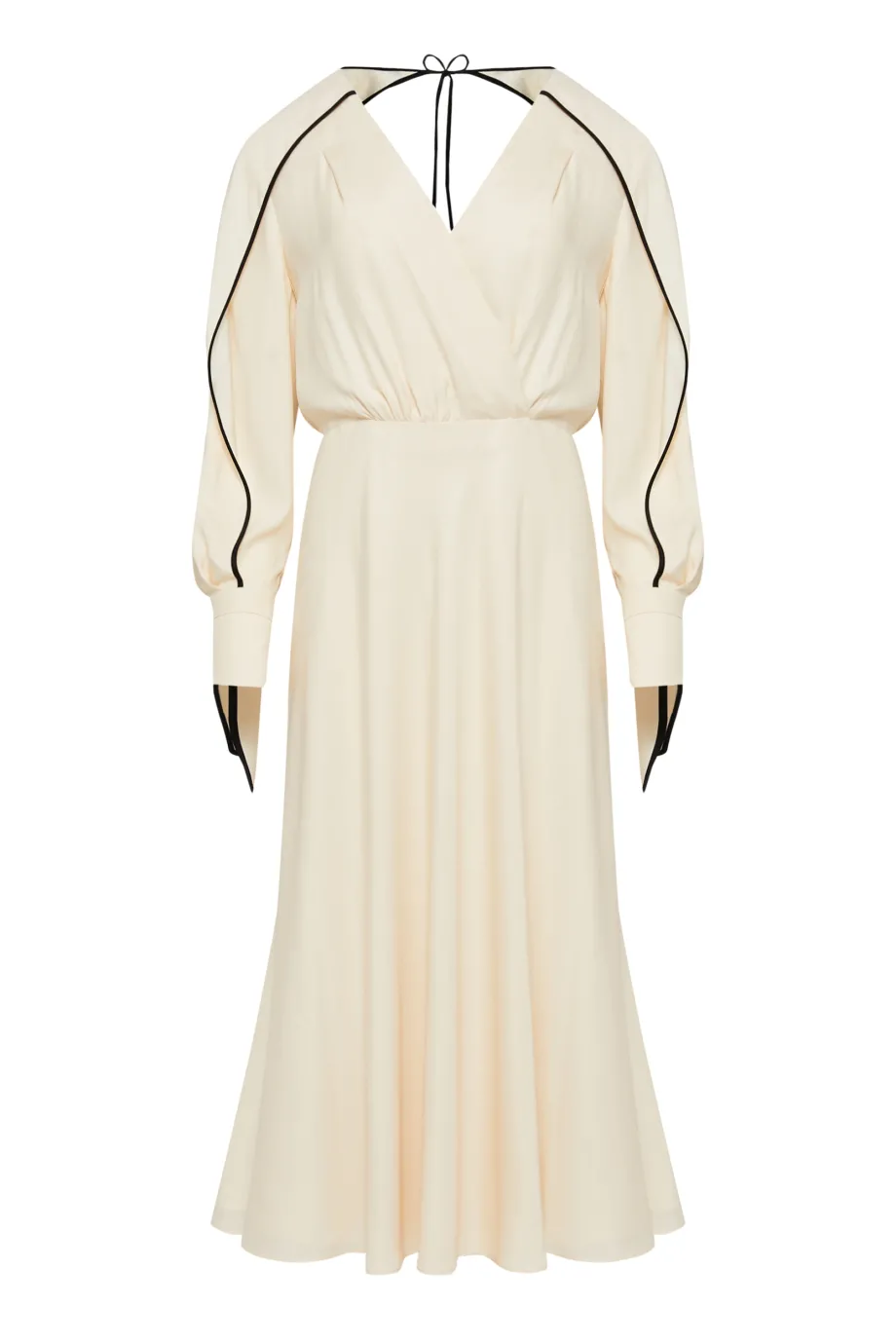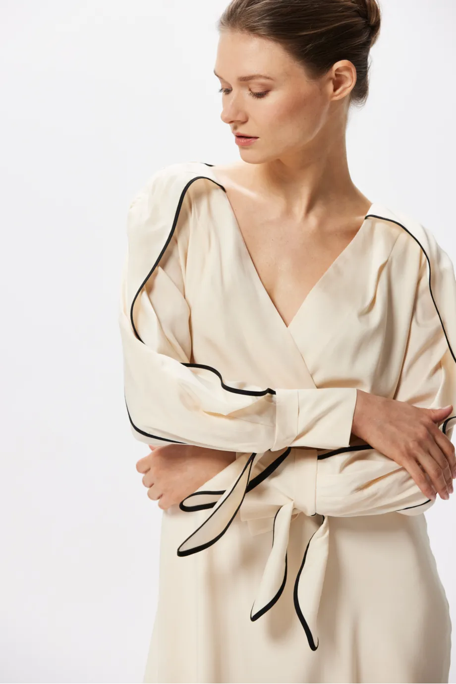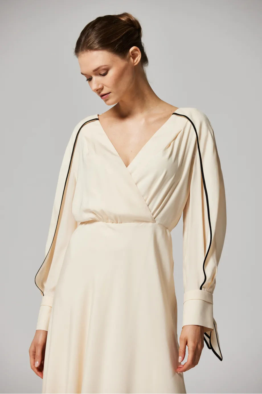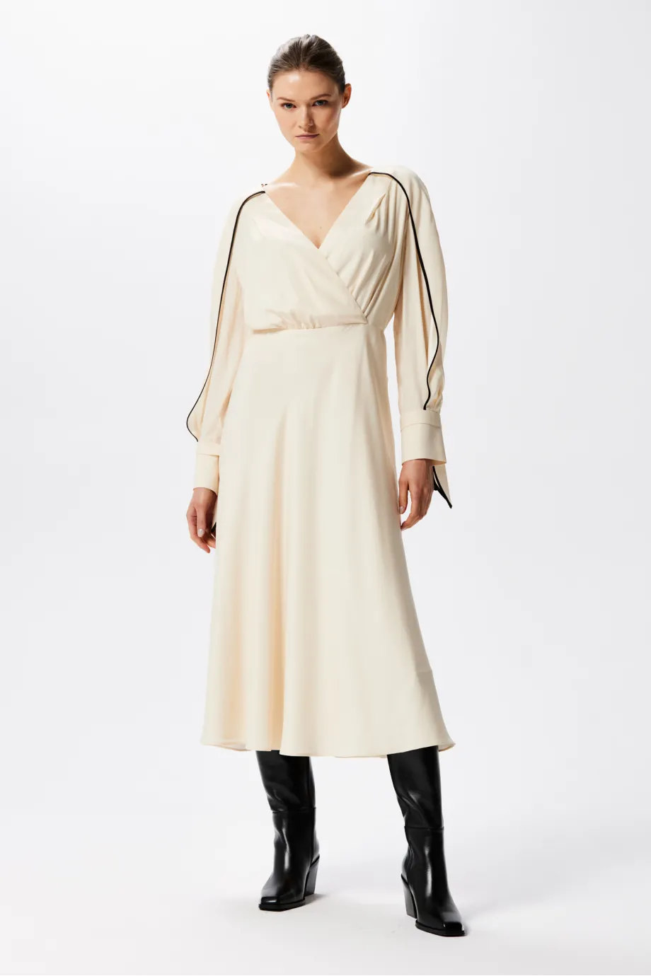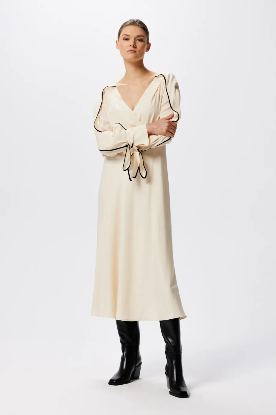 Ta jedwabna sukienka podkreślająca talię ma bardzo sensualny, kopertowy dekolt. Rękawy są długie i swobodne, zakończone mankietami z wiązaniem i drobnym guziczkiem. Delikatnie rozkloszowany dół pięknie pracuje w ruchu, a uniwersalna długość midi zapewnia swobodę i wydłuża optycznie sylwetkę.